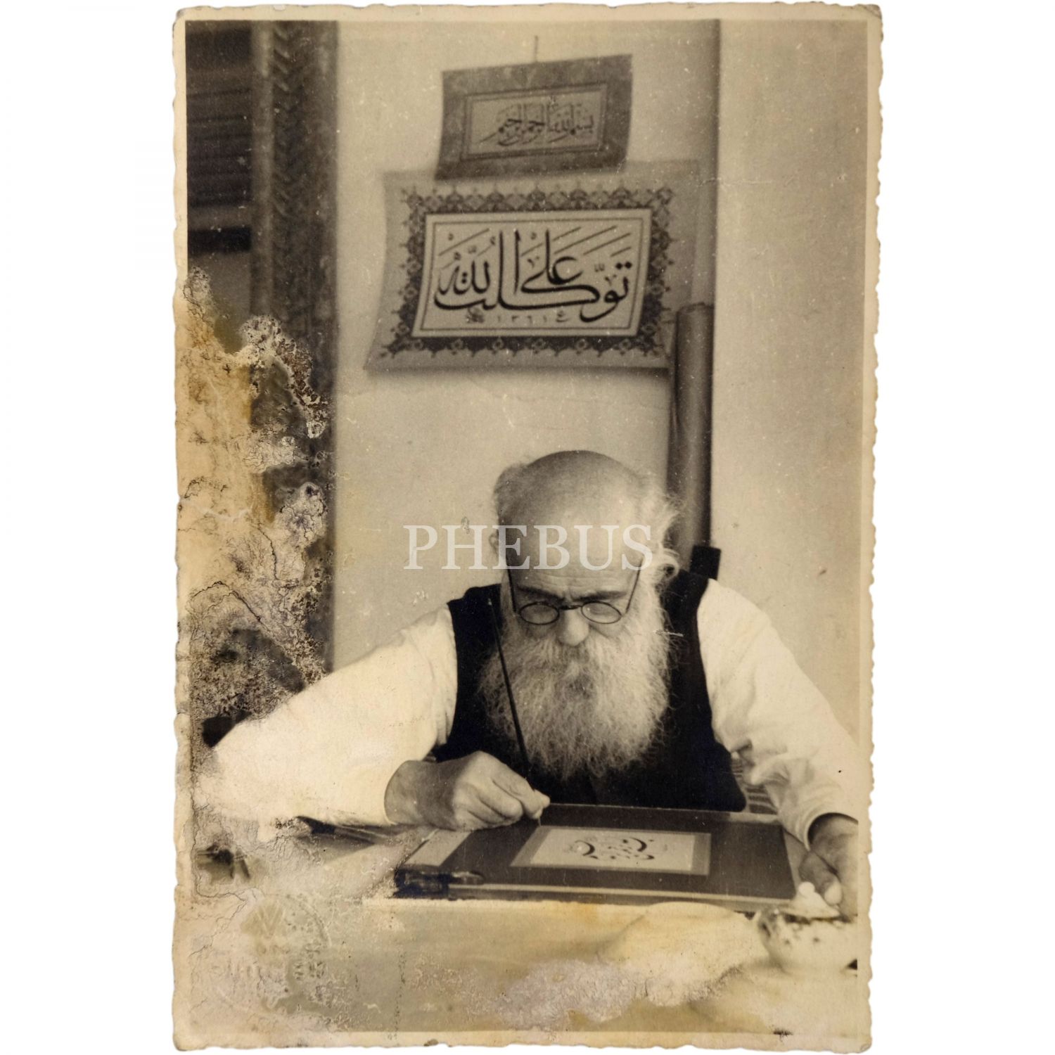 İsmail Hakkı Altunbezer bir yazıyı tezhiplerken, Foto Şimşek (Bebek), 12x17 cm...