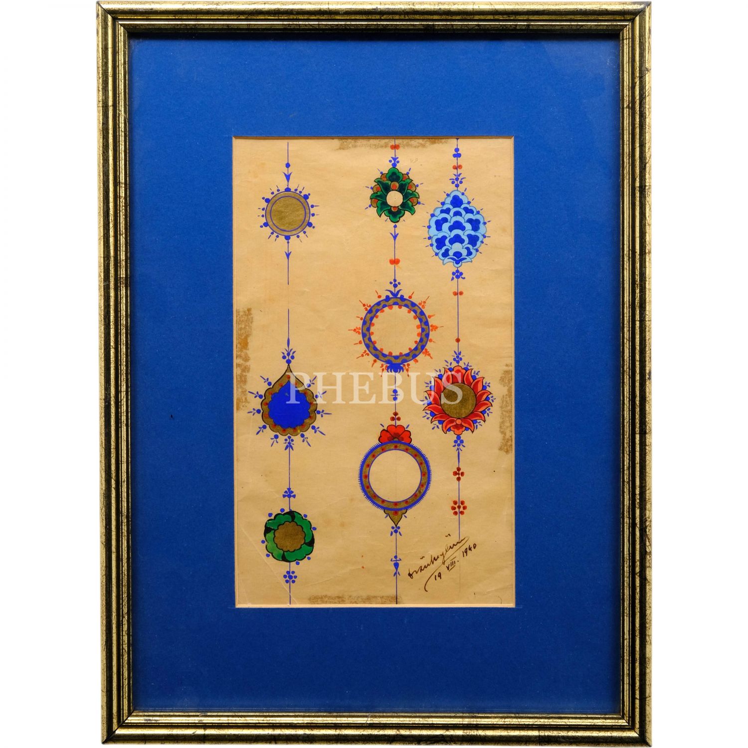 Süheyl Ünver imzalı tezhipli hizip gülü çalışmaları, 1940 tarihli, kağıt ölçü: 13x22 cm, çerçeve içi paspartu: 23x31 cm...