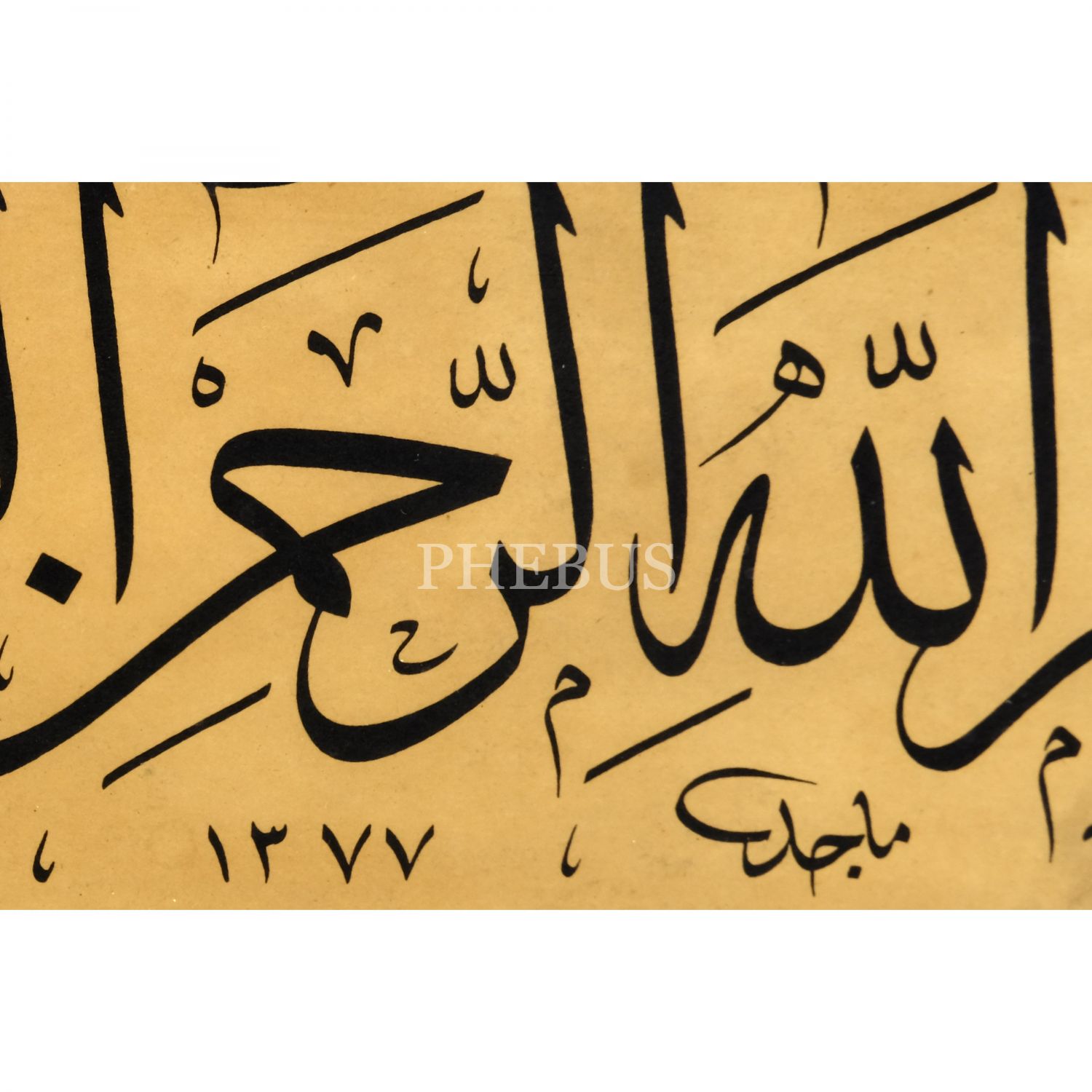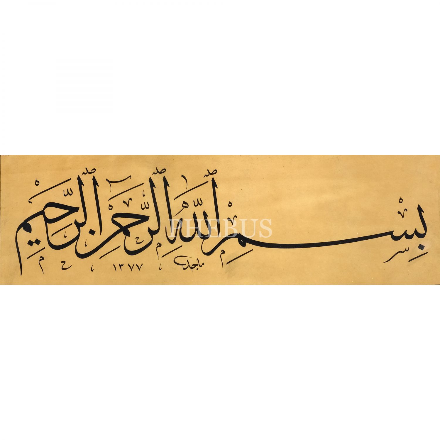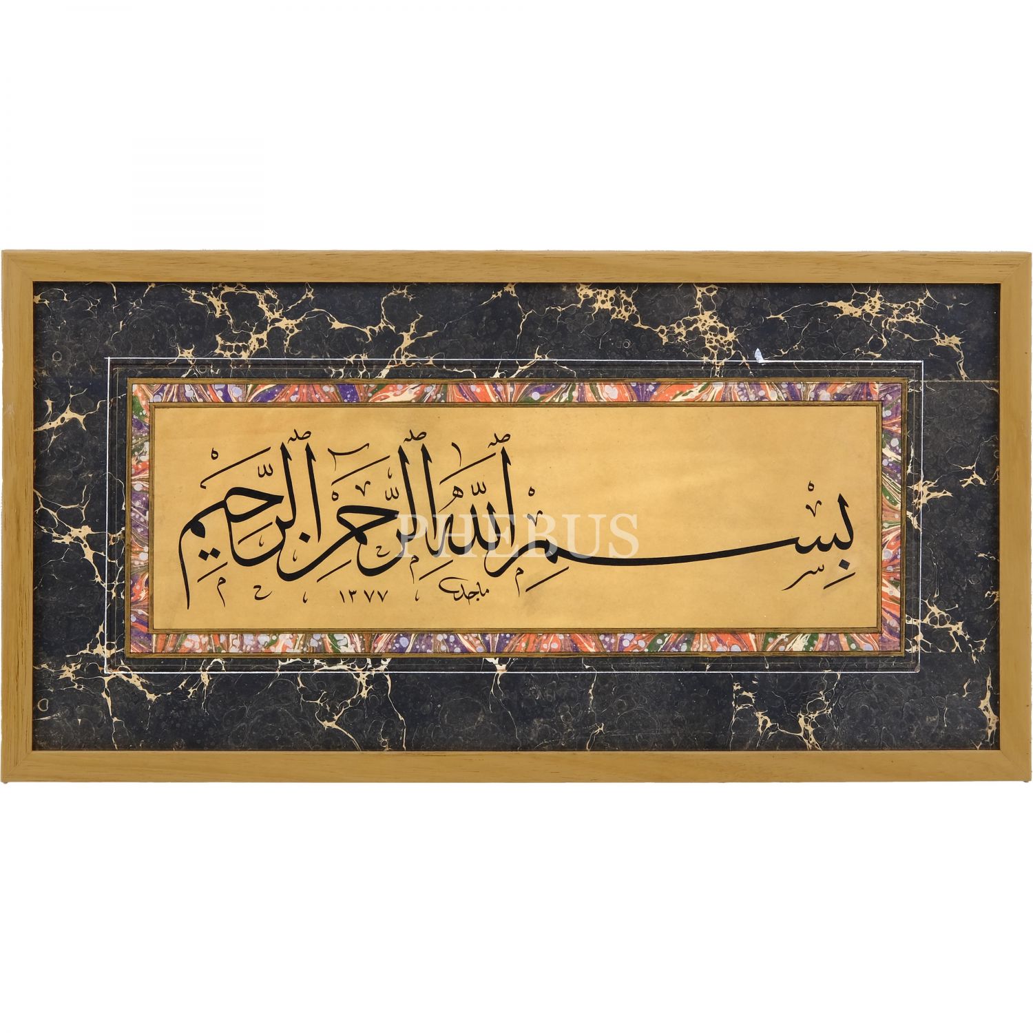 Mâcid (Ayral) ketebeli sülüs oklu besmele, 1377 tarihli, yazı ölçü: 35x11 cm, çerçeve içi ölçü: 47x23 cm...
