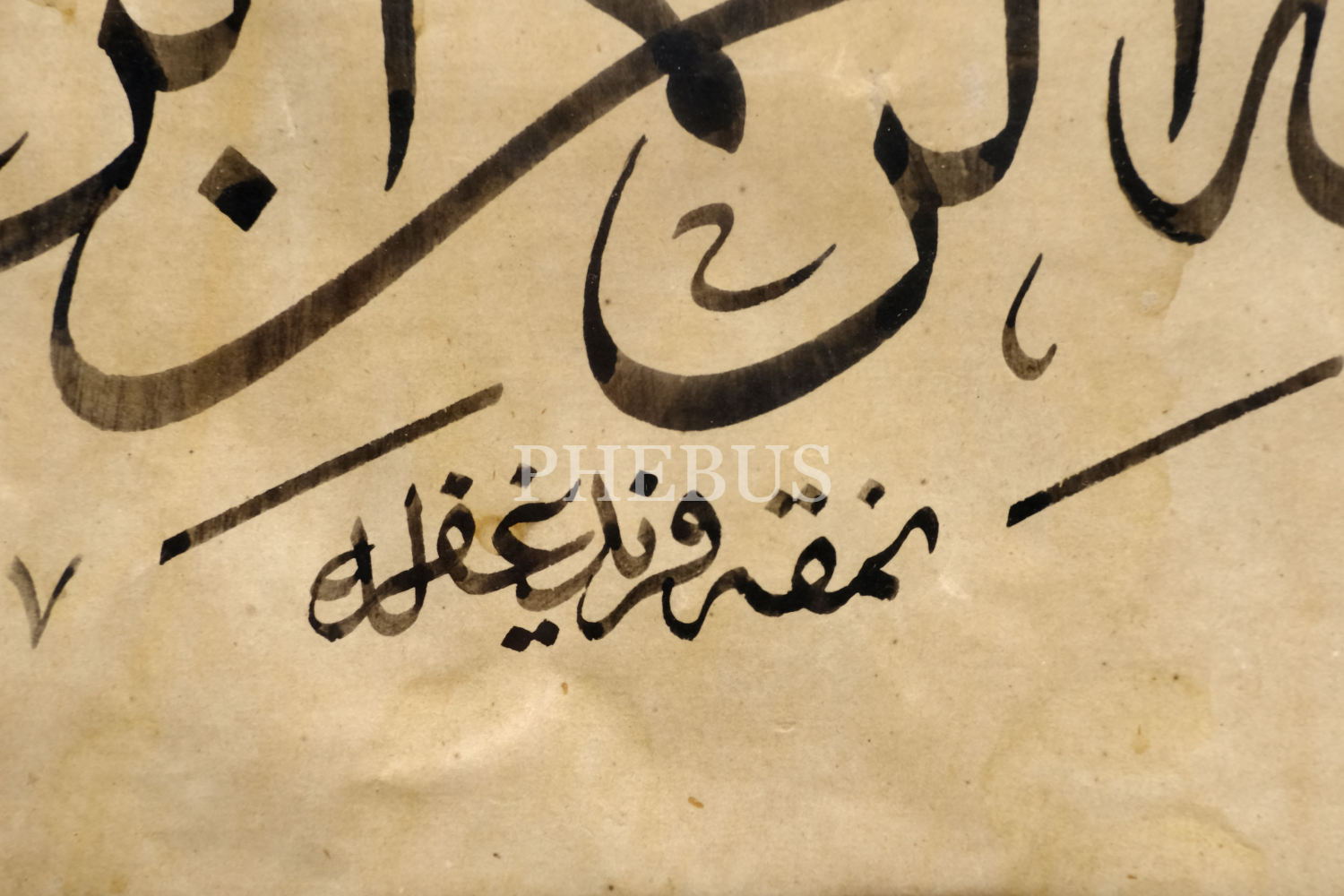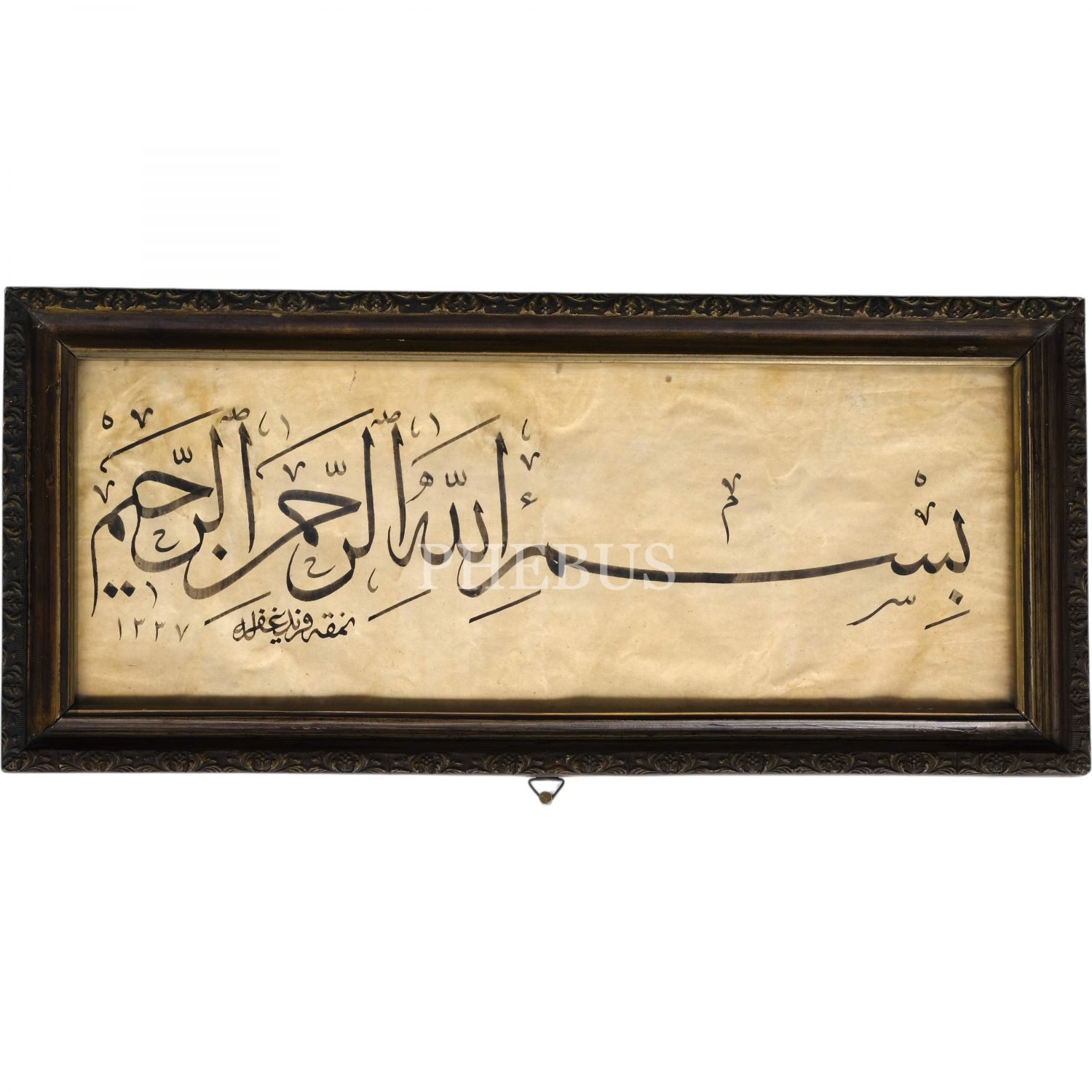 Ferid Bey ketebeli sülüs oklu besmele, hicri 1337 tarihli, çerçeve içi ölçü: 44x16 cm...