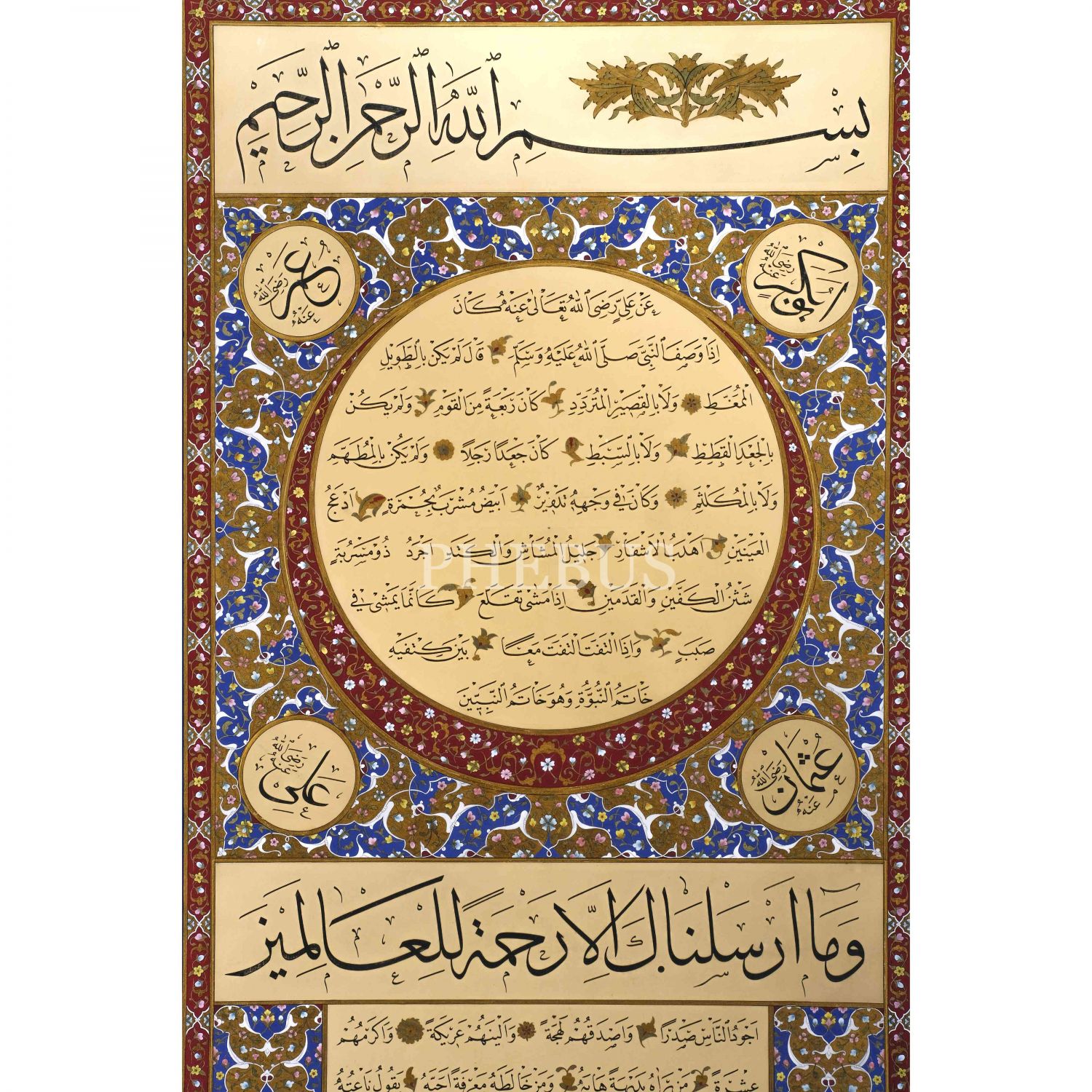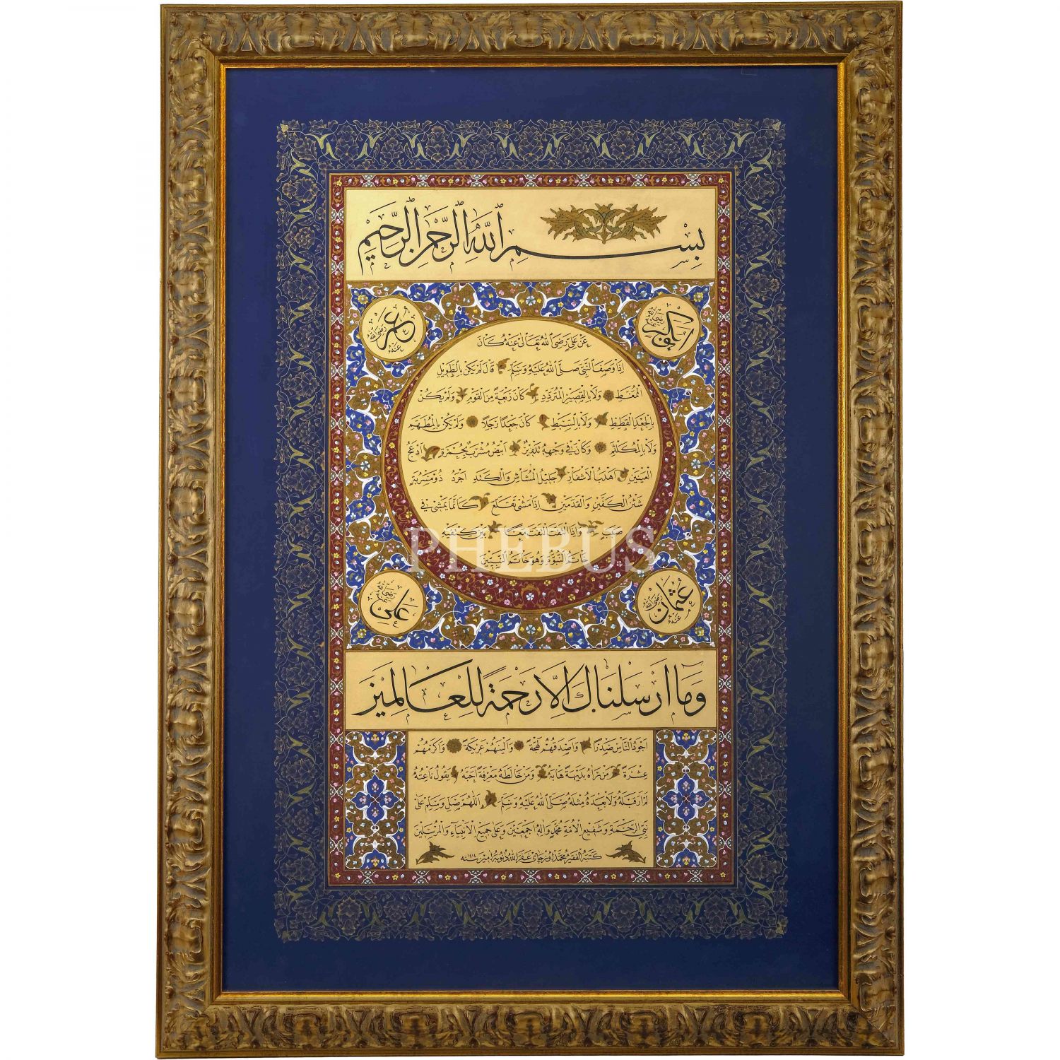 Mehmed Özçay ketebeli sülüs-nesih hilye-i şerife, 1414 tarihli, tezhibi Semih İrteş-Mamure Öz imzalı ve 1995 tarihli, çerçeve içi ölçü: 75x114, çerçeve kalınlığı: 8 cm...