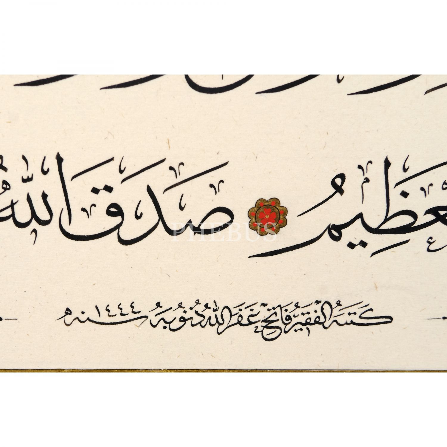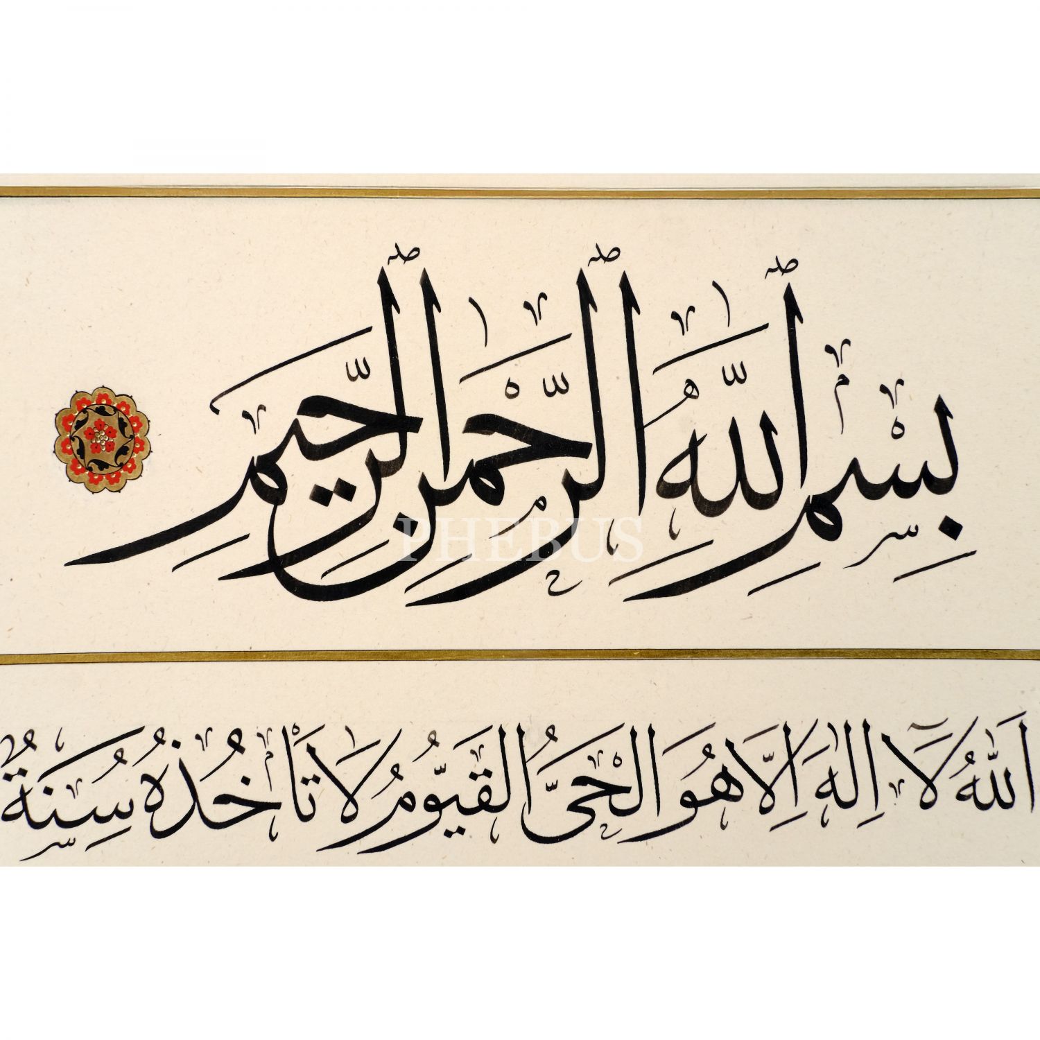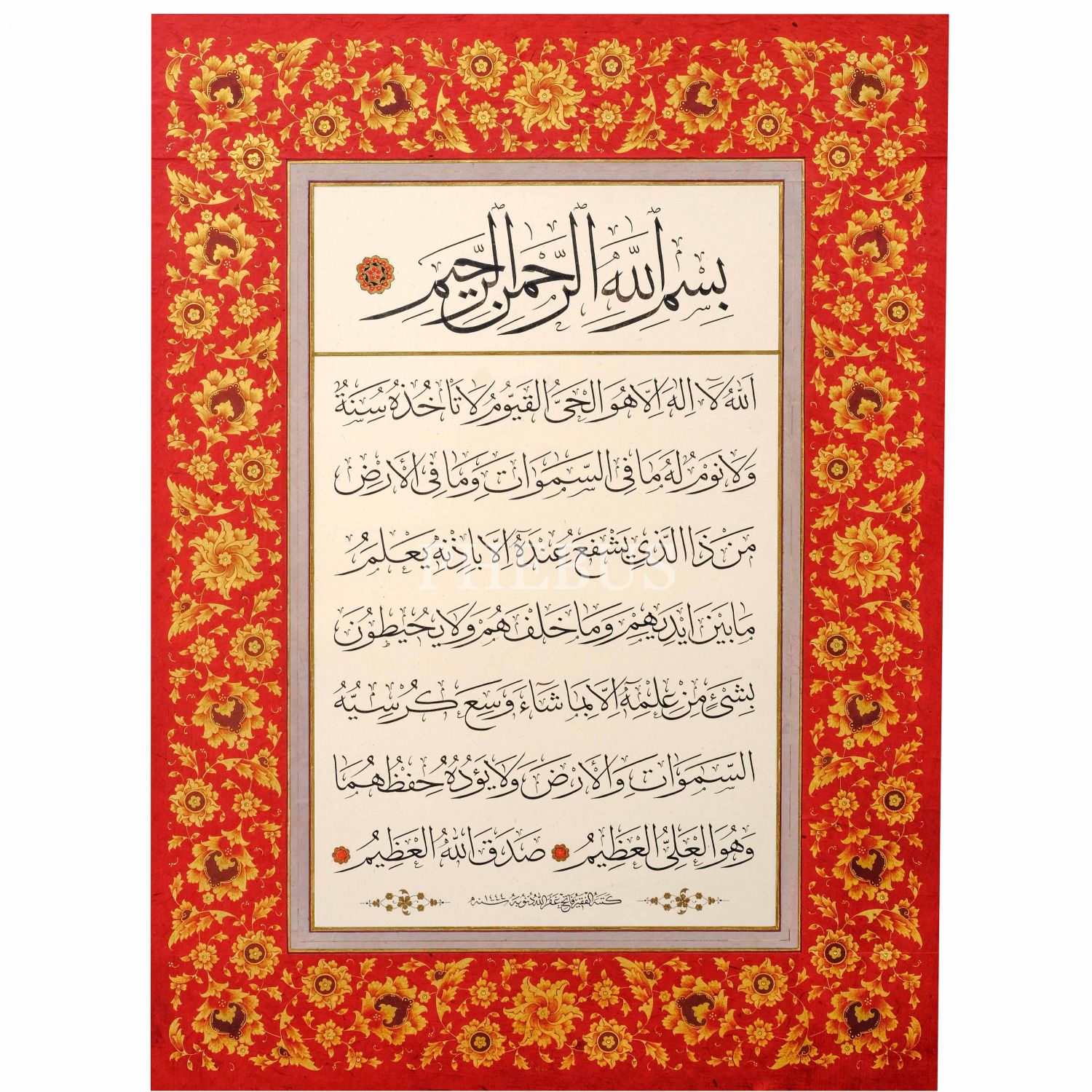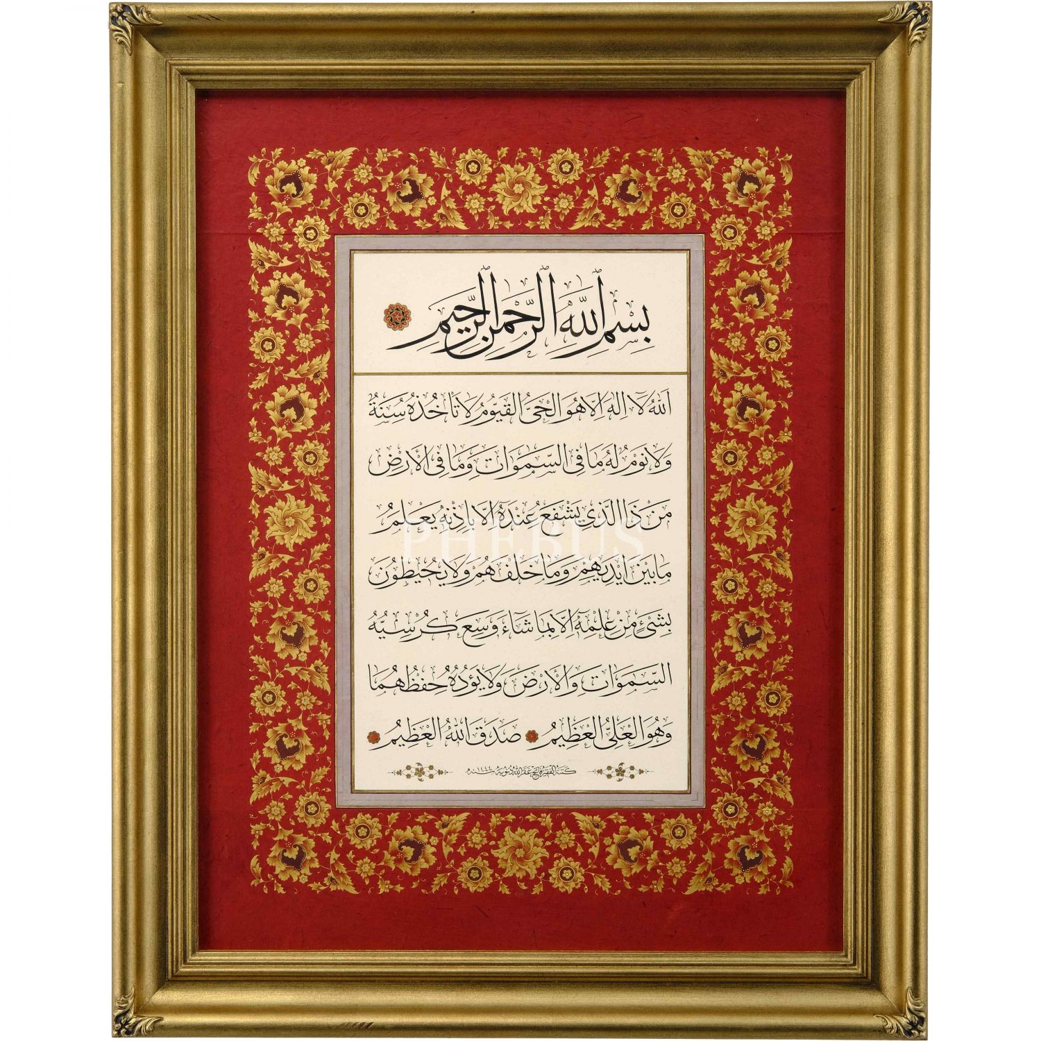 Fatih (Özkafa) ketebeli sülüs âyetelkürsî, 1444 tarihli, tezhibi Gül imzalı, yazı ölçü: 25x40 cm, çerçeve içi ölü: 49x65 cm...