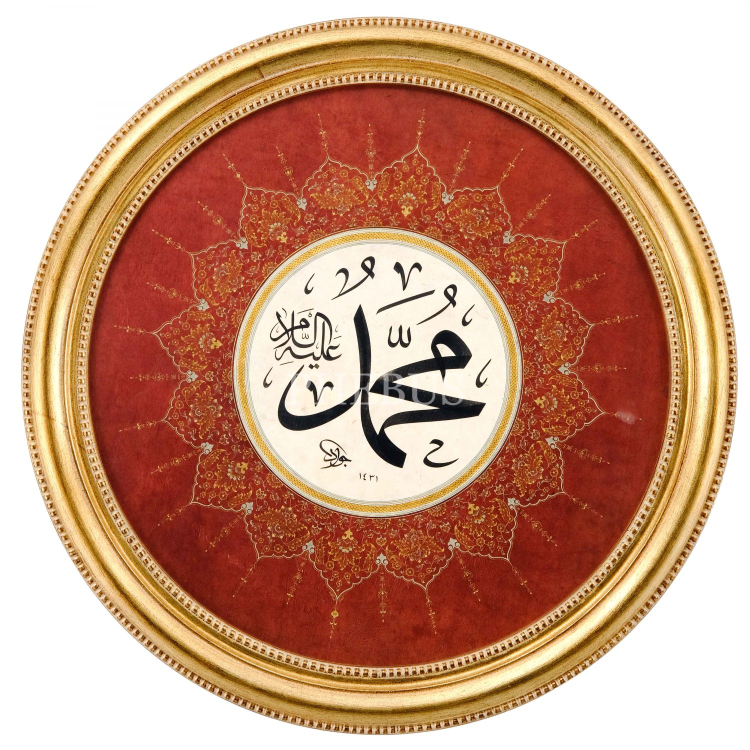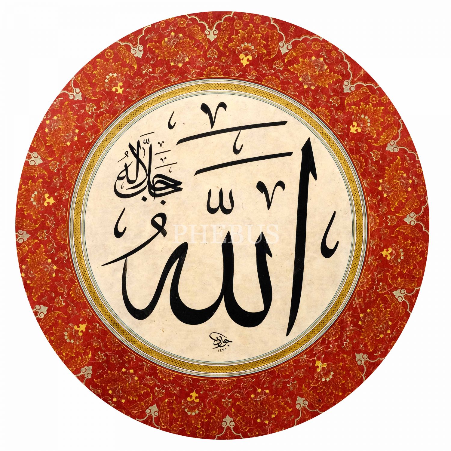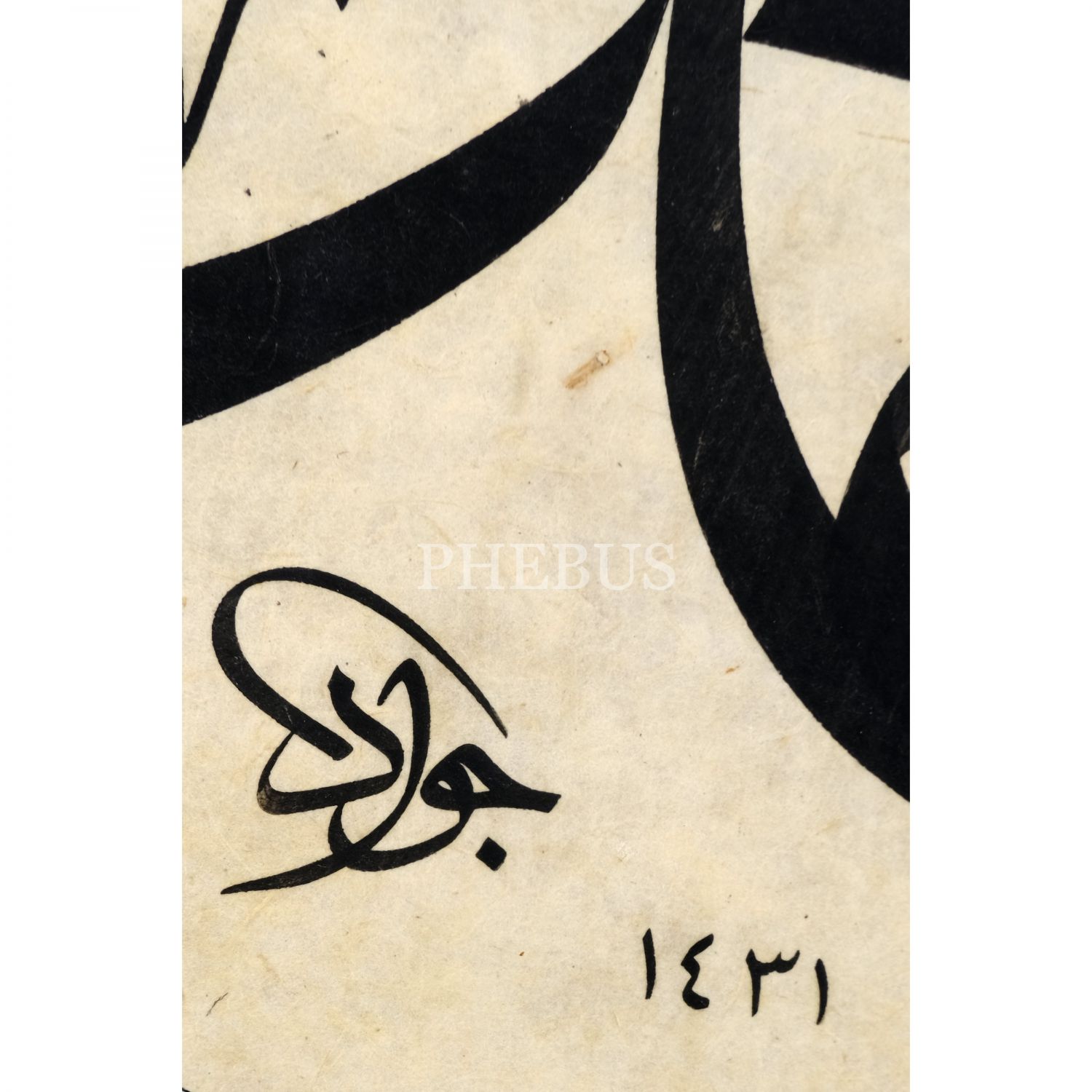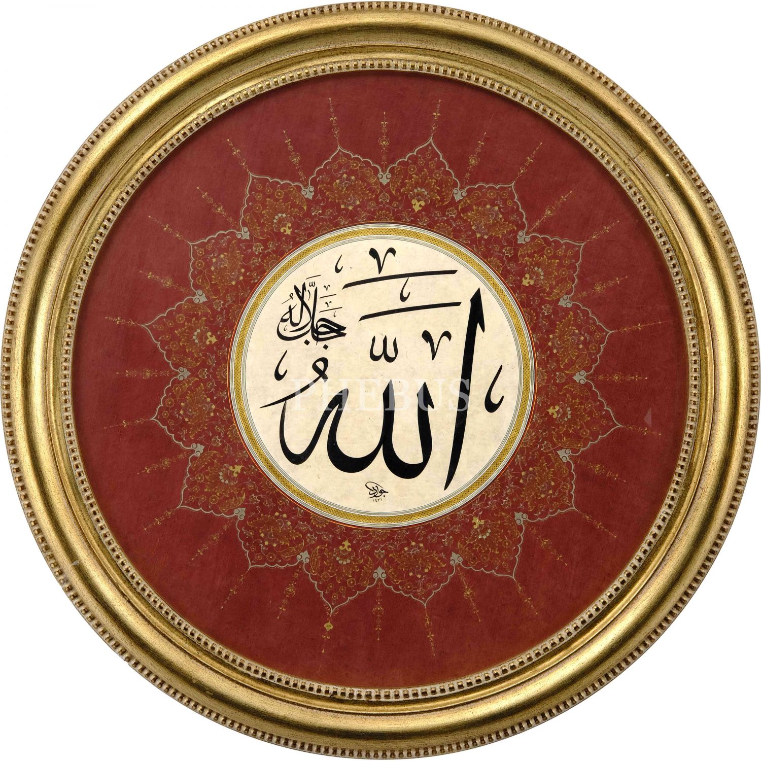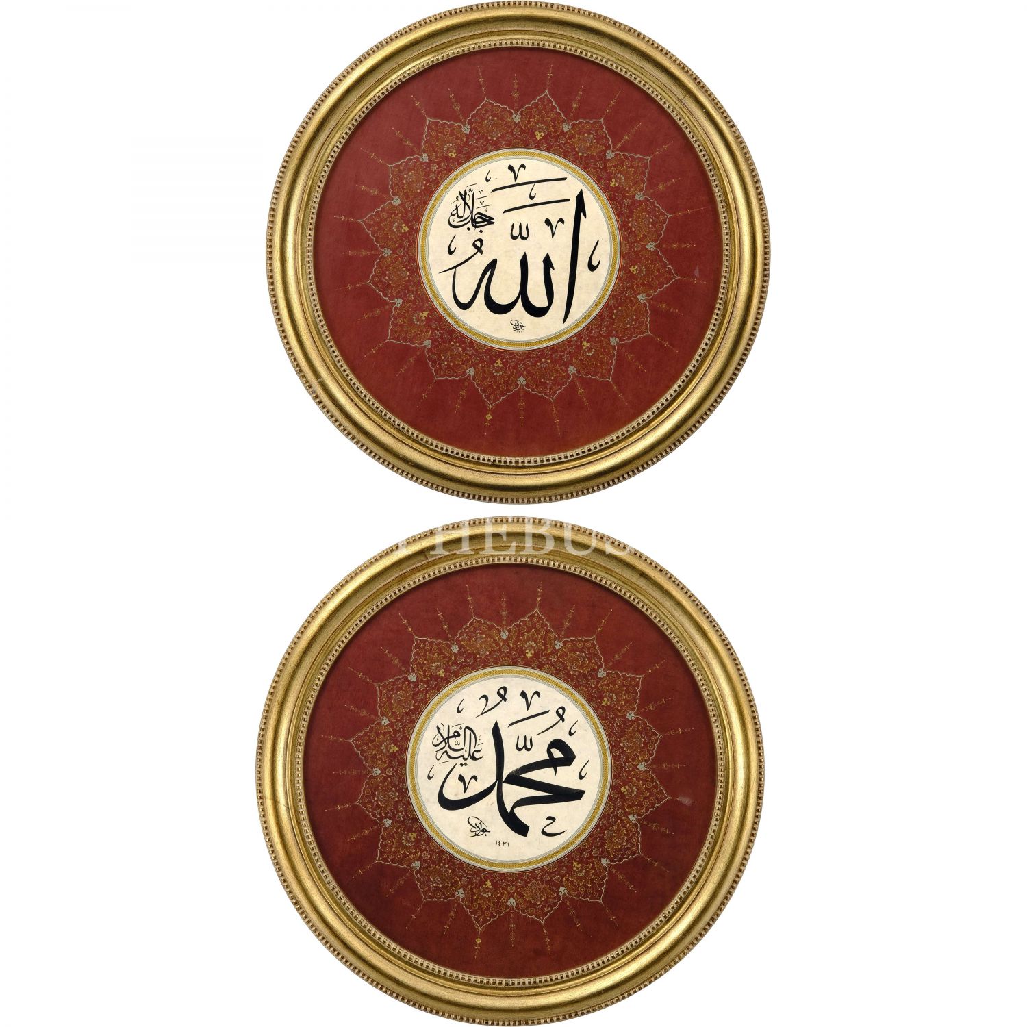 Cevad (Huran) ketebeli iki adet celî sülüs levha, Lafzatullah ve İsm-i Nebî, 1431 tarihli, tezhipleri Asuman Coşkun imzalı ve 1431 tarihli, yazı çapı: 26 cm, çerçeve içi çap: 60 cm...
