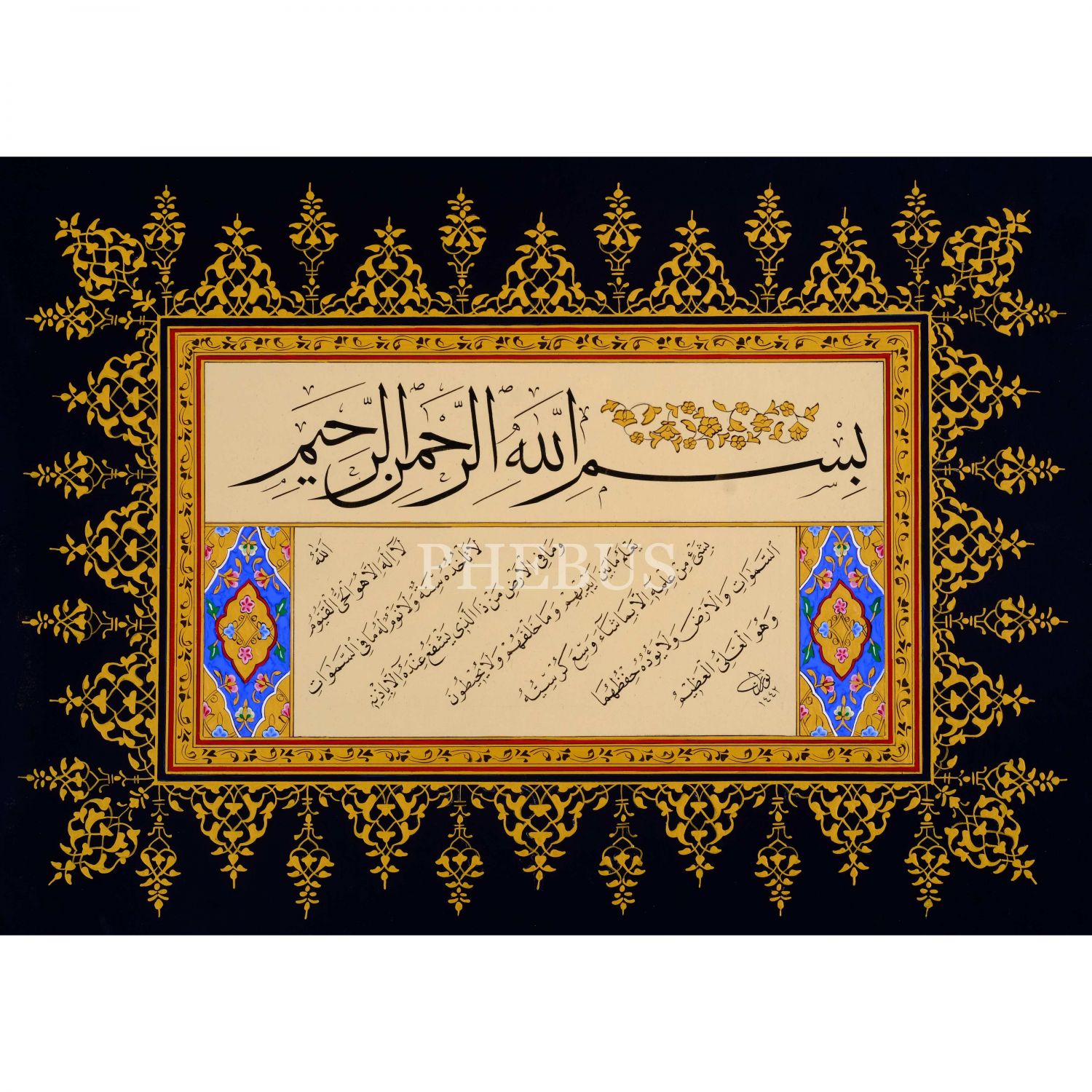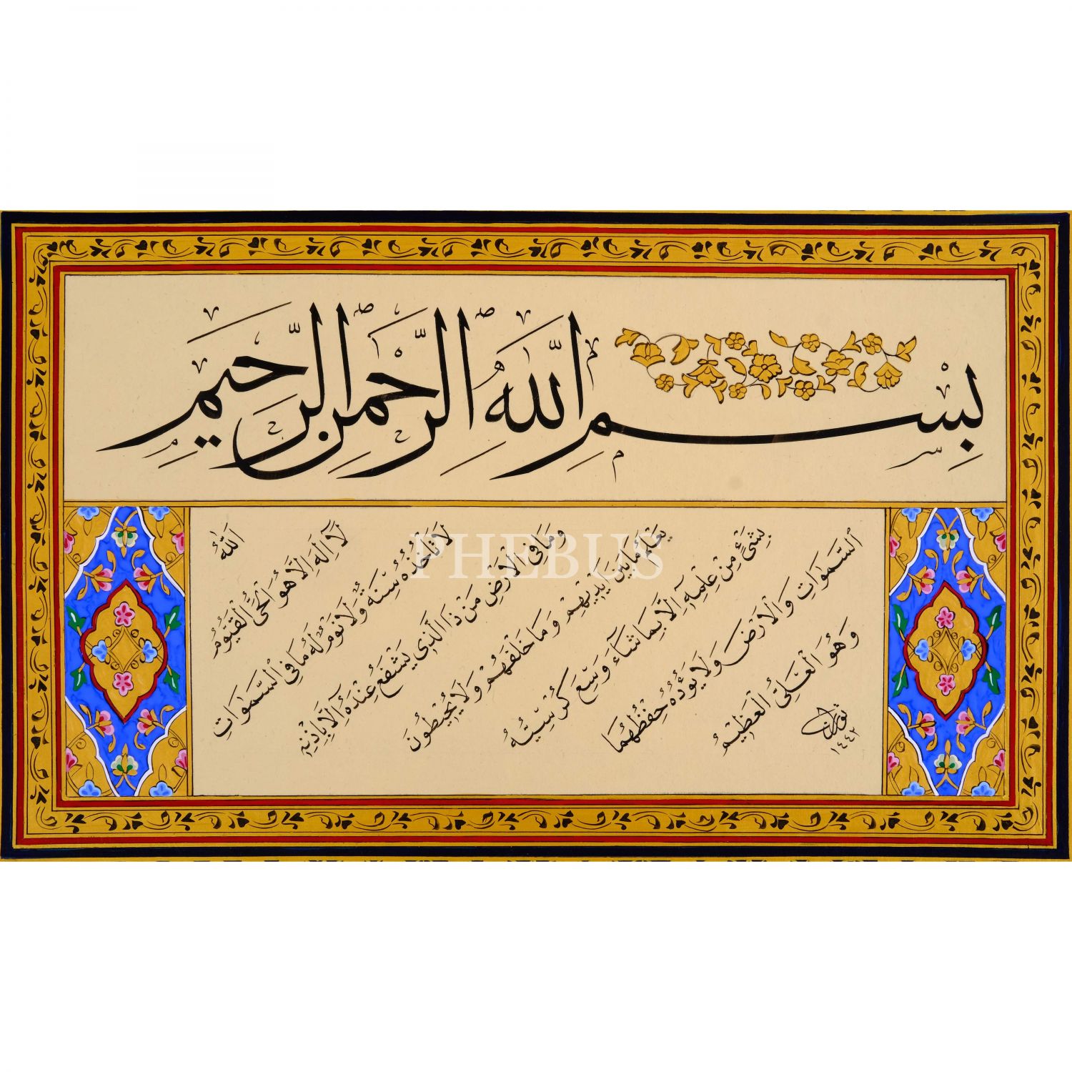 Turan (Sevgili) ketebeli sülüs-nesih koltuklu kıta, 1442 tarihli, yazı ölçü: 36x20 cm, çerçeve içi ölçü: 60x44 cm...