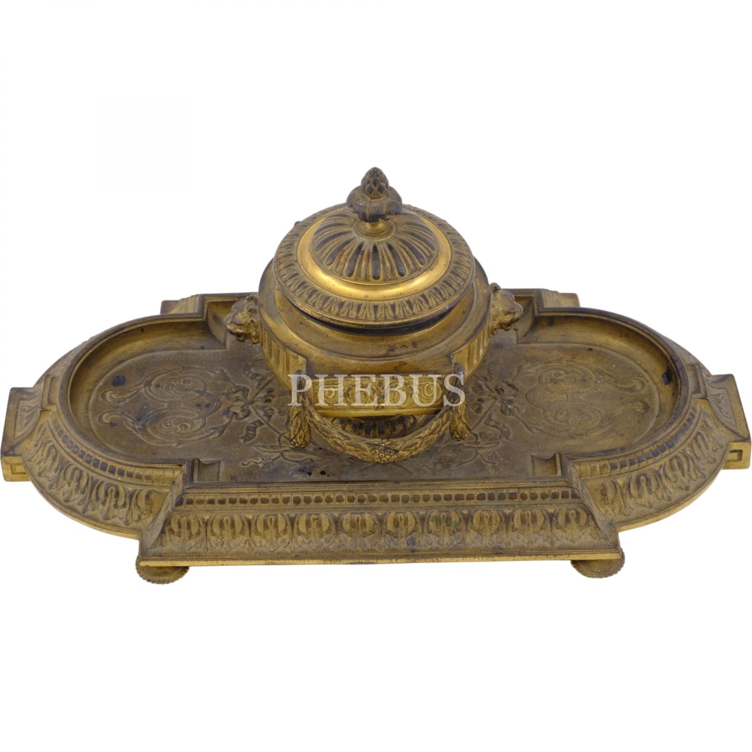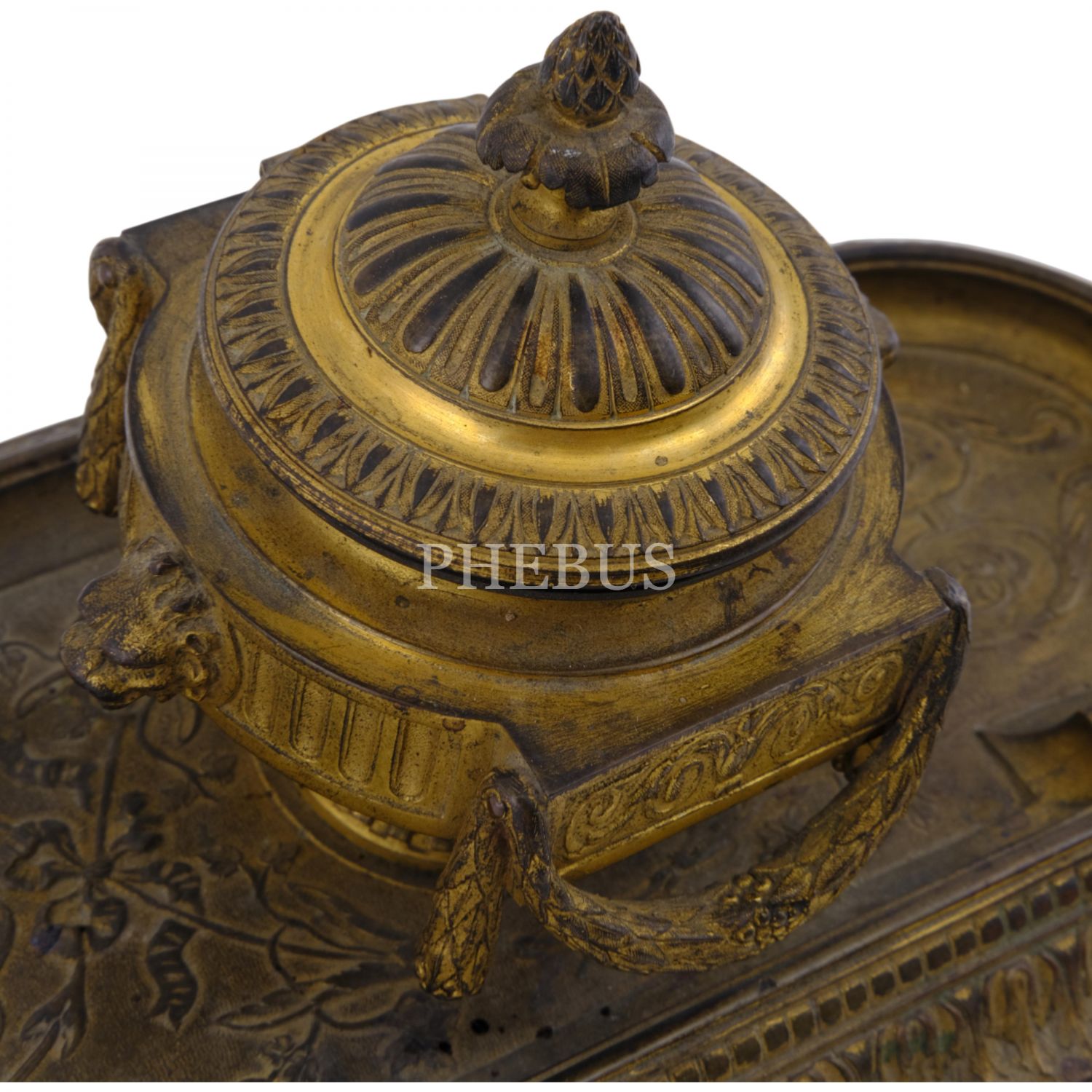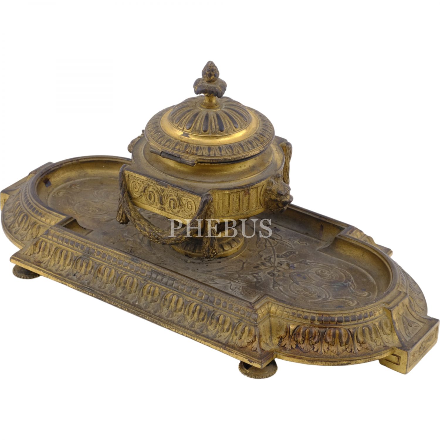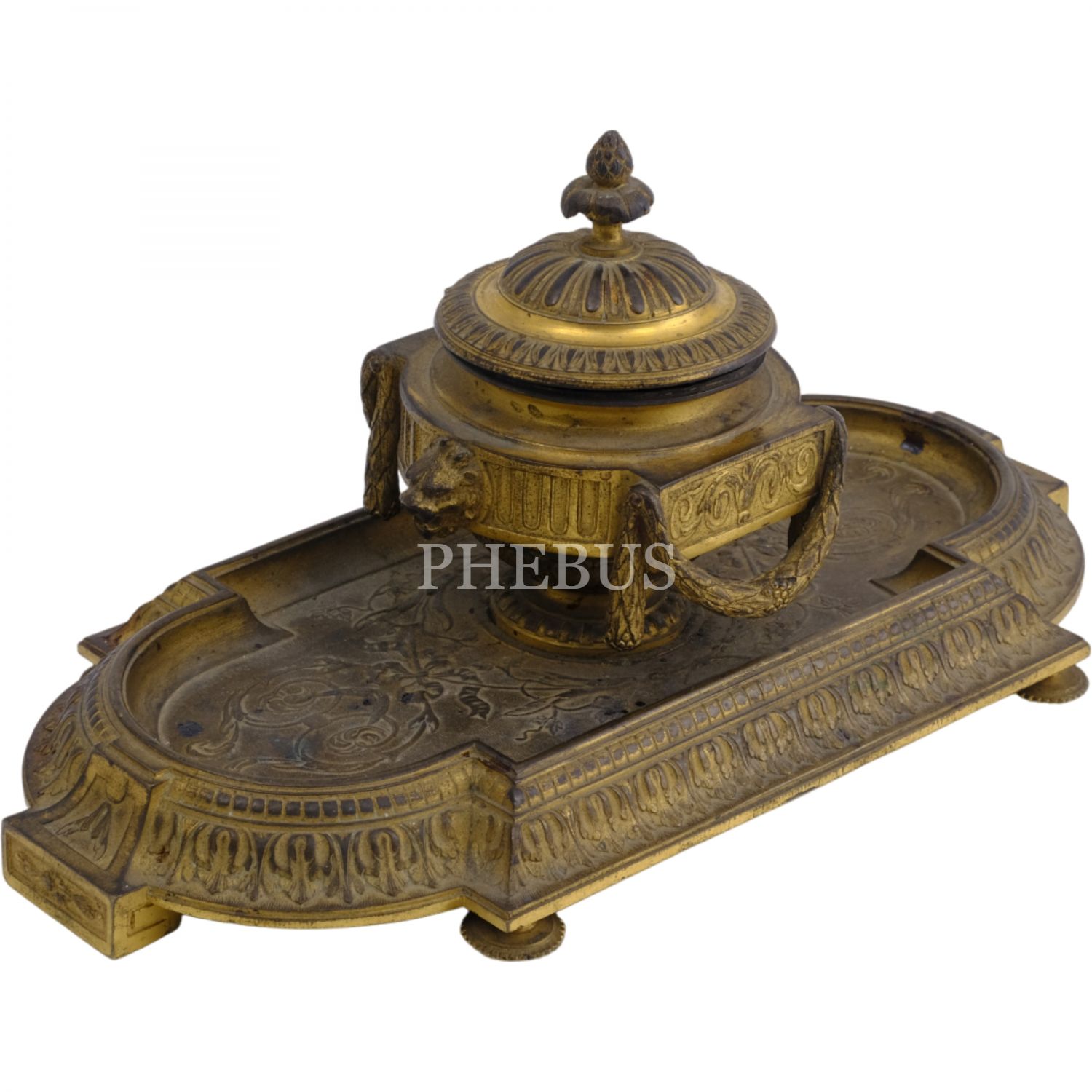 Aslan başı ve çelenk figürlü, floral desenli pirinç mürekkep hokkası, 26x13x13 cm...