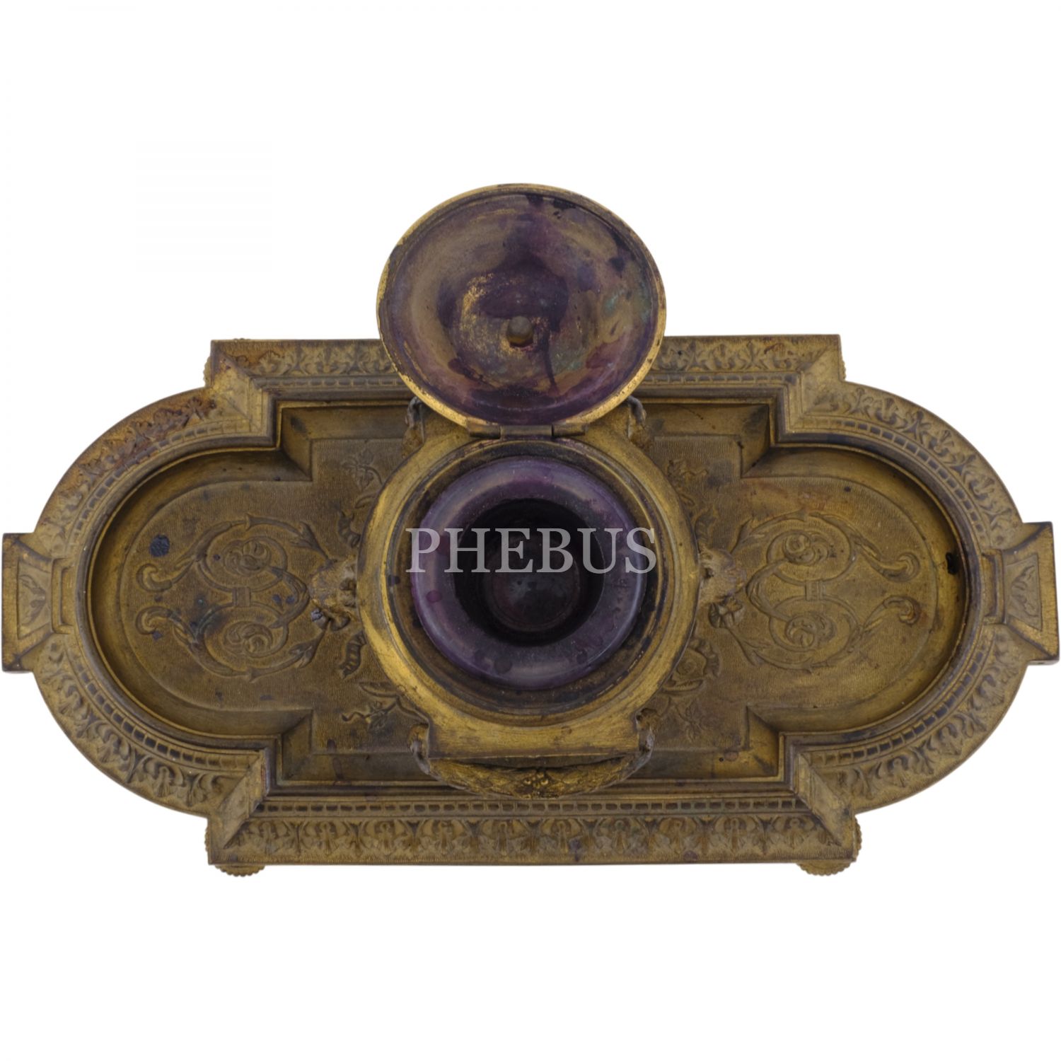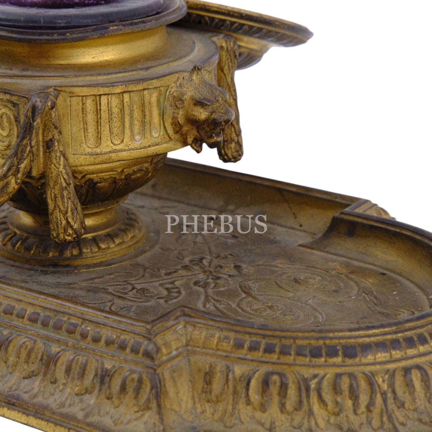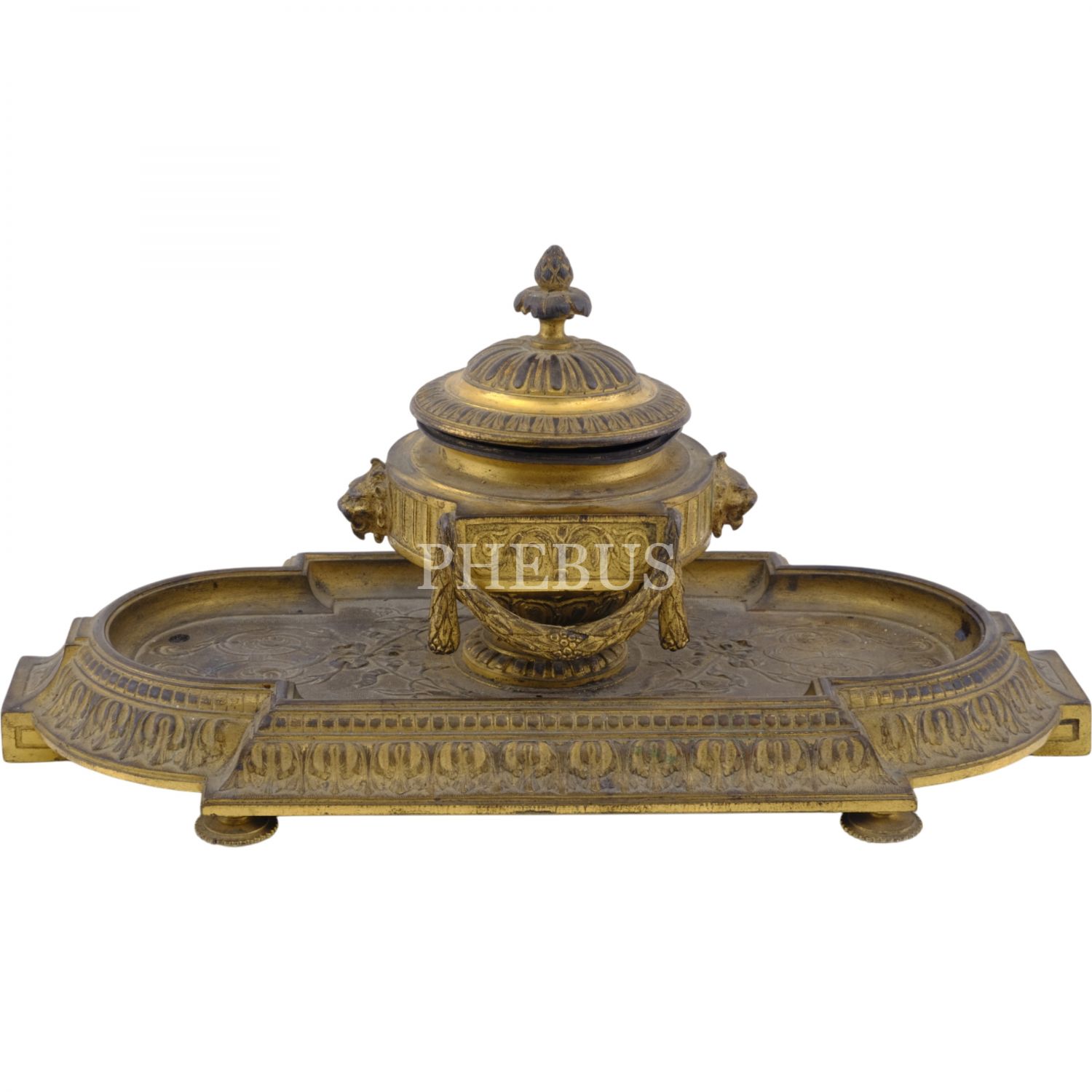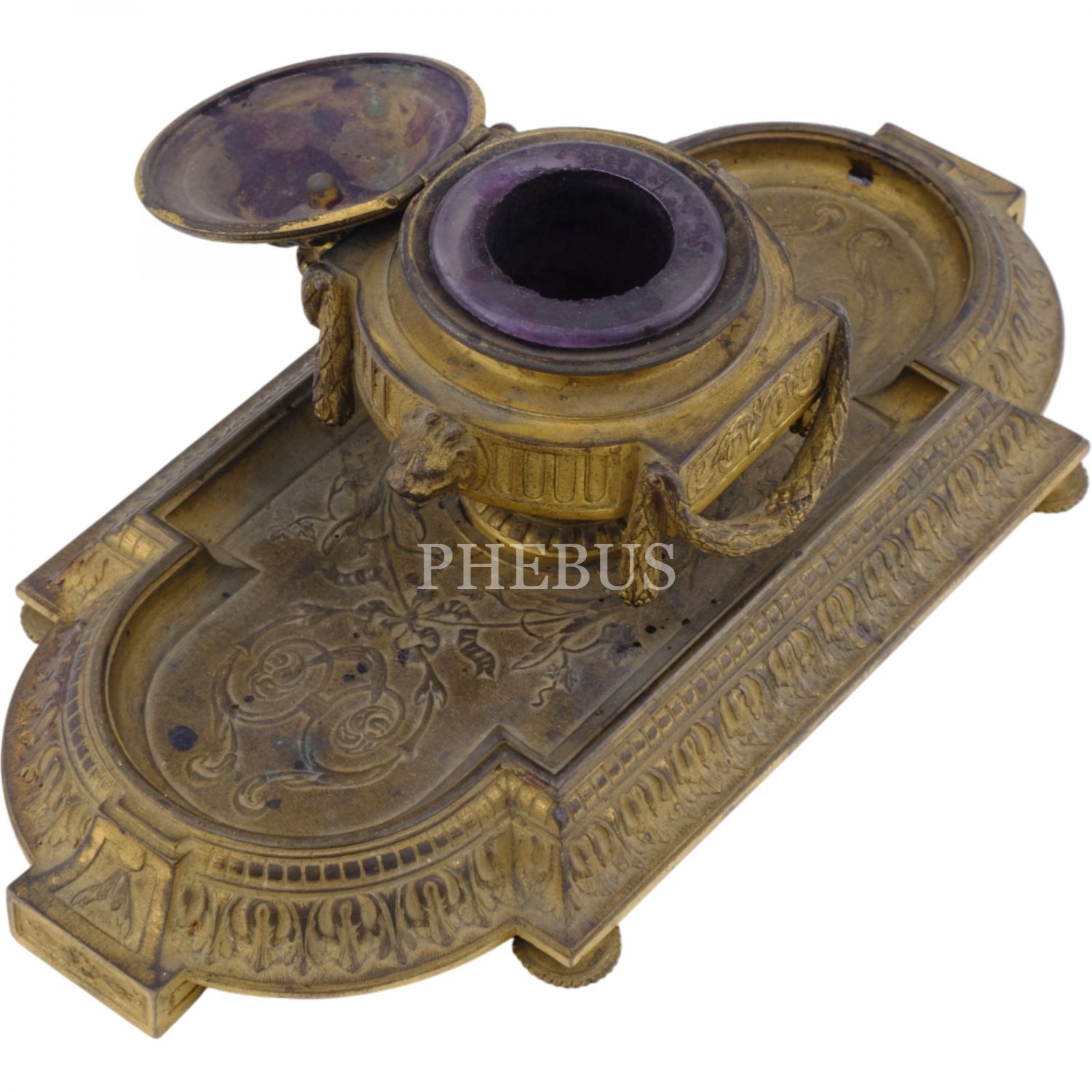 Aslan başı ve çelenk figürlü, floral desenli pirinç mürekkep hokkası, 26x13x13 cm...