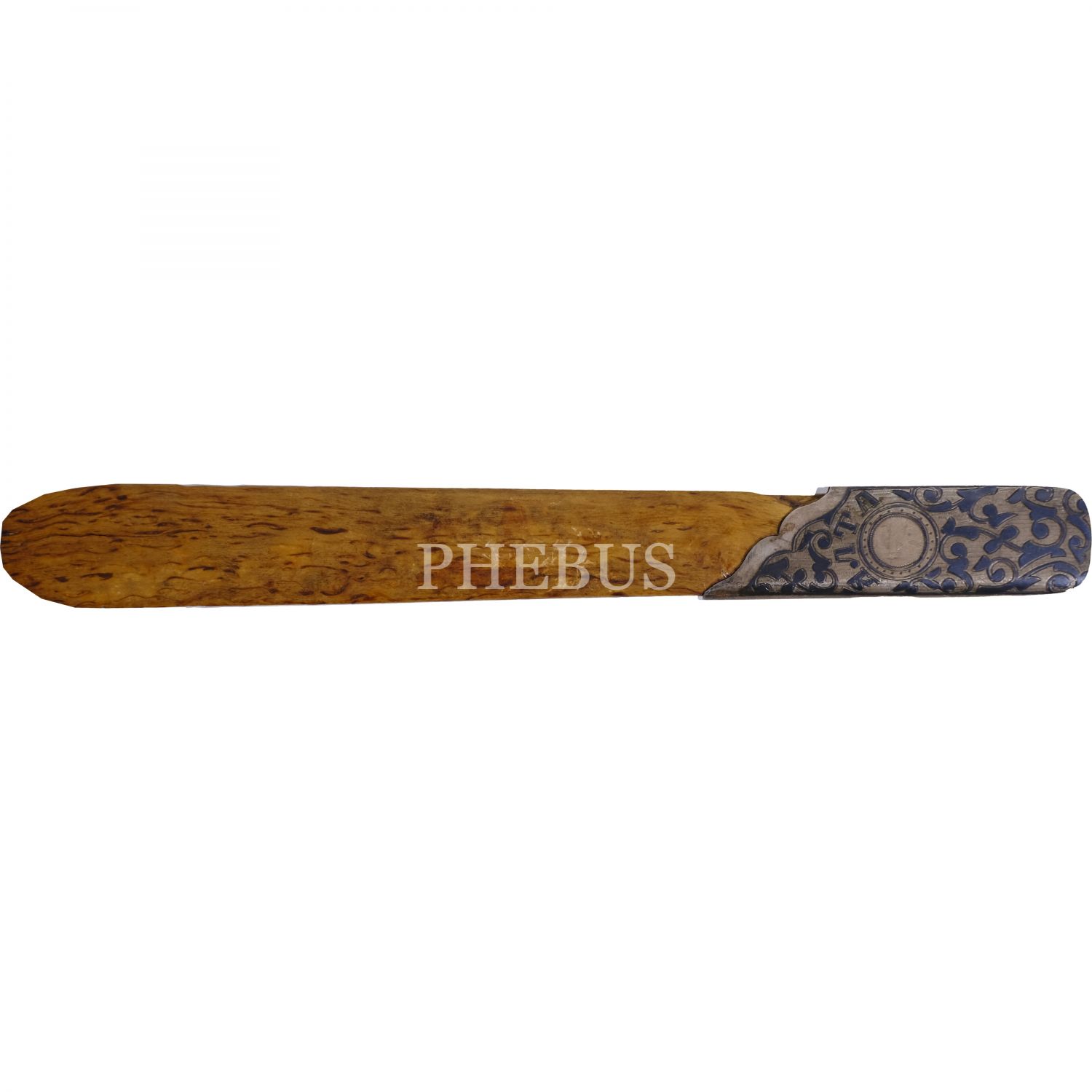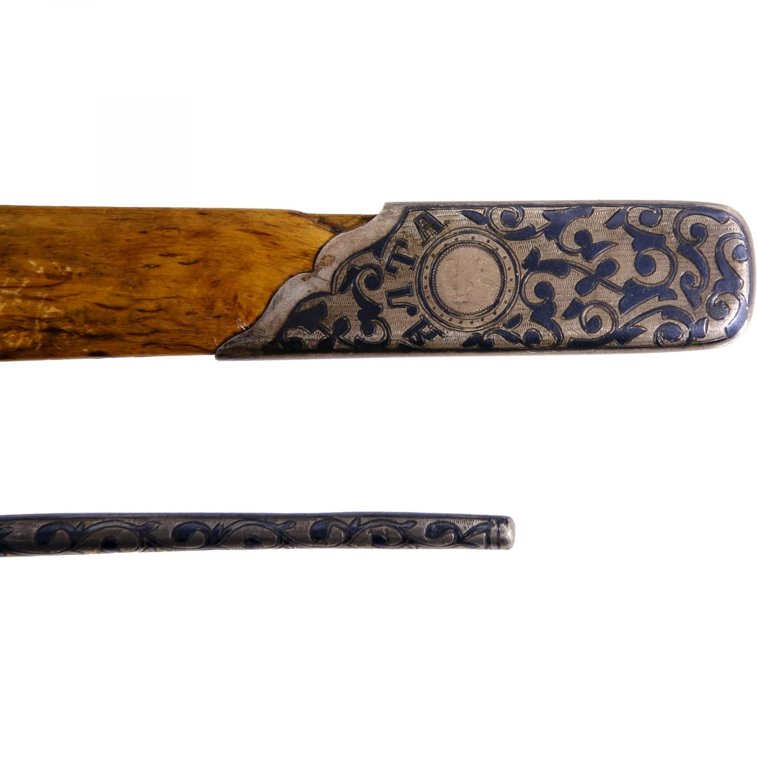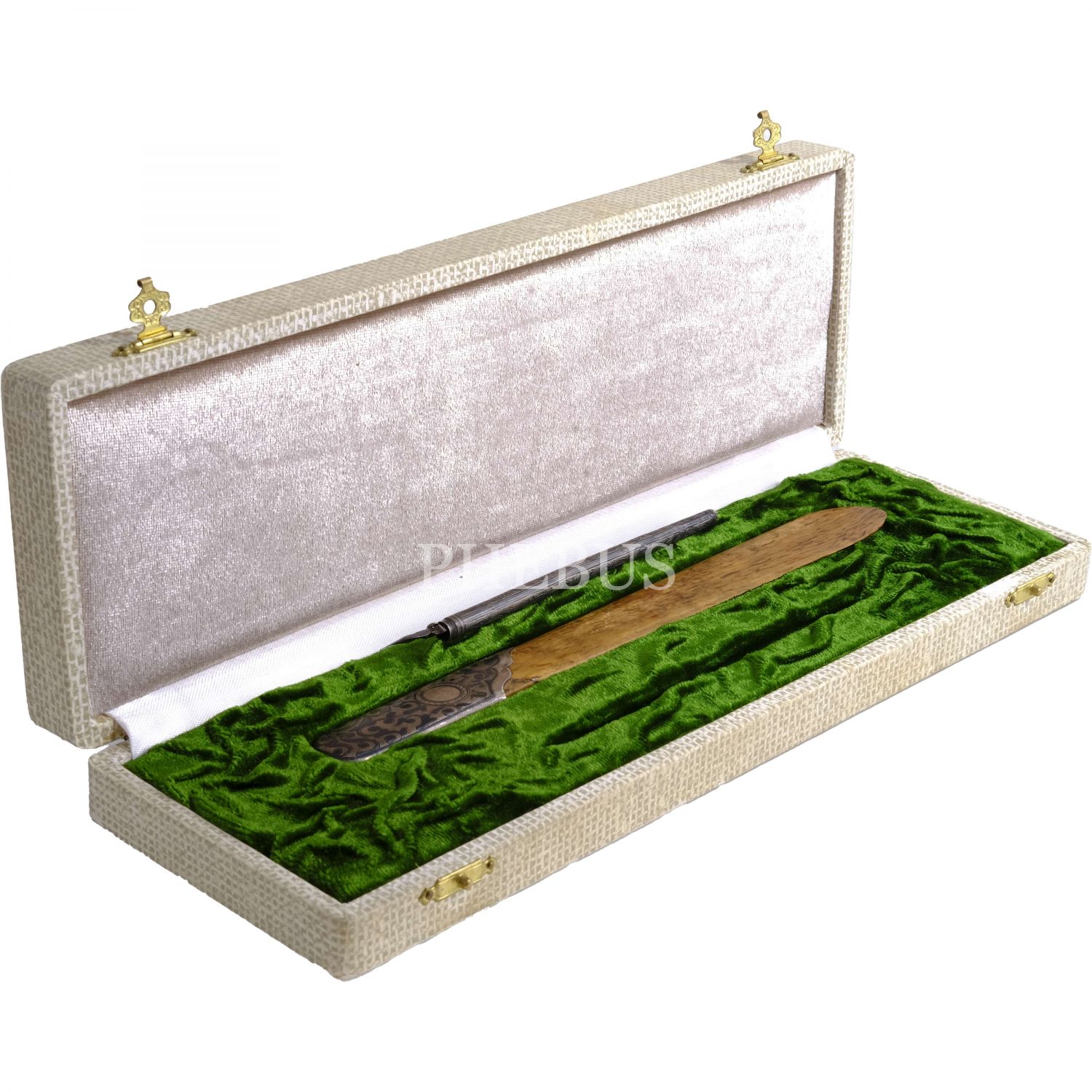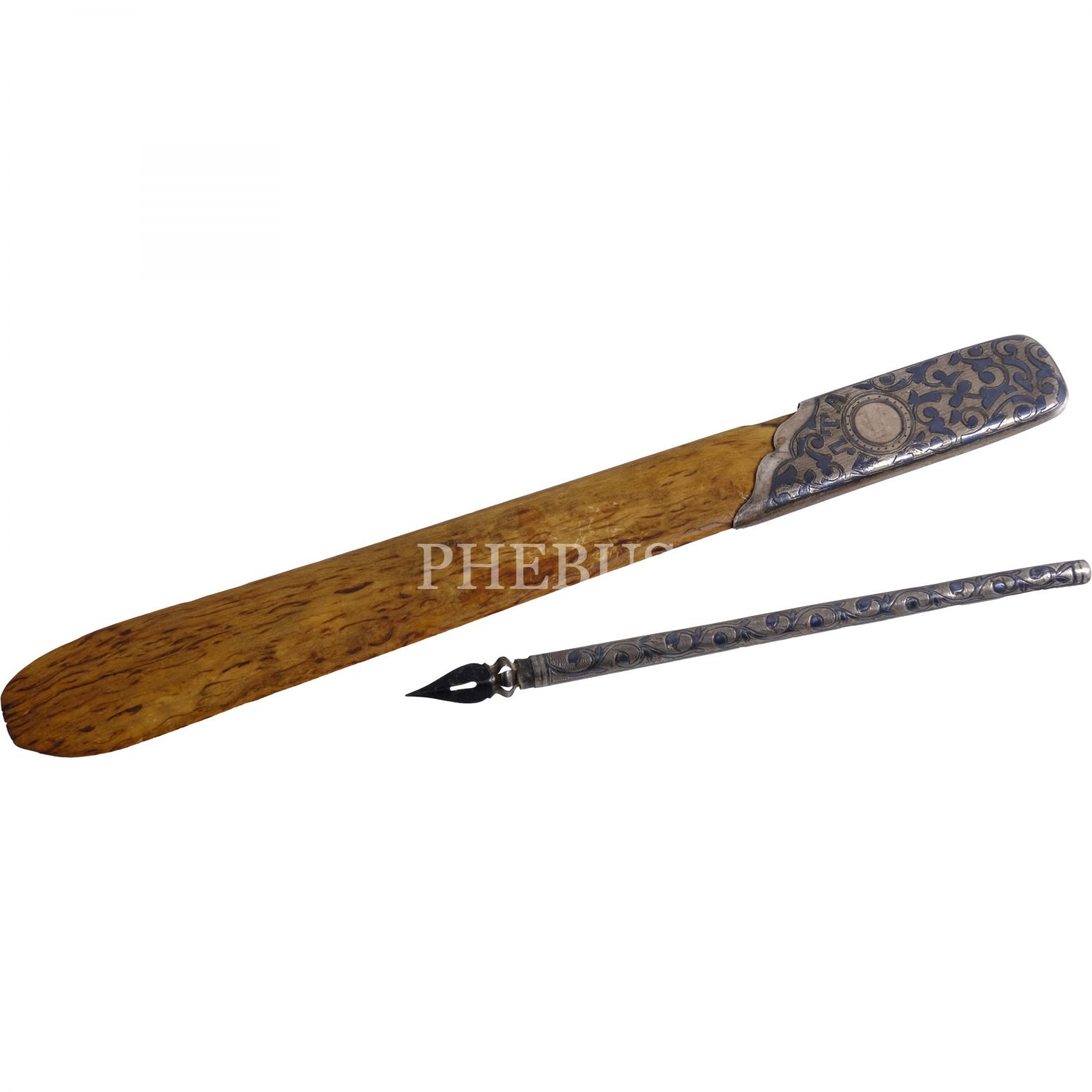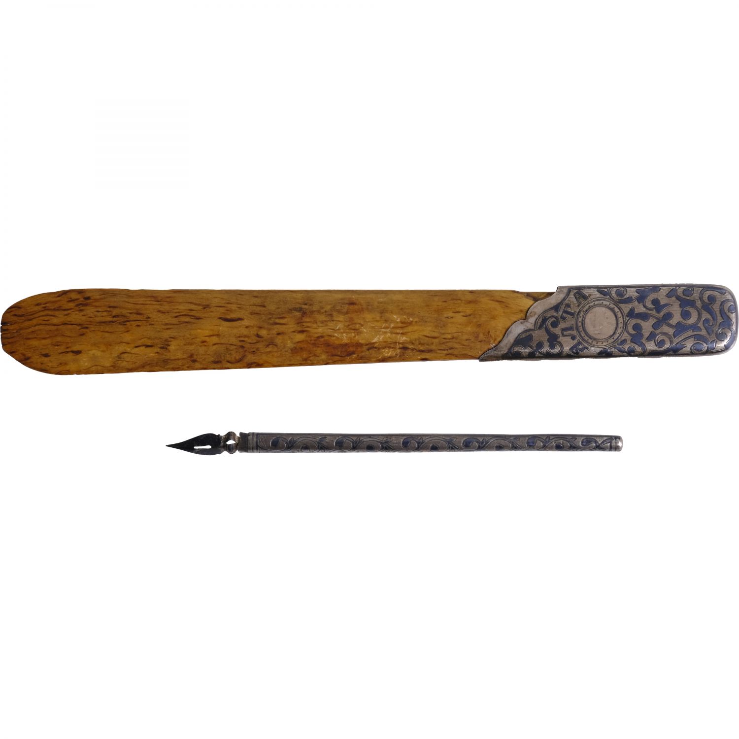 Kabzası savat işçilikli ahşap zarf açacağı ve savatlı dolmakalem, açacak: 22 cm, kalem: 14 cm, kutu: 30x10x4 cm...