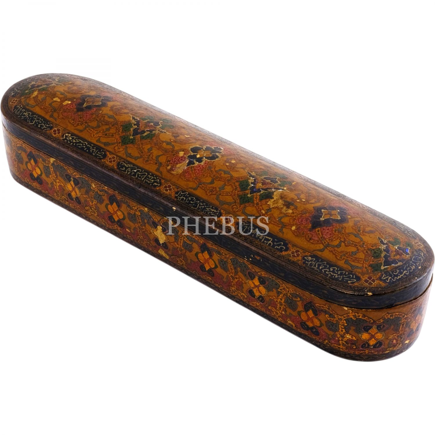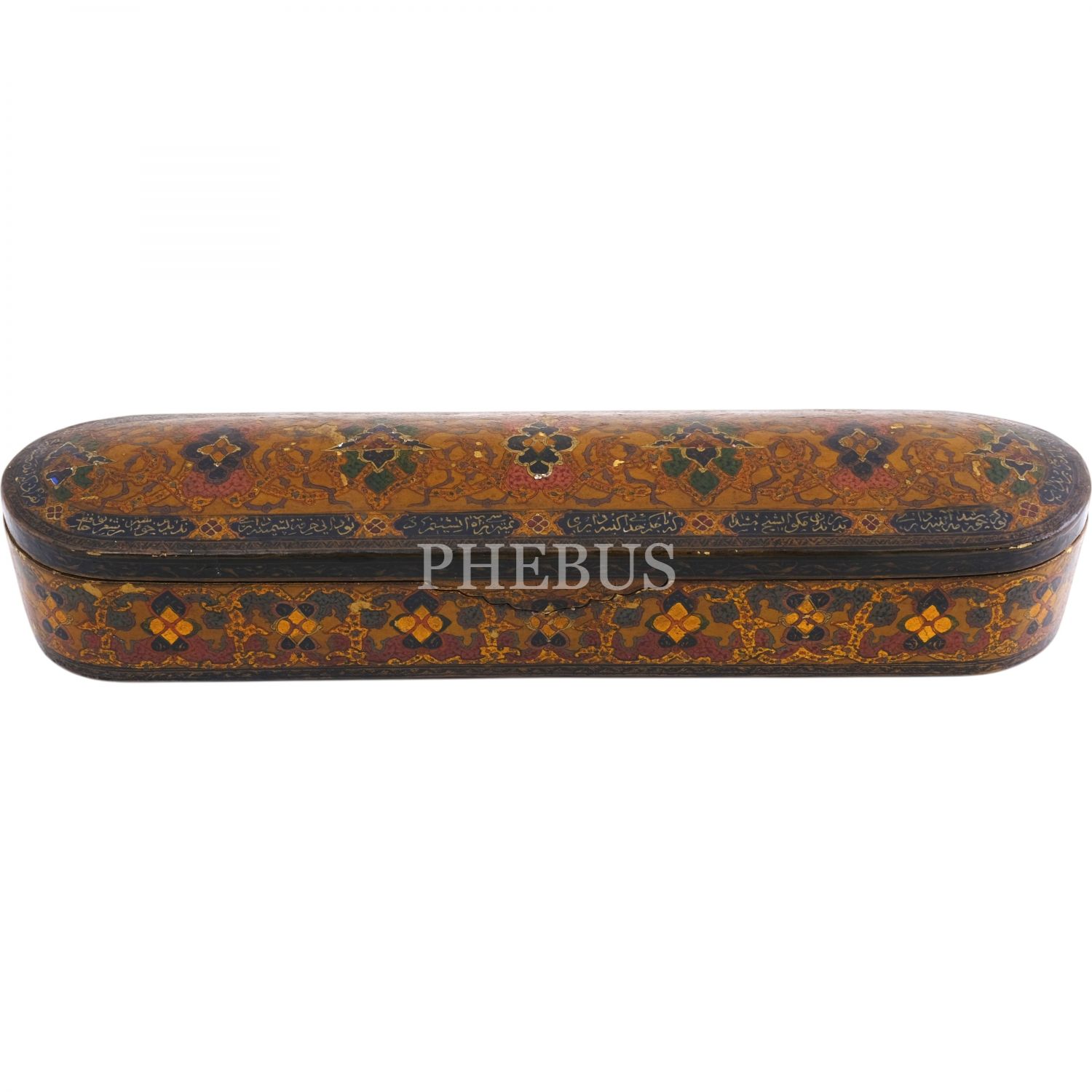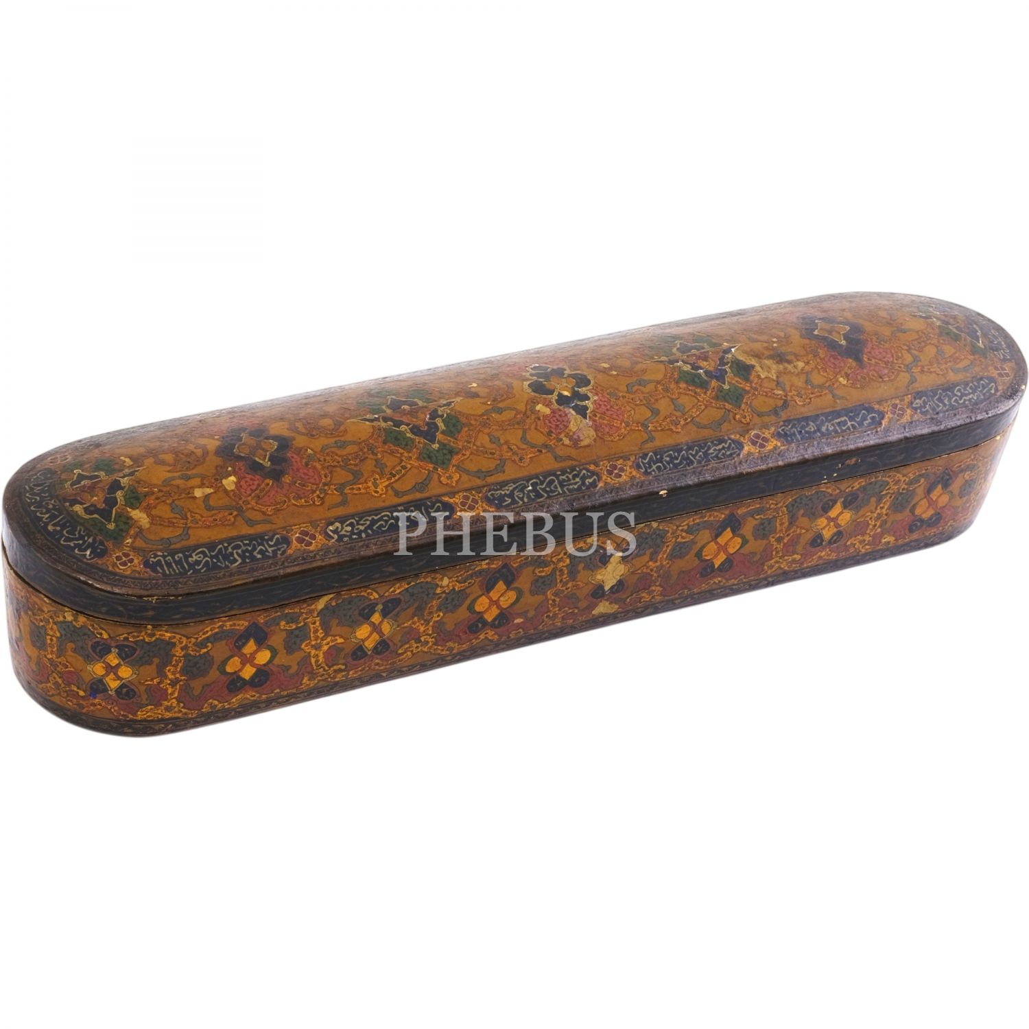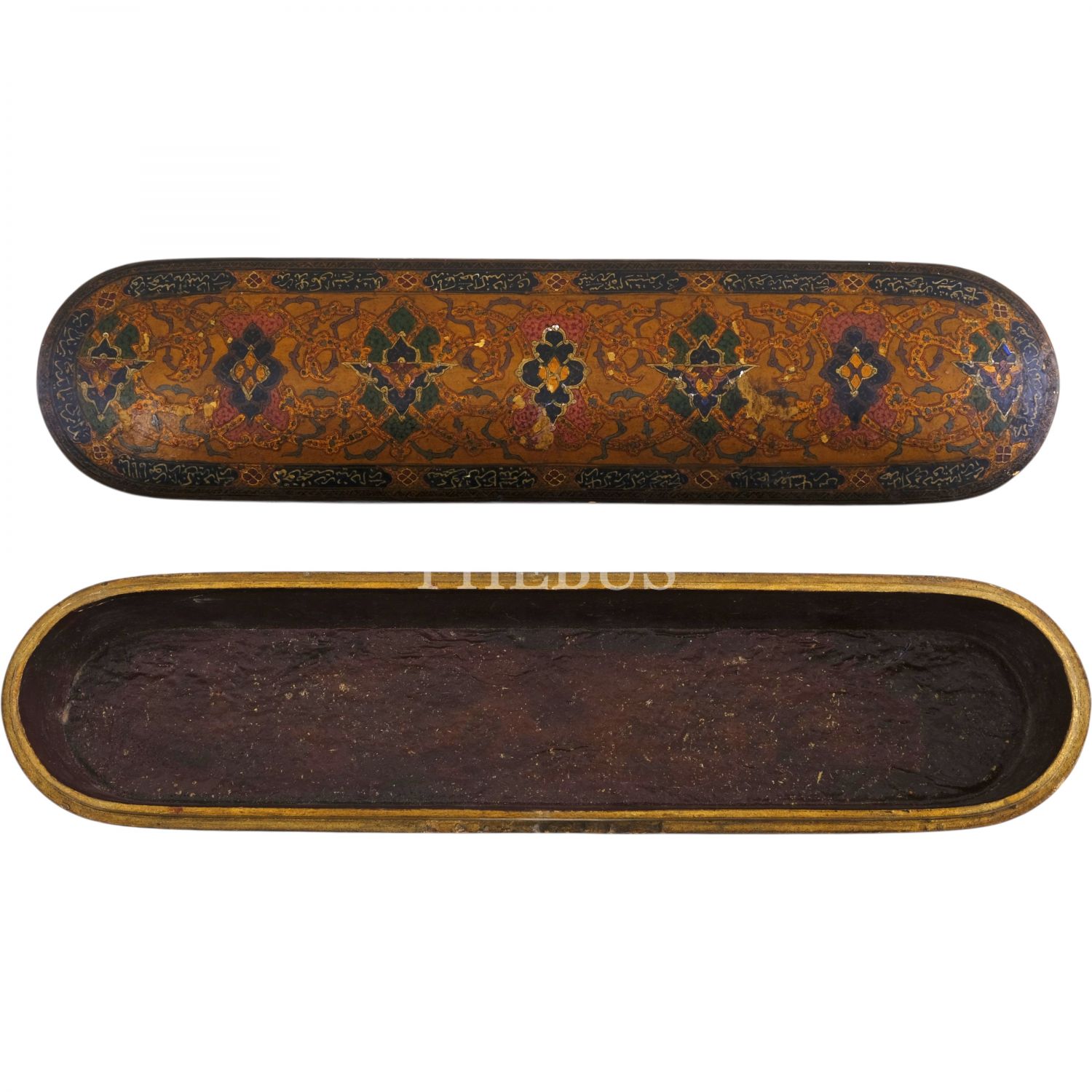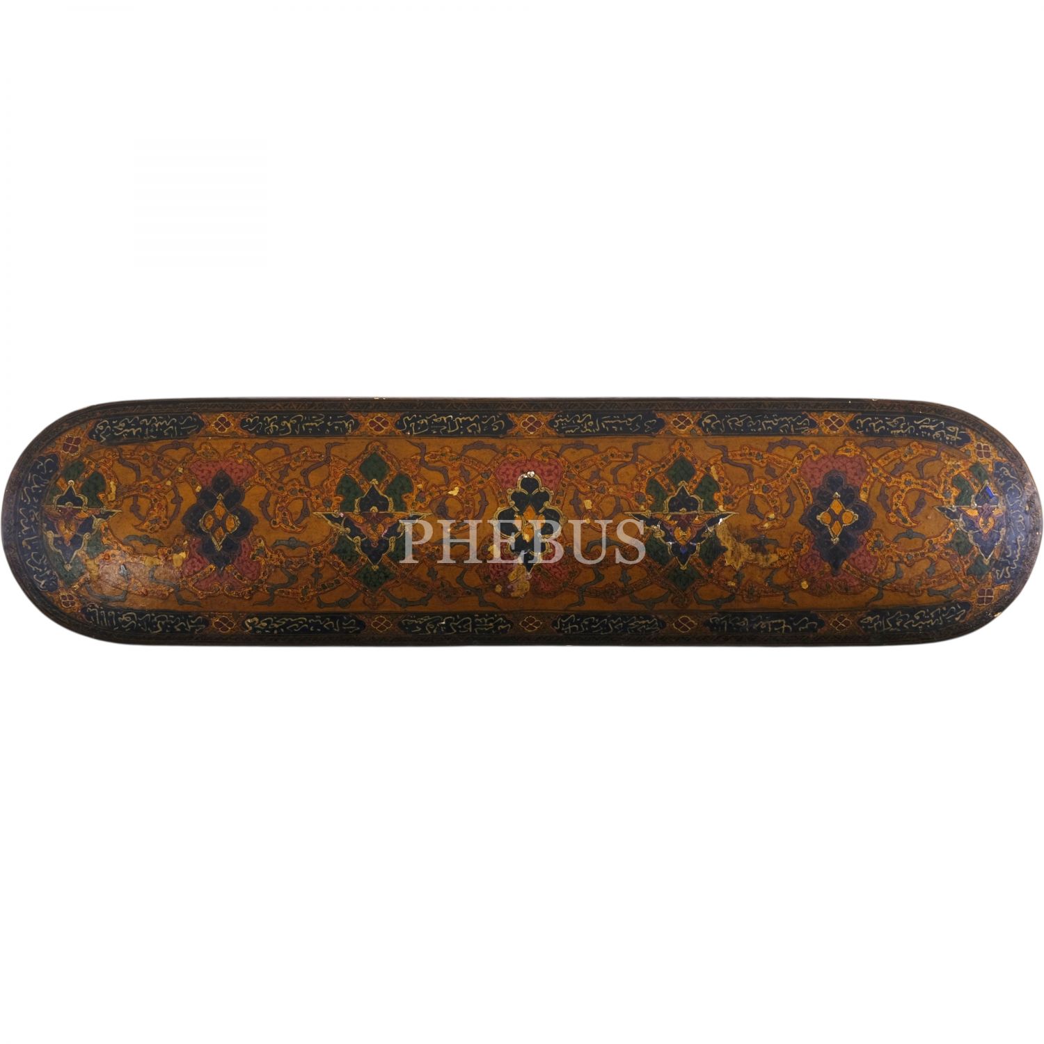 Tamamı el işi süslemeli, kapağının çevresi beyitlerle bezeli lâke cilalı kalemdan, Kemterî Mirza Hasan imzalı, 1089 tarihli, 36x9x7 cm...