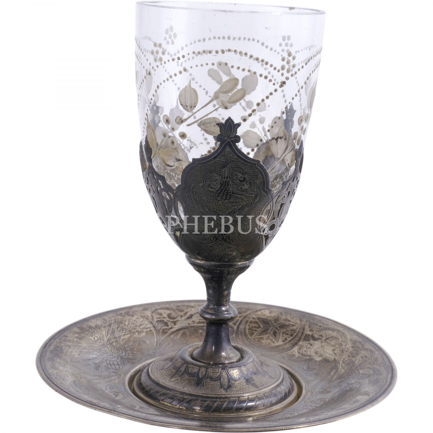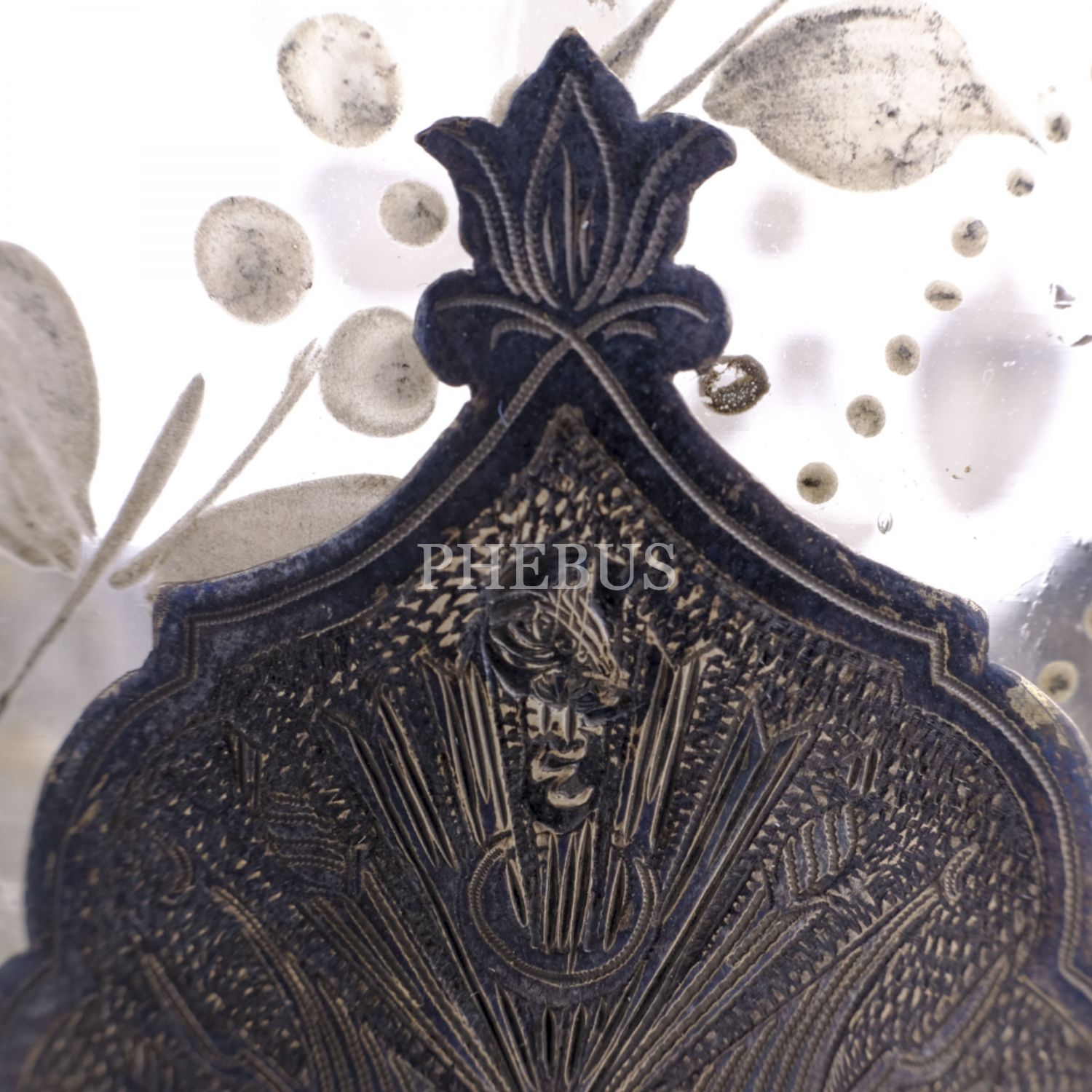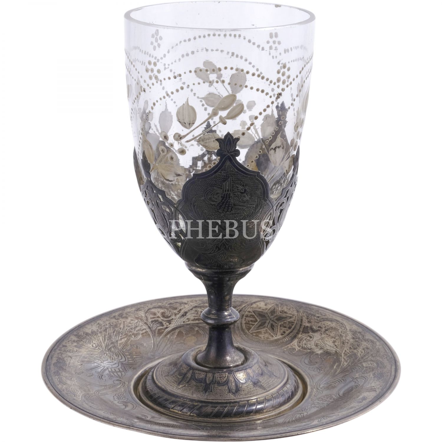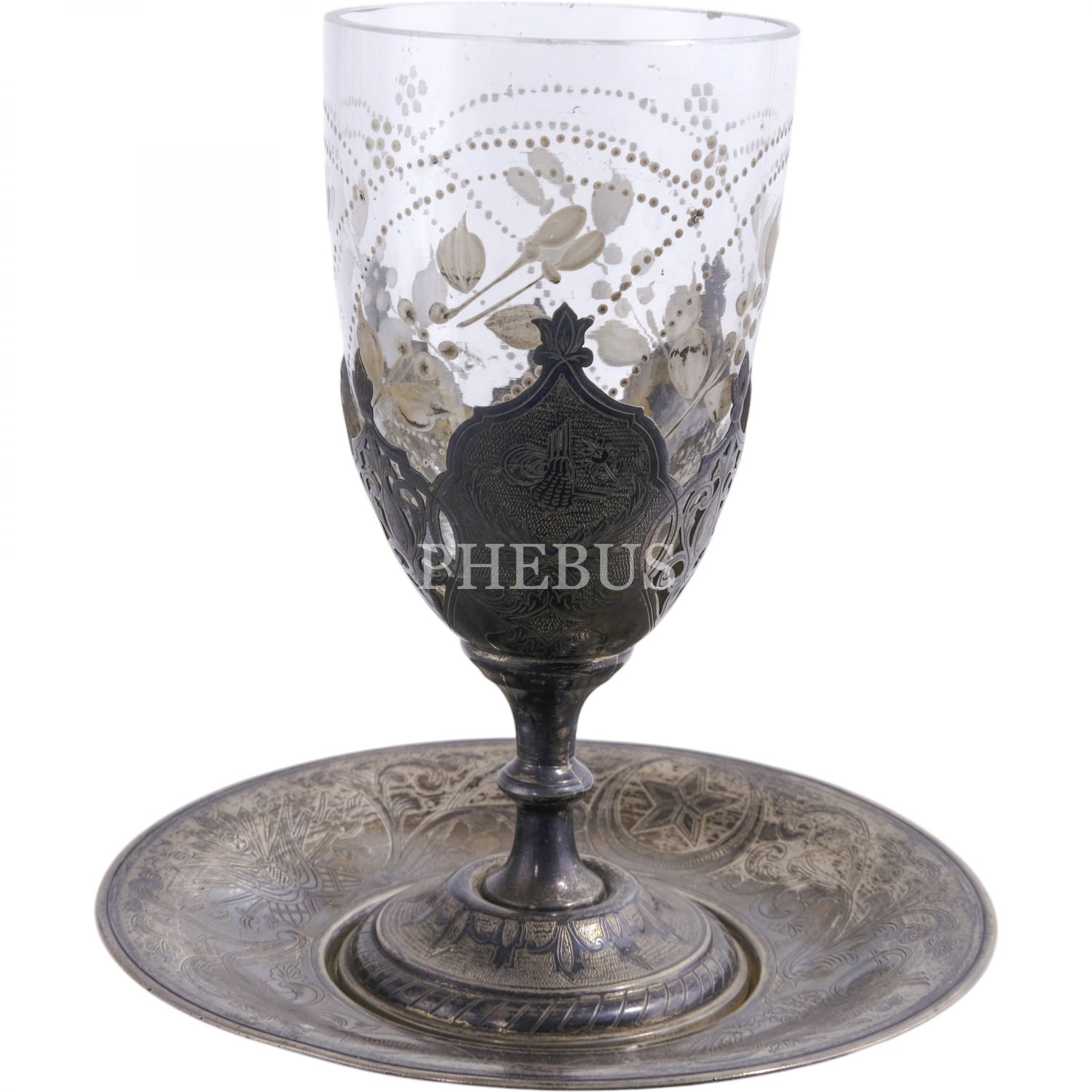 El boyama floral desenli cam kadeh ve kalem işçiliğiyle arma, ay-yıldız gibi detaylarla bezenmiş, tuğralı gümüş zarf ve tabağı, zarf ve tabak 172 g., 16x7,5 cm...