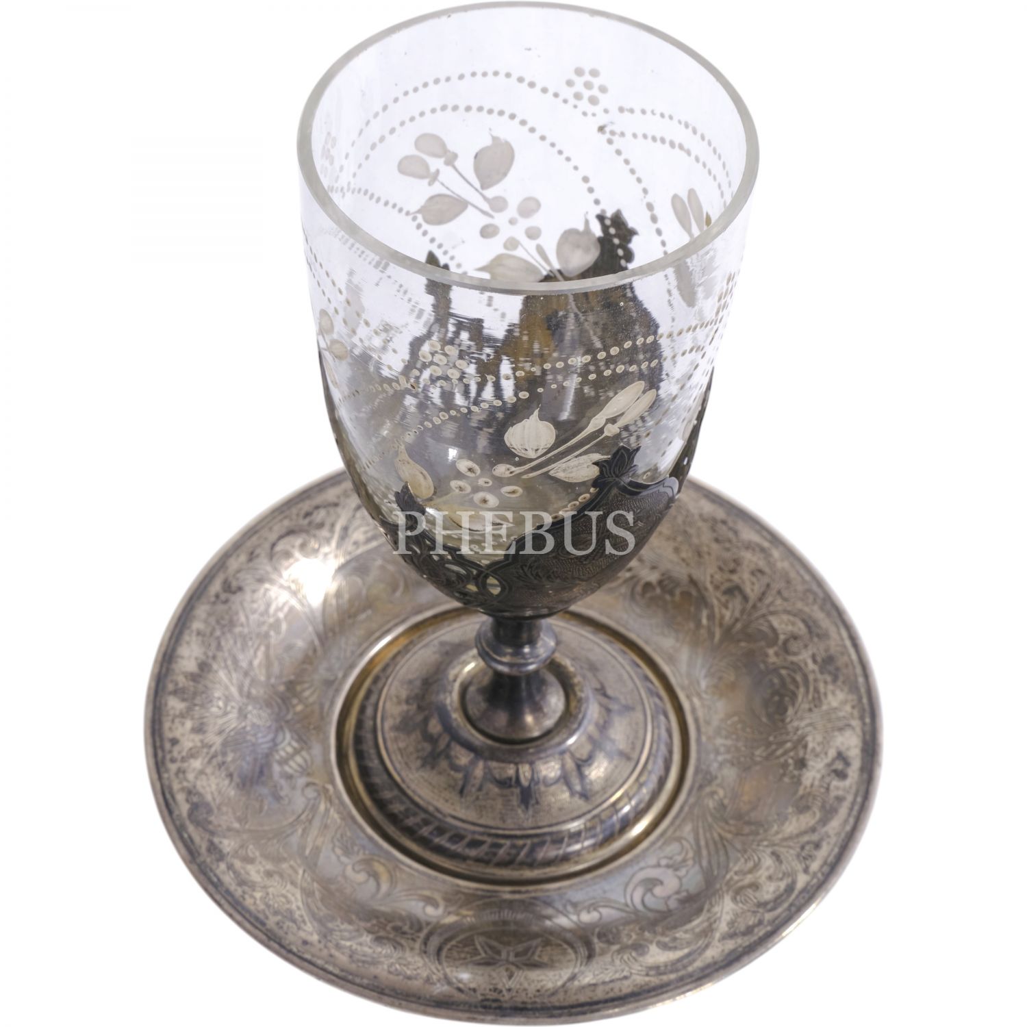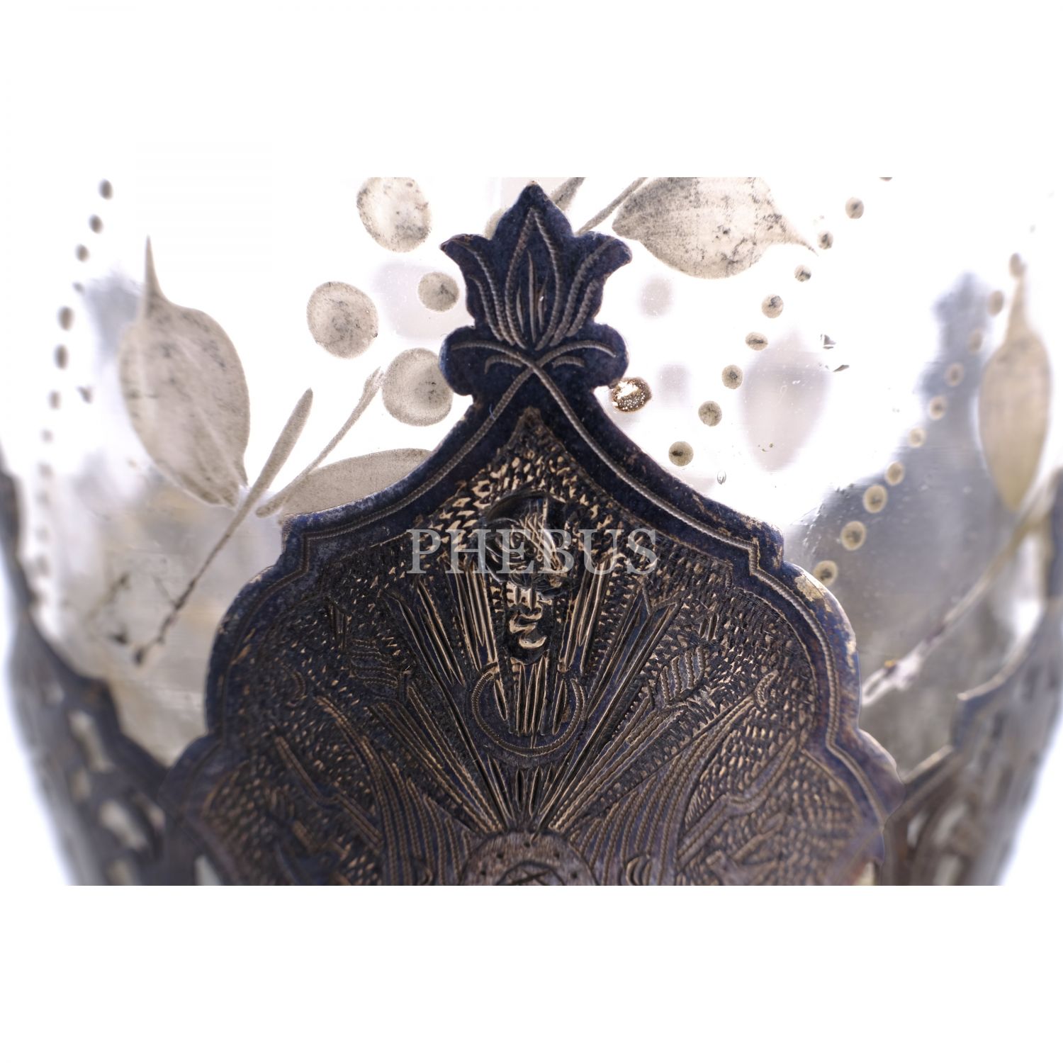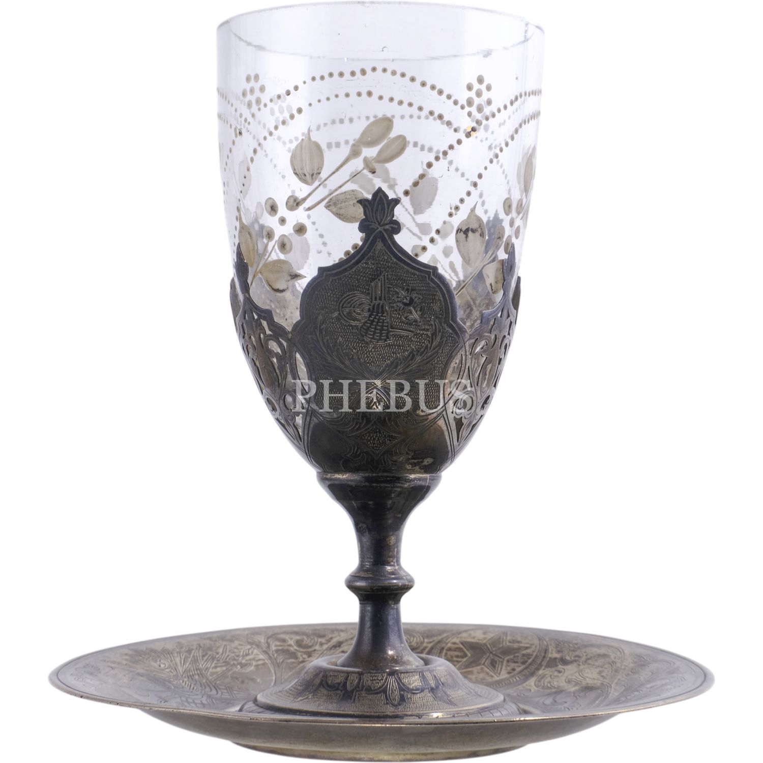 El boyama floral desenli cam kadeh ve kalem işçiliğiyle arma, ay-yıldız gibi detaylarla bezenmiş, tuğralı gümüş zarf ve tabağı, zarf ve tabak 172 g., 16x7,5 cm...