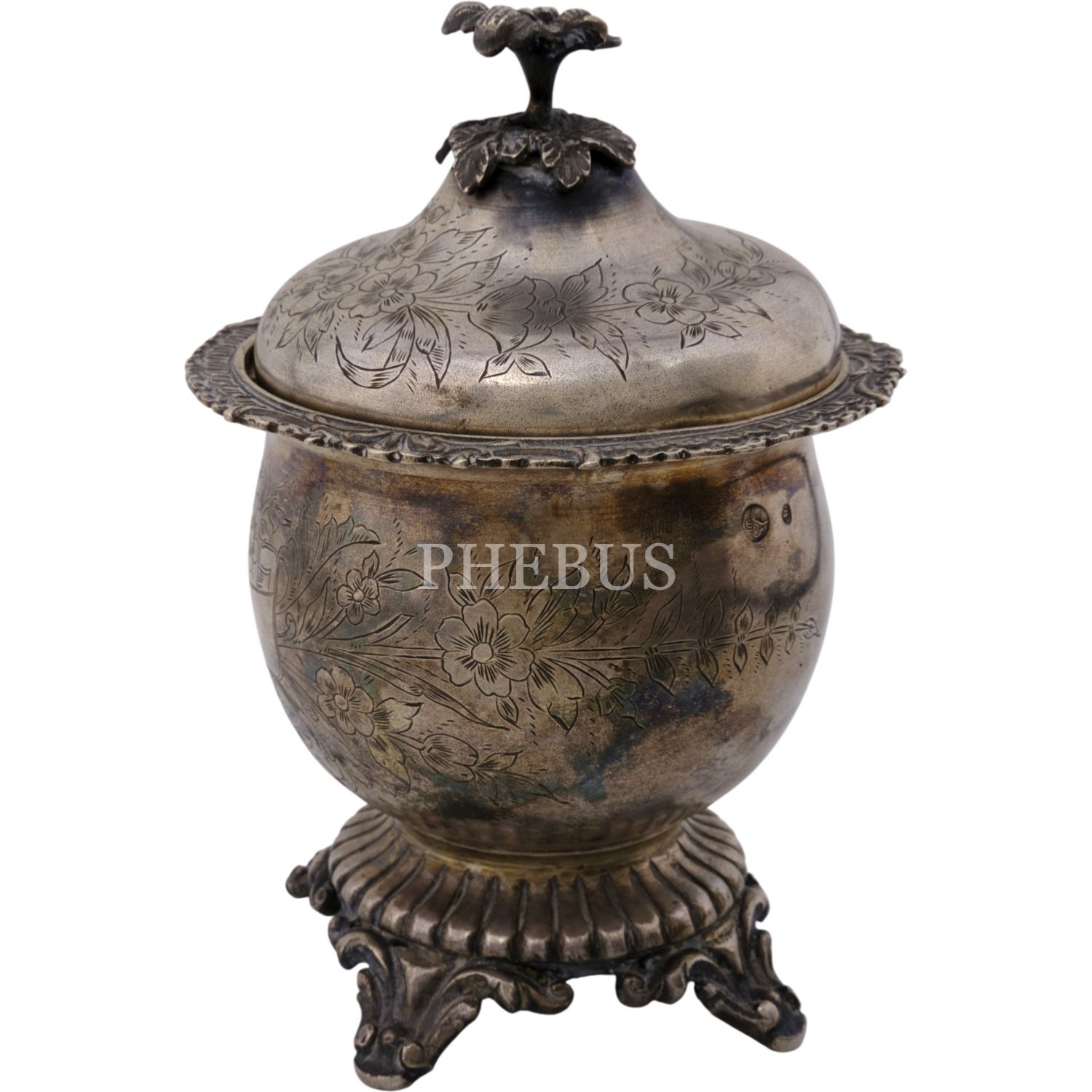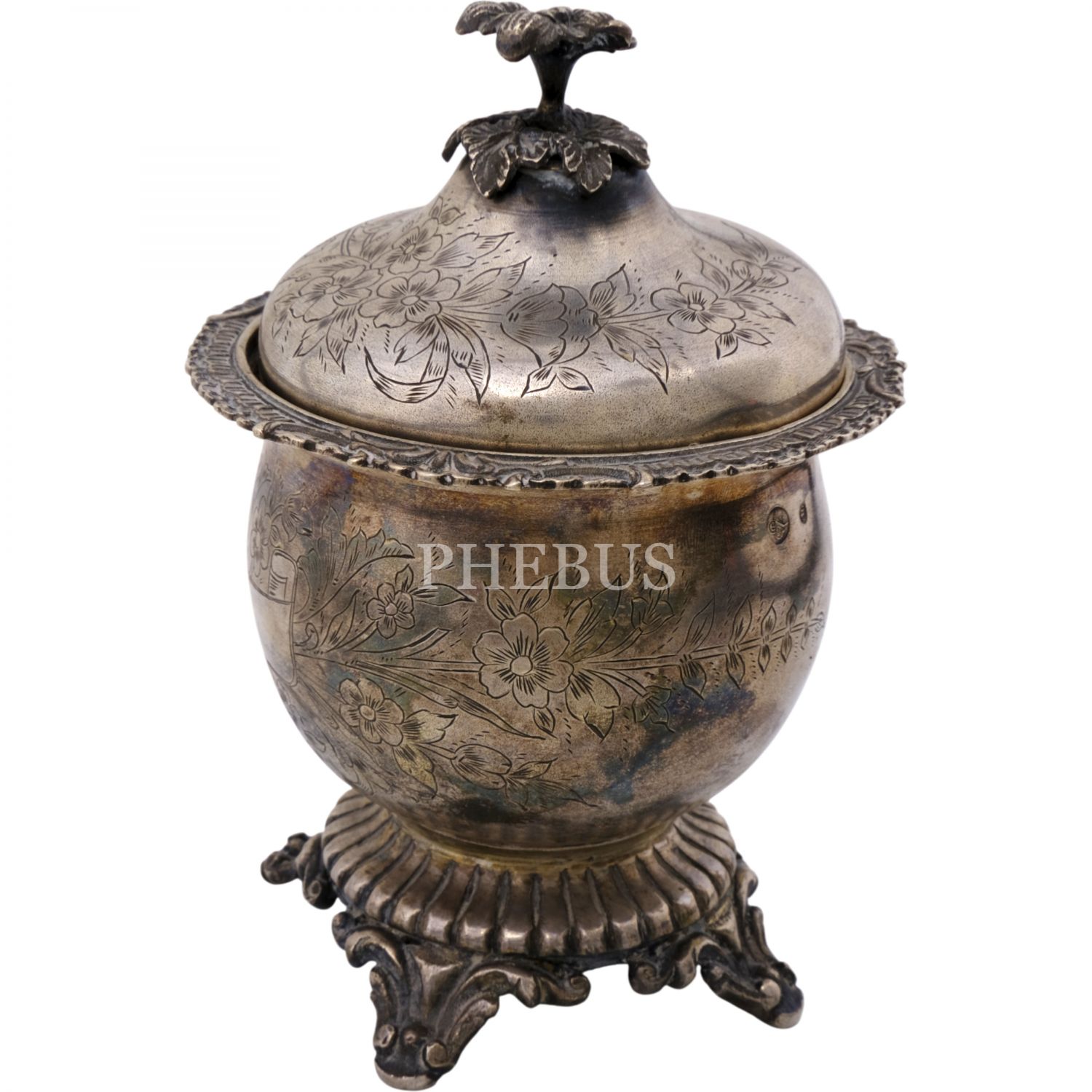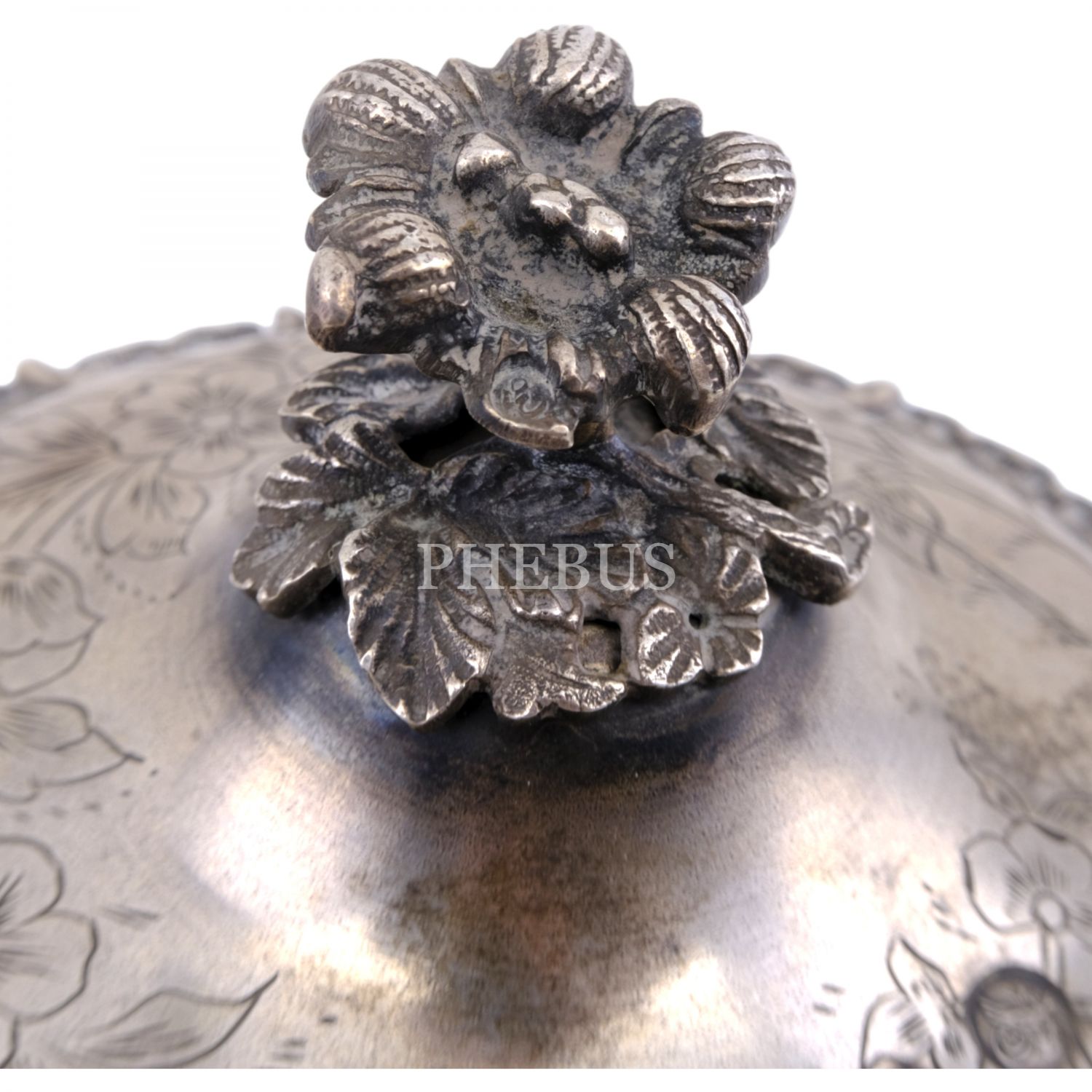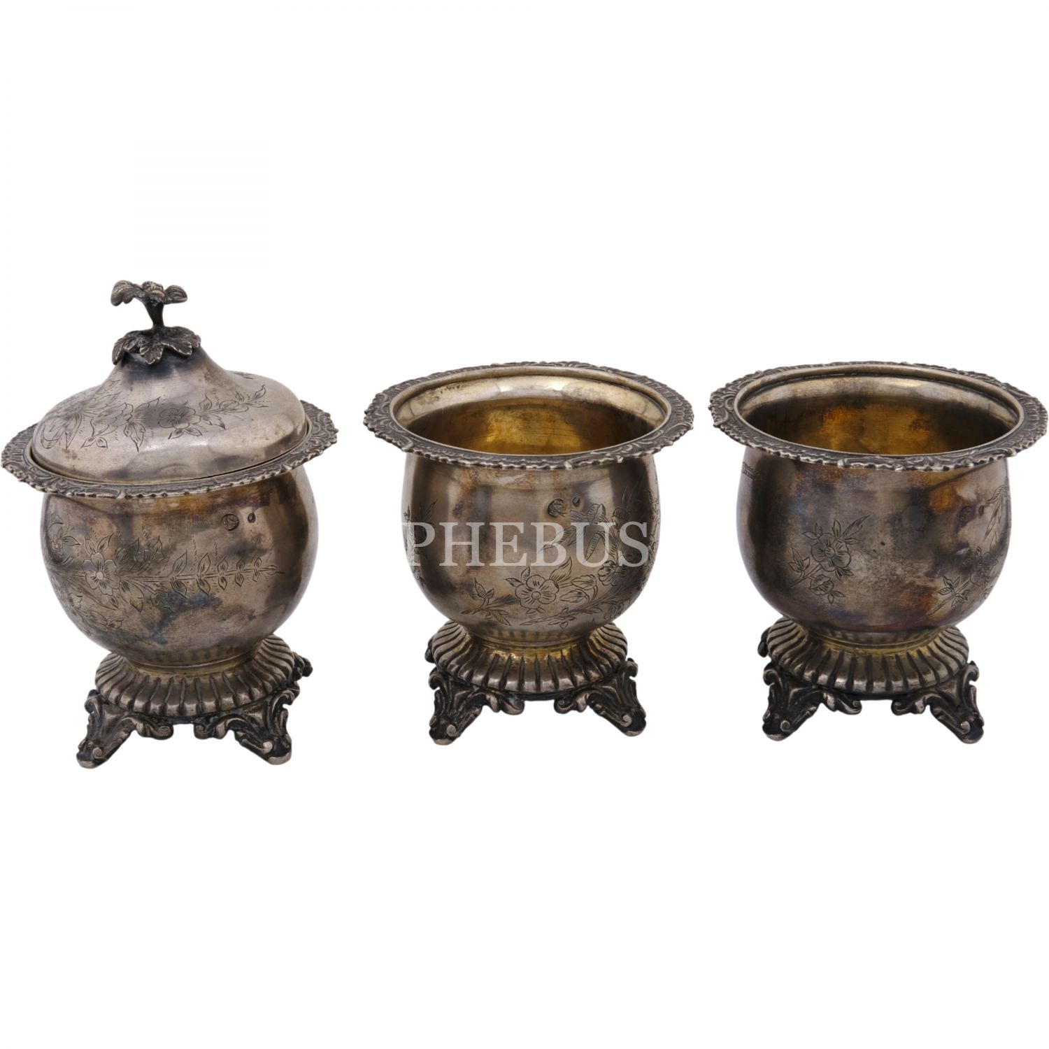 Üç parçadan oluşan gümüş tatlı takımı seti, her biri Osmanlı tuğralı ve kalem işi floral desenlerle bezeli, 949 g., kapaksızlar 11x10 cm, kapaklı 11x15 cm...