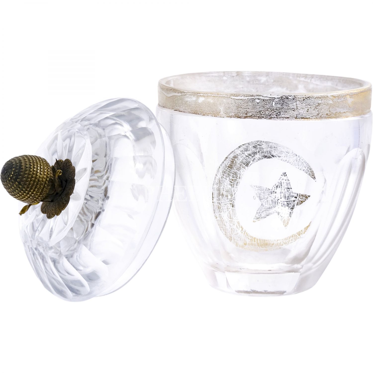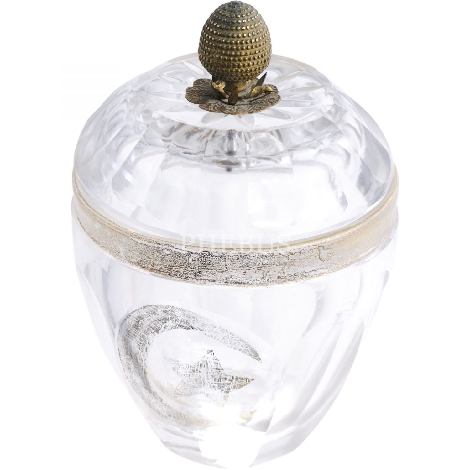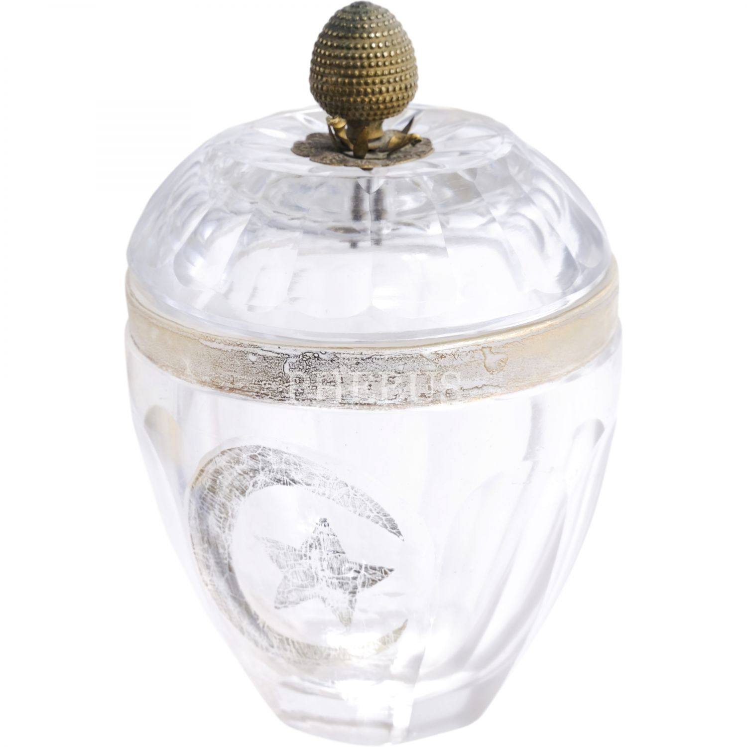 Gövdesi altın yaldızla ay-yıldız işlemeli, pirinç kapak topuzu kozalak formunda, kristal şekerlik, 16x10 cm...
