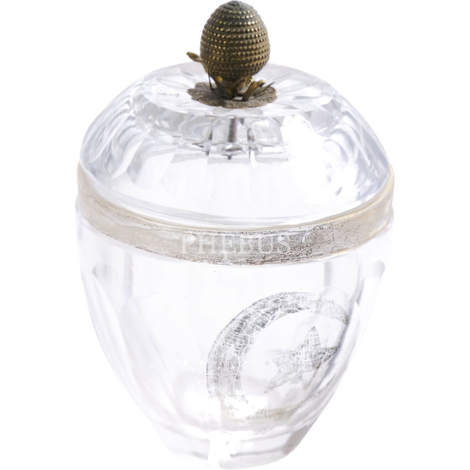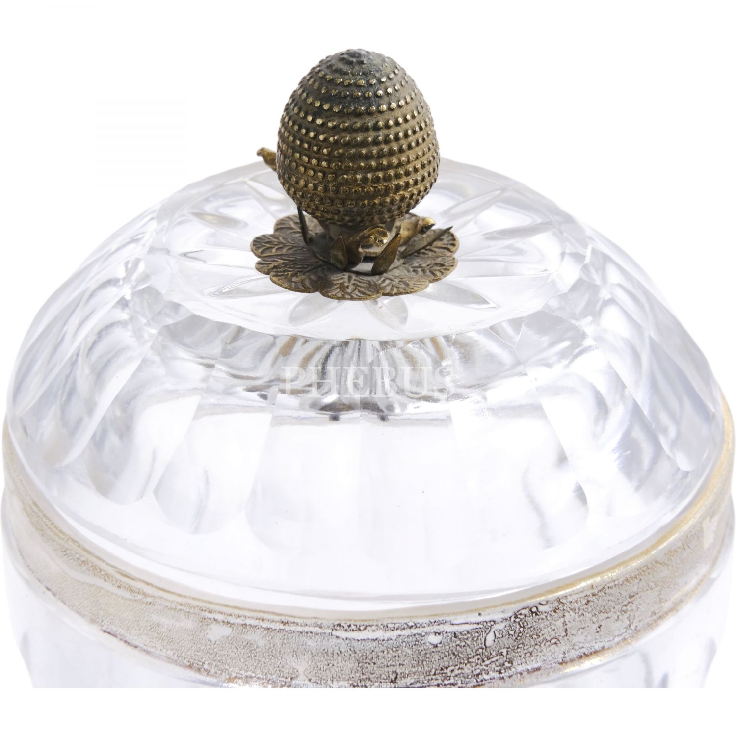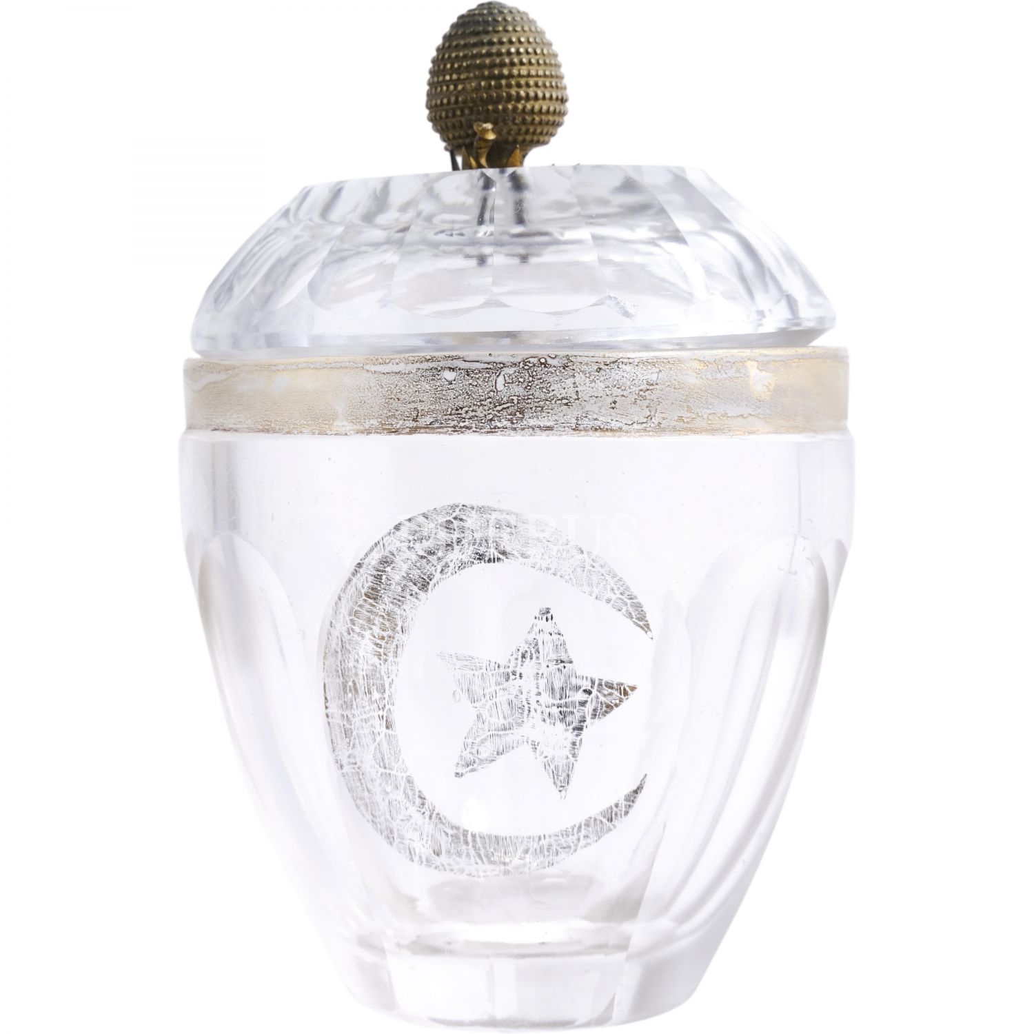 Gövdesi altın yaldızla ay-yıldız işlemeli, pirinç kapak topuzu kozalak formunda, kristal şekerlik, 16x10 cm...