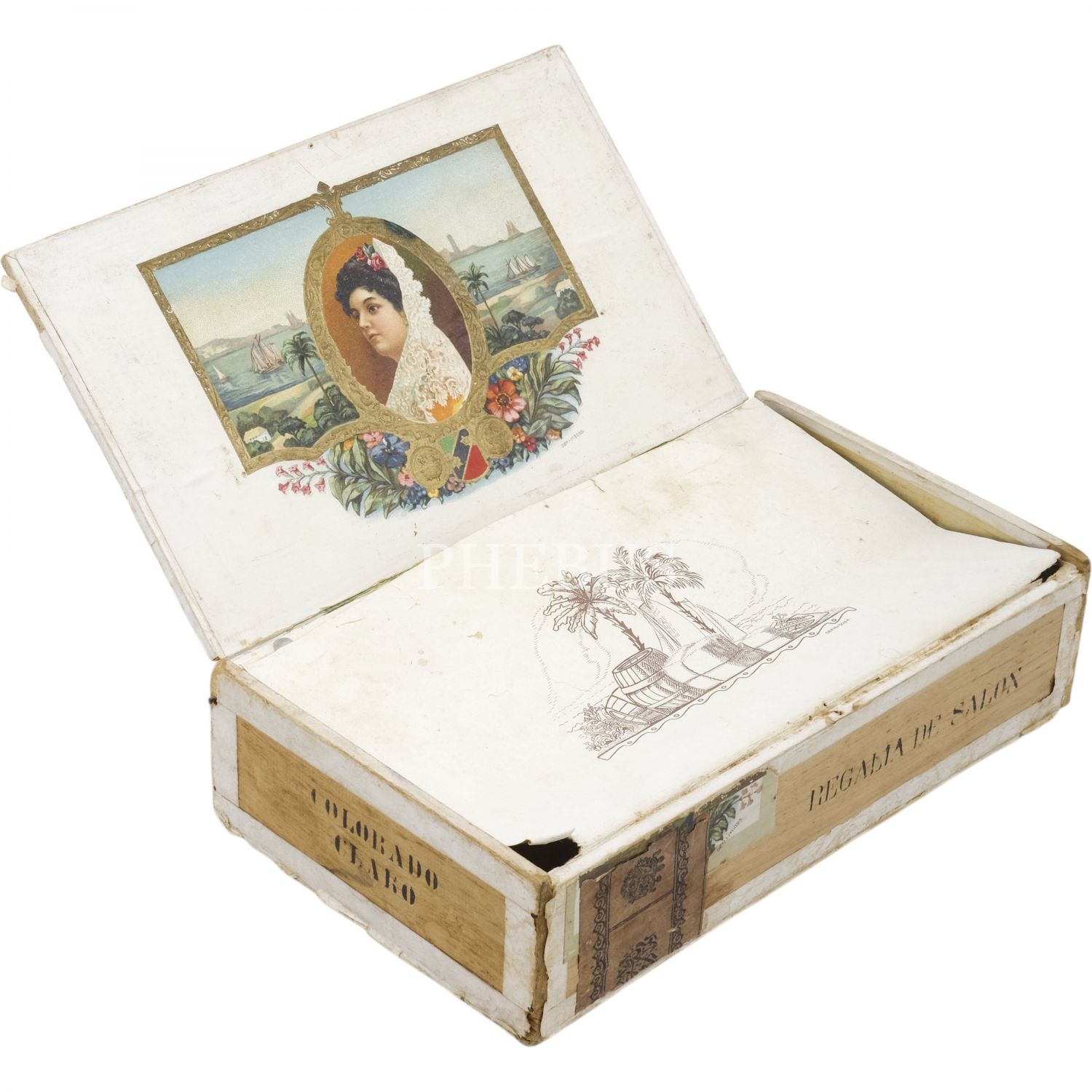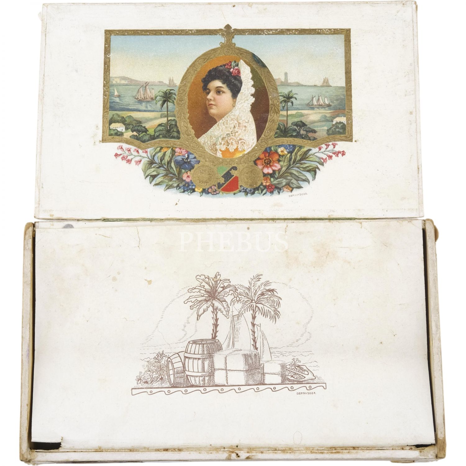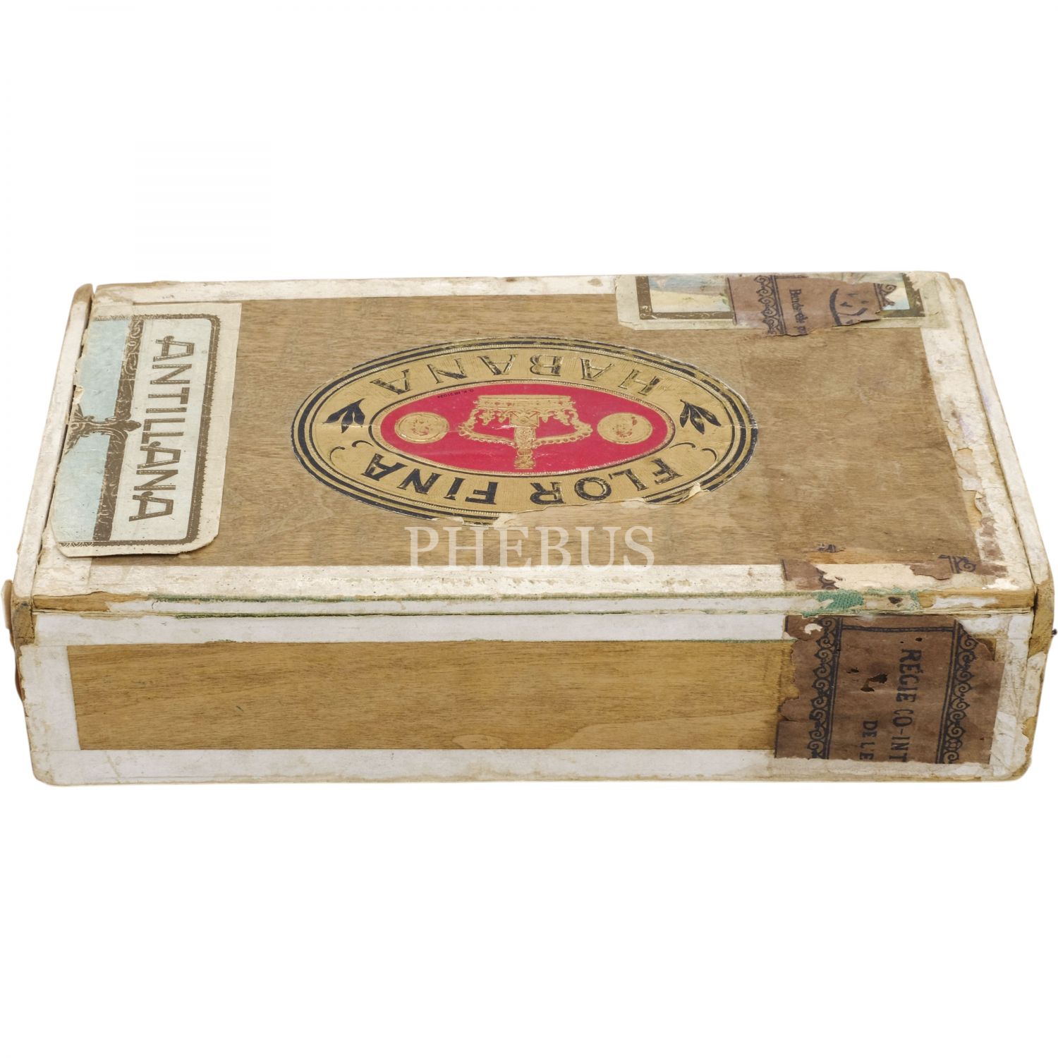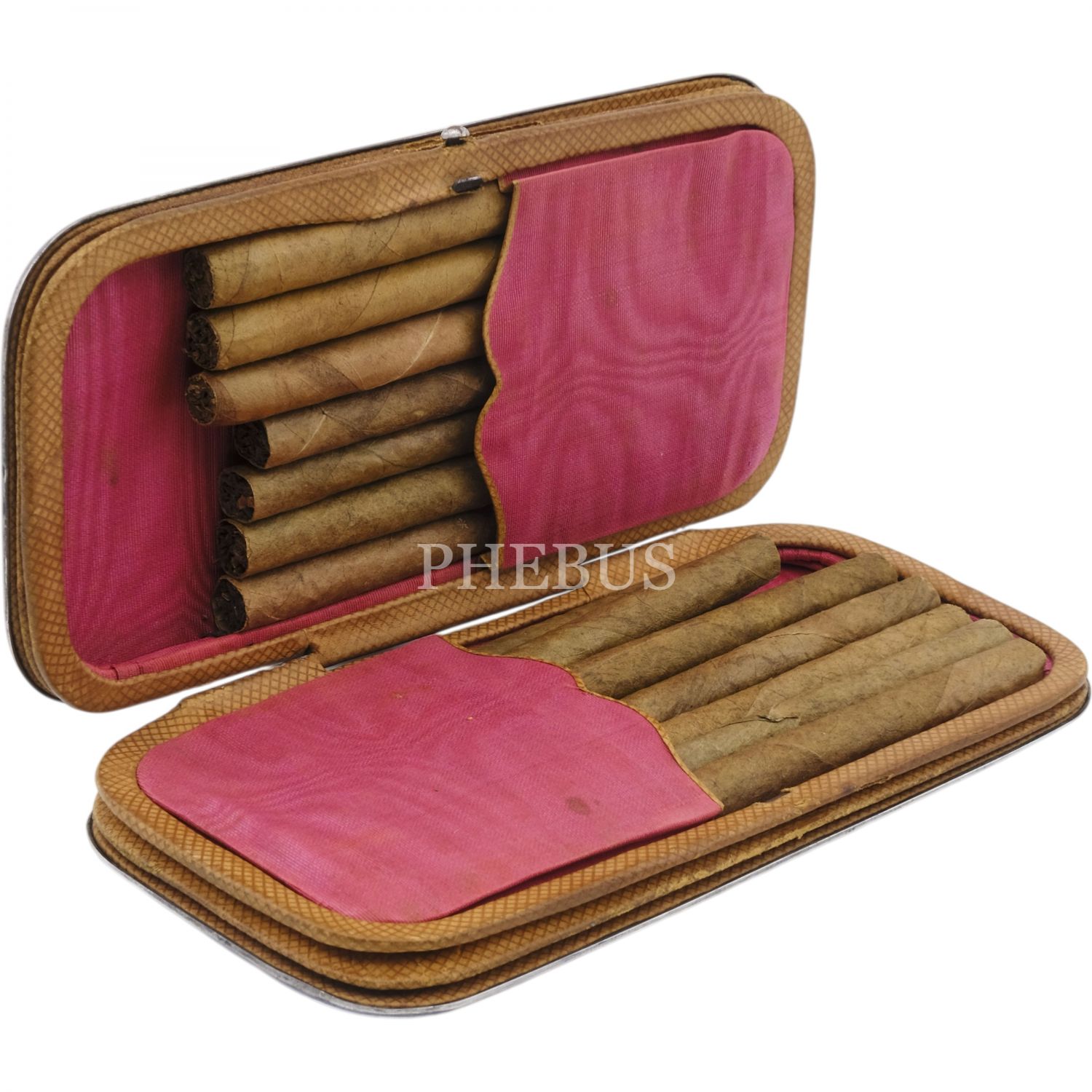Savat işçiliğiyle süslenmiş, kenarı deri körük detaylı, "D.D." inisiyalli gümüş puro tabakası ve Osmanlı´ya ithal edilmiş "Florfina Habana" marka puronun ahşap kutusu, 23x13x6 cm...