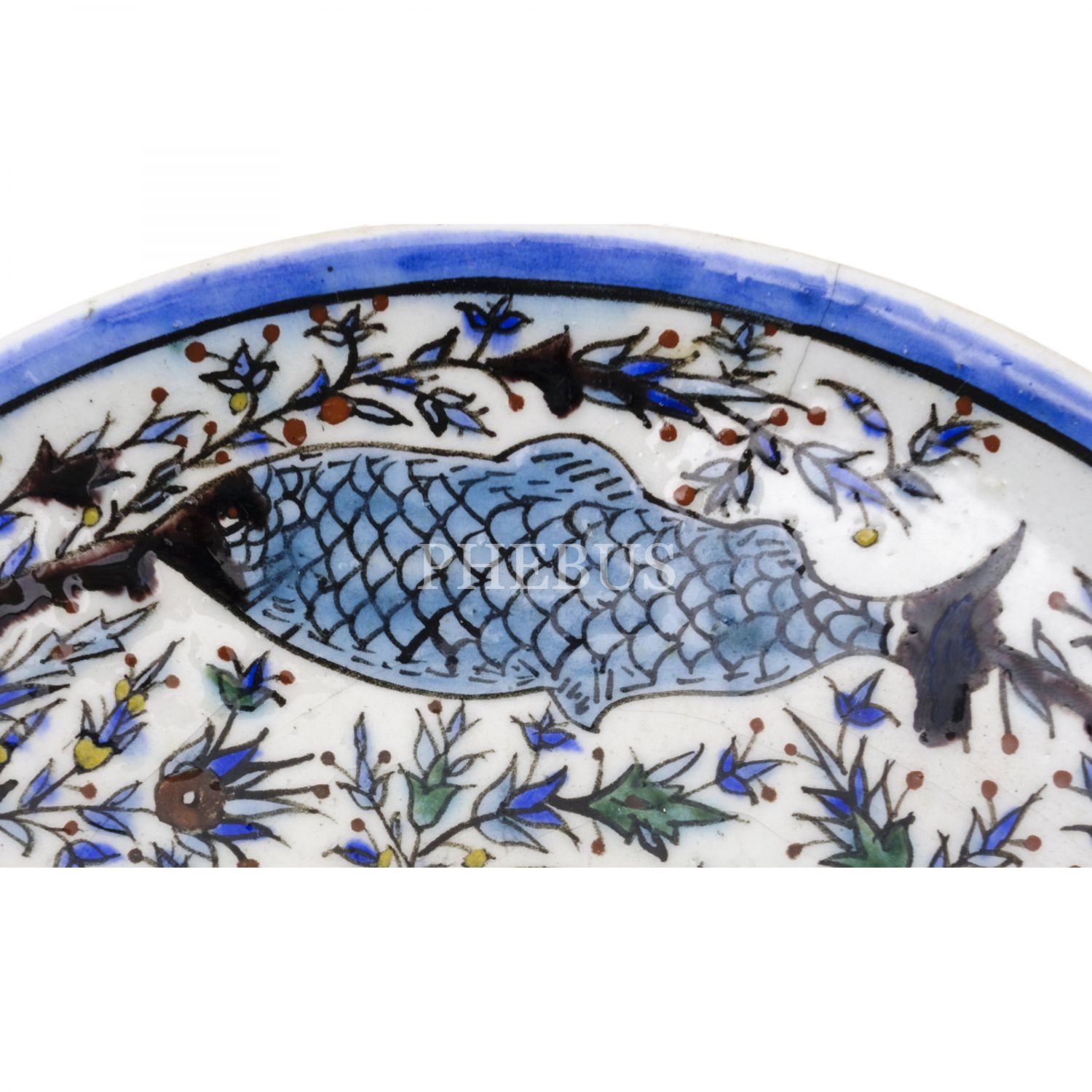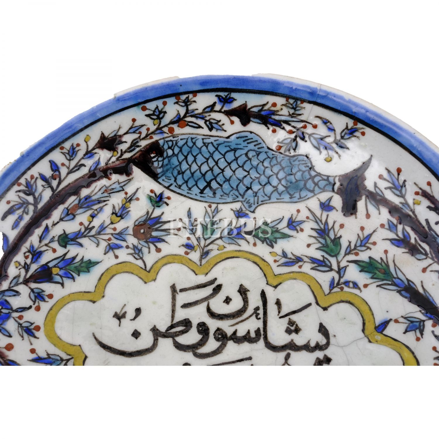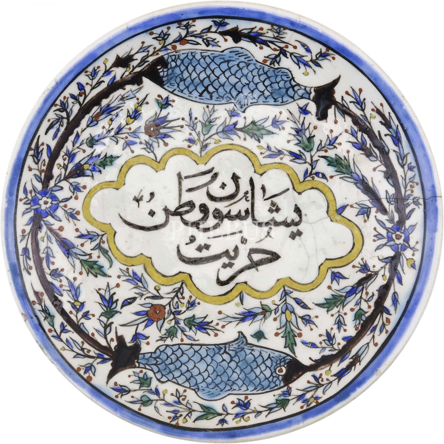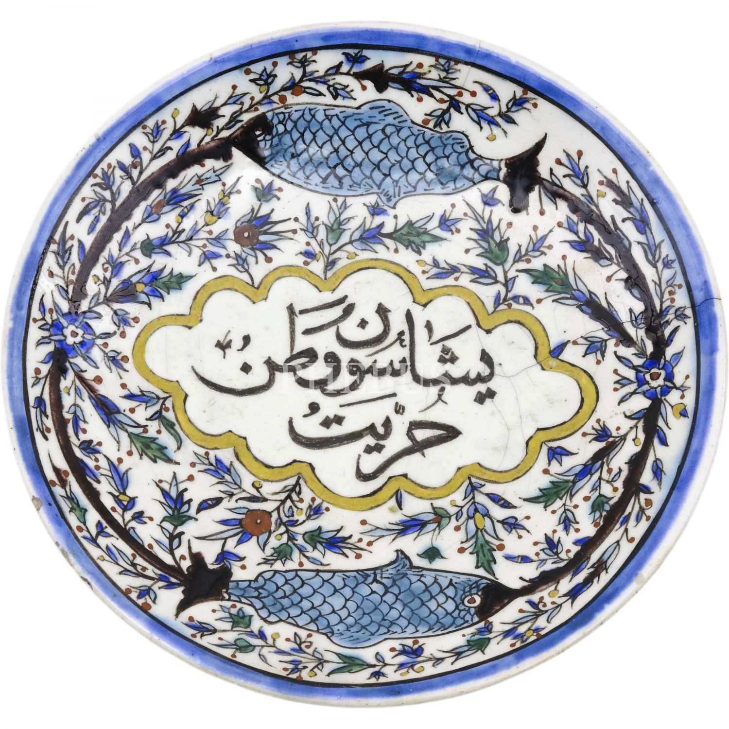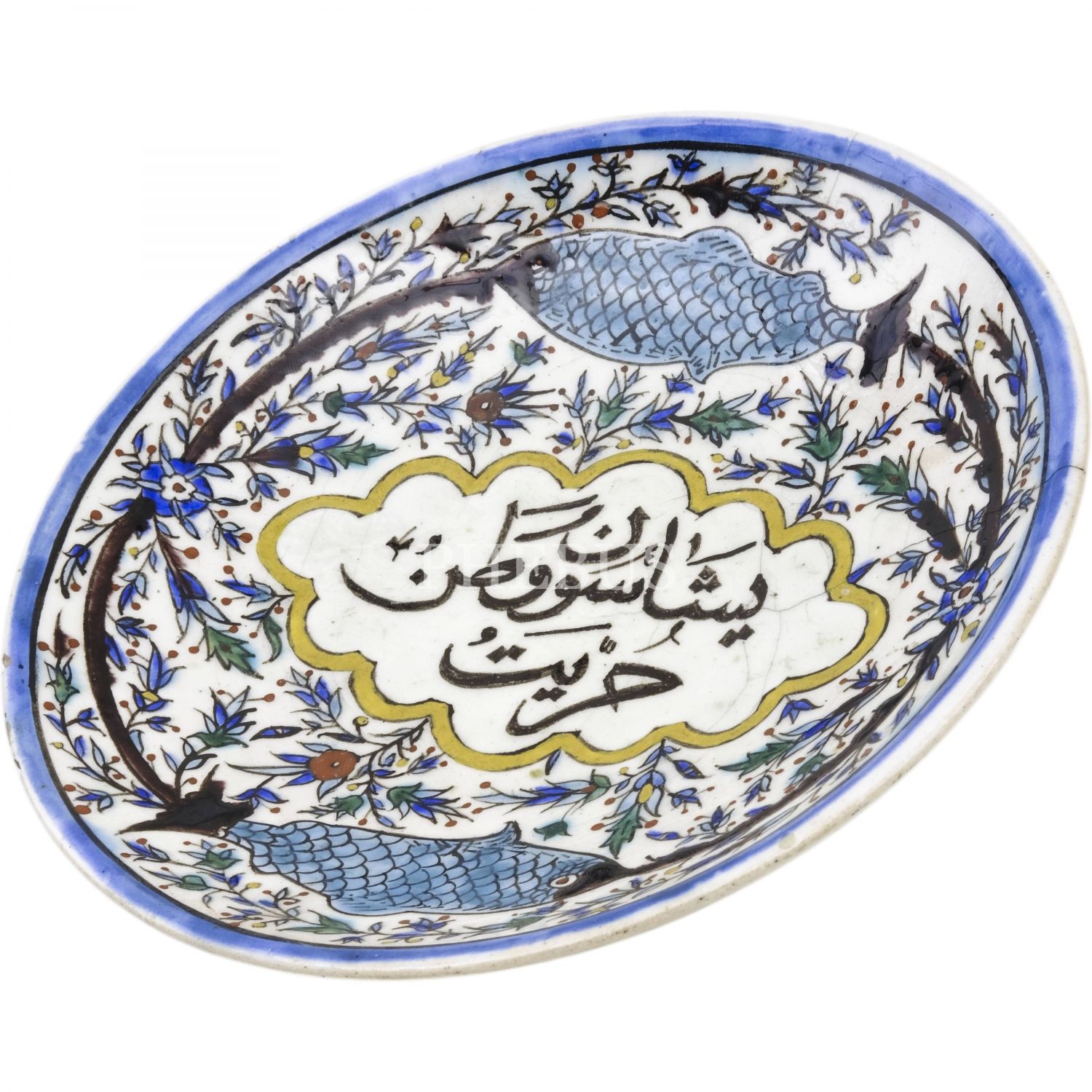 "Yaşasın Vatan ve Hürriyet" yazılı, geleneksel çini ve balık motifiyle süslenmiş, II. Meşrutiyet hatırası çini tabak, çap 23 cm...