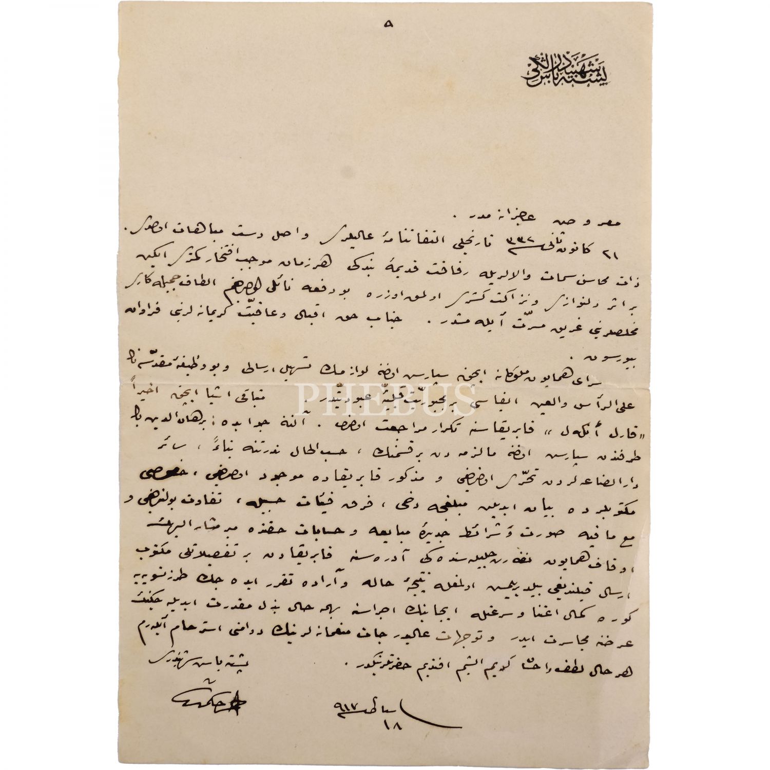 Peşte´de (Budapeşte) Osmanlı Devleti´ni temsil eden son başşehbender Ahmet Hikmet (Müftüoğlu)´in, Osmanlı Sarayı için Budapeşte´deki Karl Engel Fabrikası´ndan sipariş edilen malzemenin durumu hakkında Evkaf Nezareti´ne hitaben el yazısıyla kaleme alıp imzaladığı mektubu, 18 Şubat 1917, 14x20 cm...
