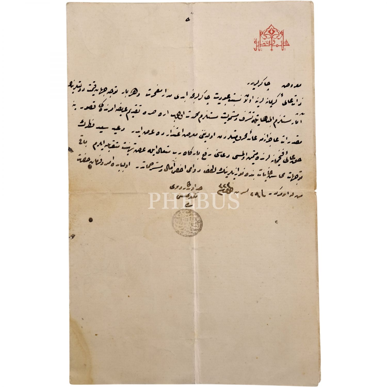 Süleyman Nazif´in el yazısıyla, "Süleyman Nazif" antetli kağıt üzerine kaleme alıp mührünü bastığı mektubu, 14x21 cm...