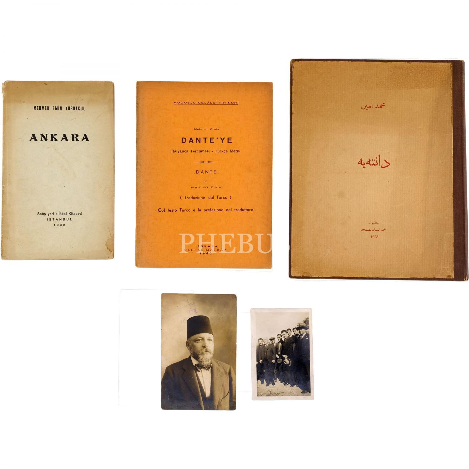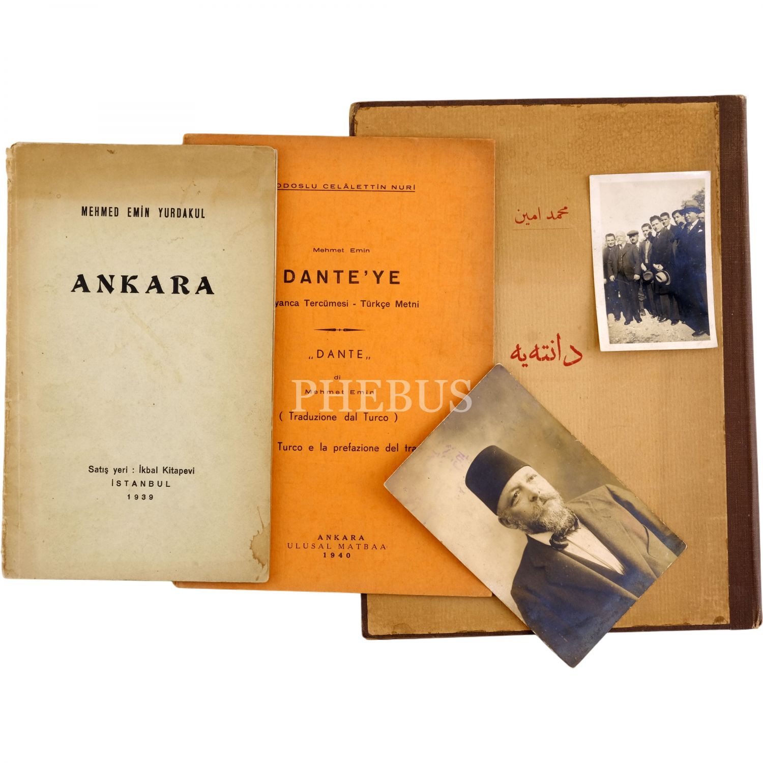 Lot içeriği: 1) ANKARA (İthaflı ve imzalı), 1939, İkbal Kitapevi, 22 sayfa, 14x23 cm. 2) Rodoslu Celâlettin Nuri´nin, Yurdakul´un DANTE´YE adlı eserini İtalyanca tercümesiyle bir araya getirdiği kitabı: 1940, Ulusal Matbaa, 40 sayfa, 16x24 cm. 3) Mehmet Emin Yurdakul´un gençlerle birlikte görüldüğü bir fotoğrafı, 6x9 cm. 4) Mehmet Emin Yurdakul´un, Resna Fotoğrafhanesi´nde çekilmiş bir portre fotoğrafı, 9x14 cm...