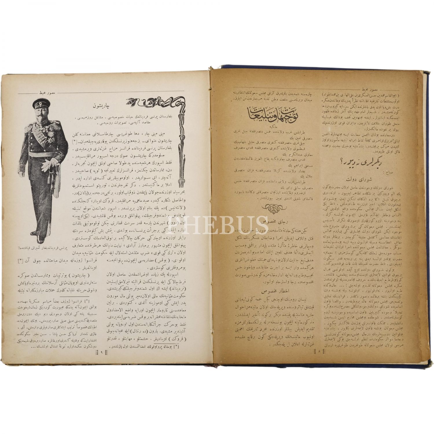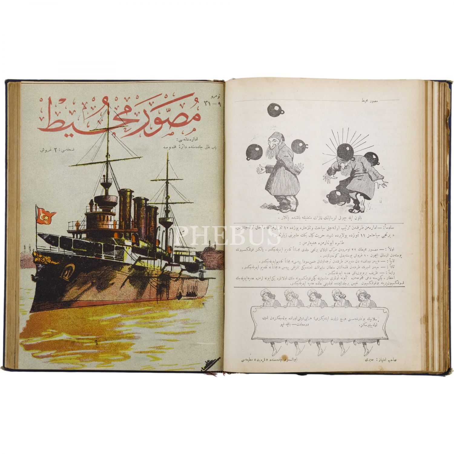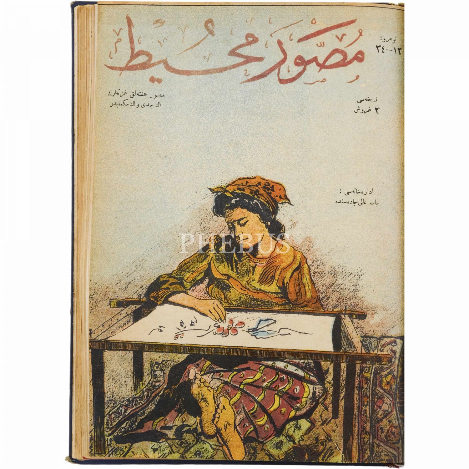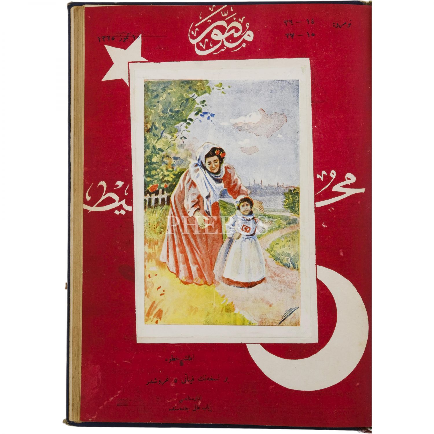 Hanedan tacı ve "F" inisiyalli özel cildinde, "MUSAVVER MUHİT" dergisinin Nisan 1325 ila Temmuz 1325 arasında yayımlanan 14 sayısı, 20x28 cm...