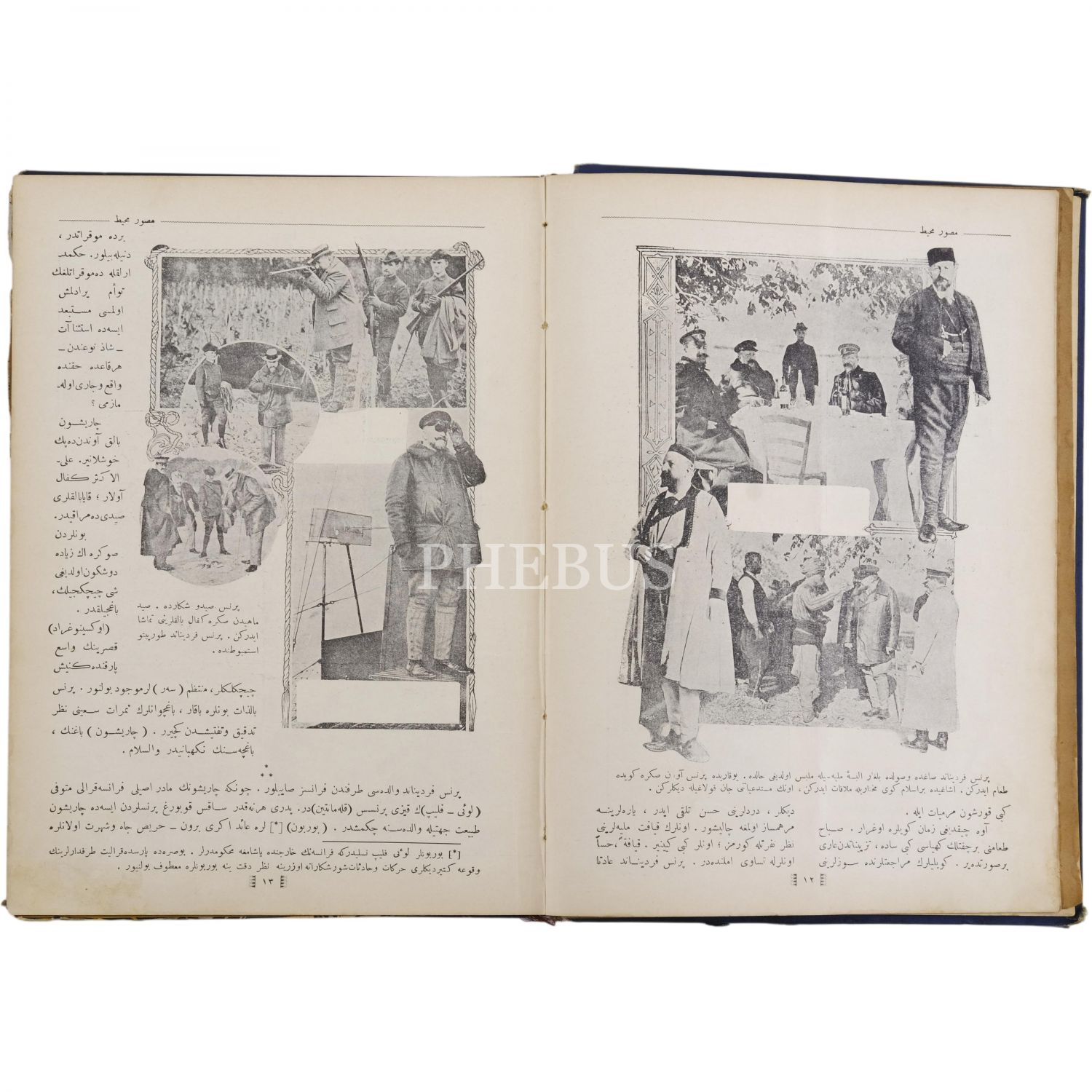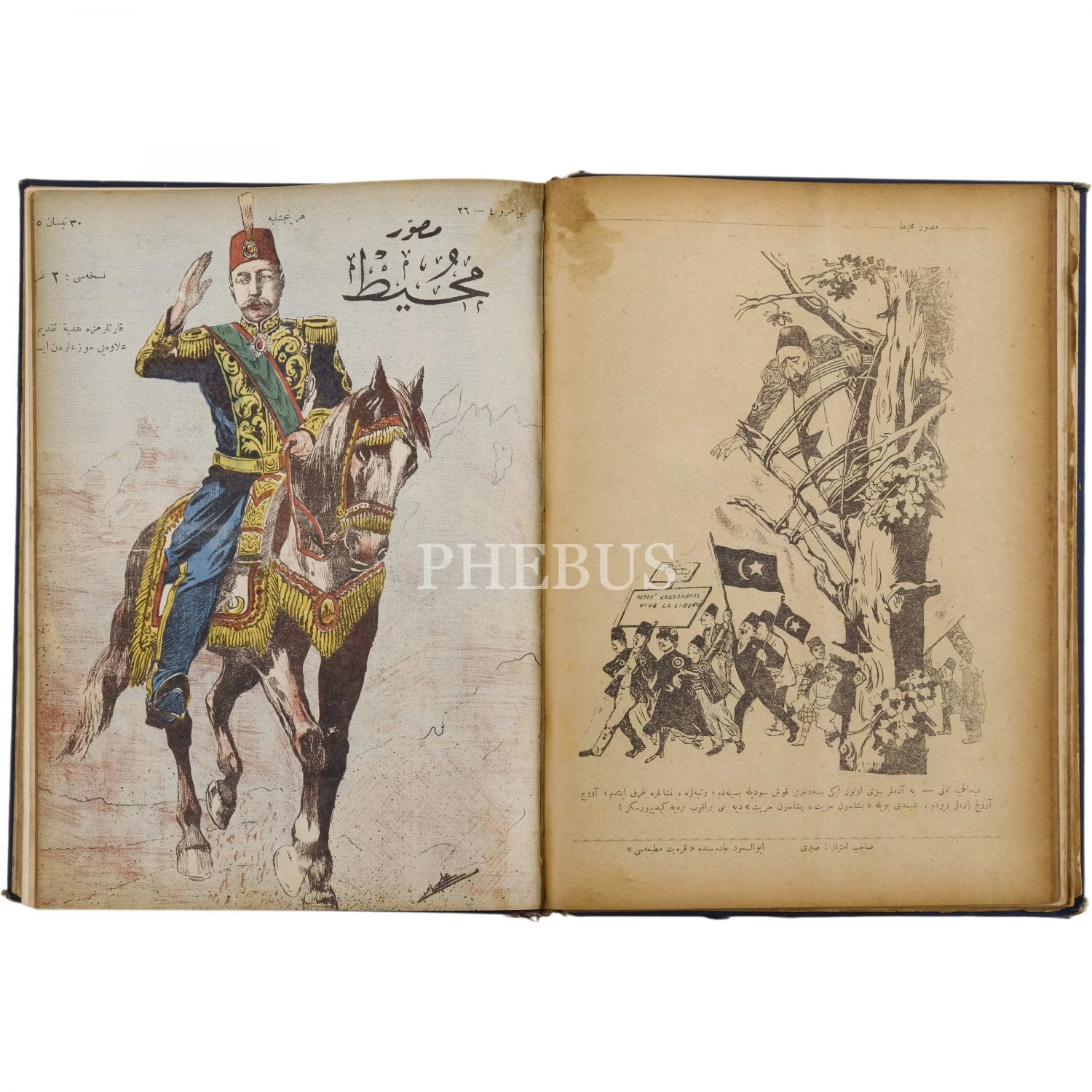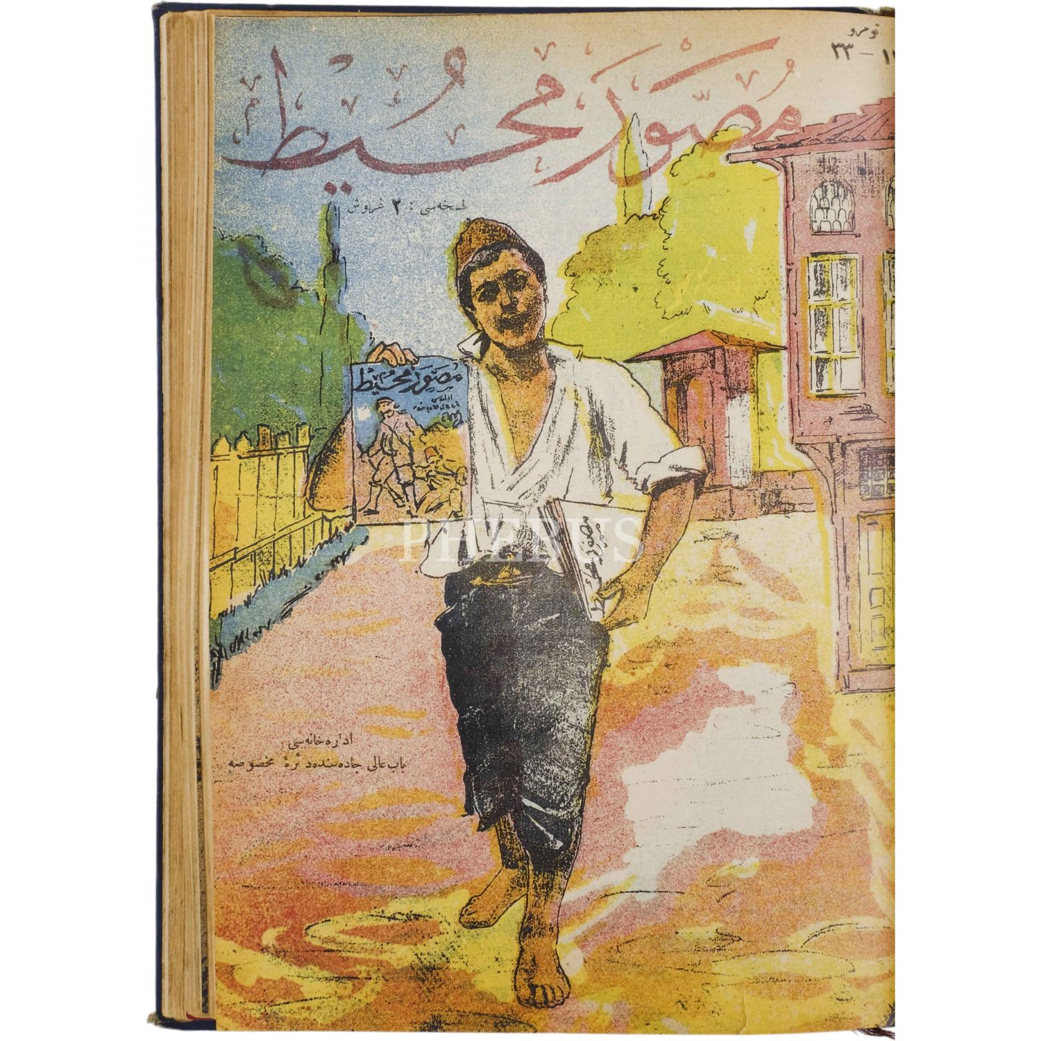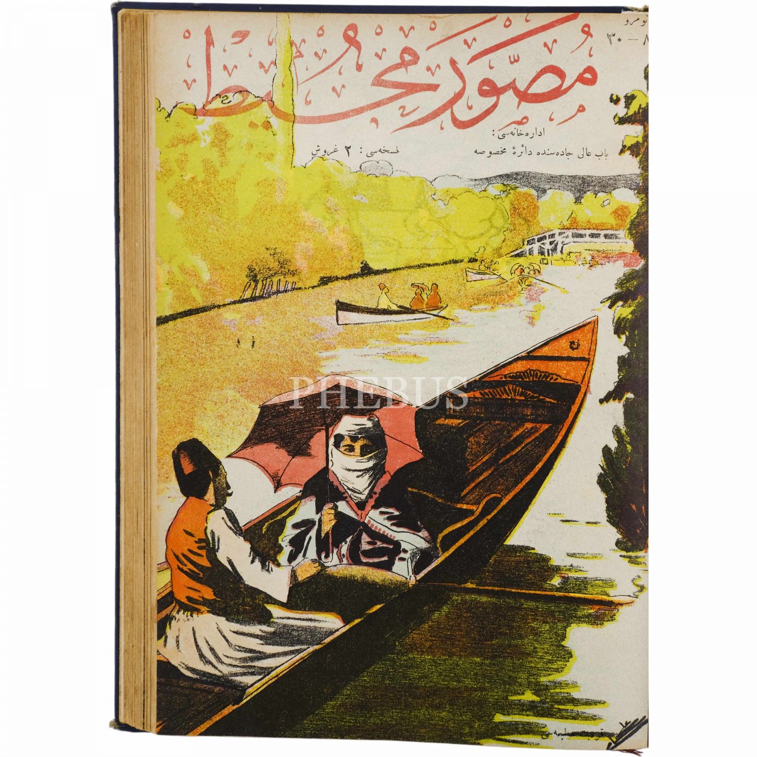 Hanedan tacı ve "F" inisiyalli özel cildinde, "MUSAVVER MUHİT" dergisinin Nisan 1325 ila Temmuz 1325 arasında yayımlanan 14 sayısı, 20x28 cm...