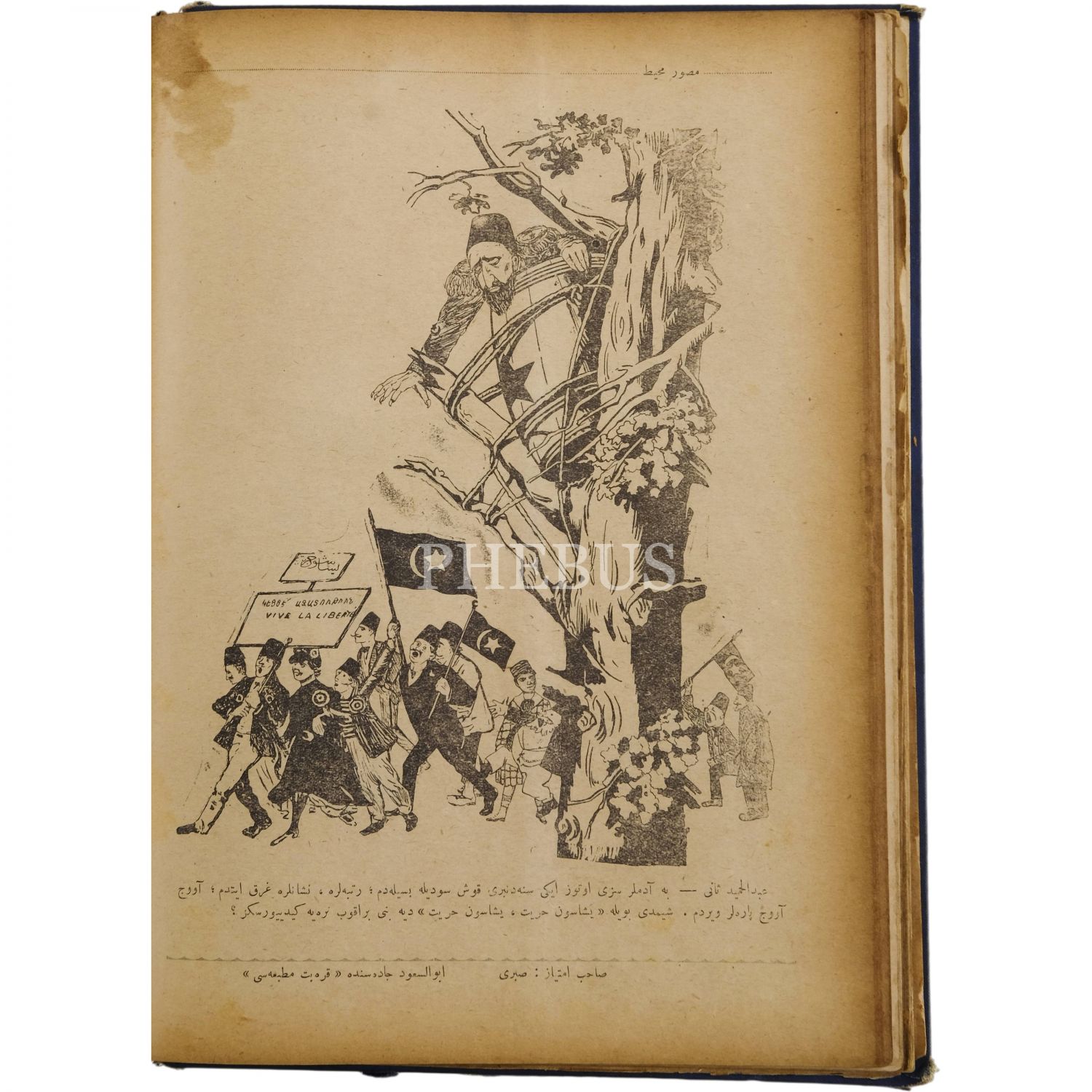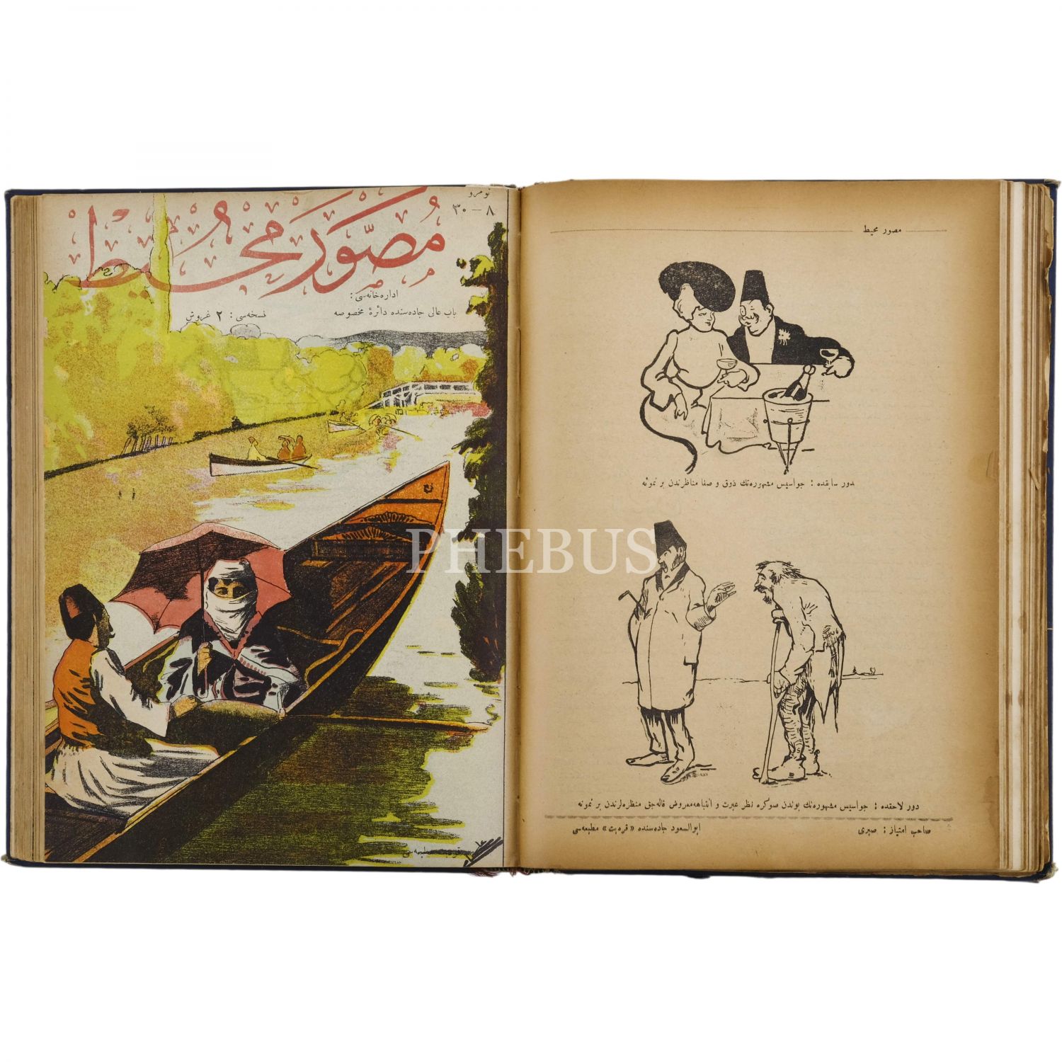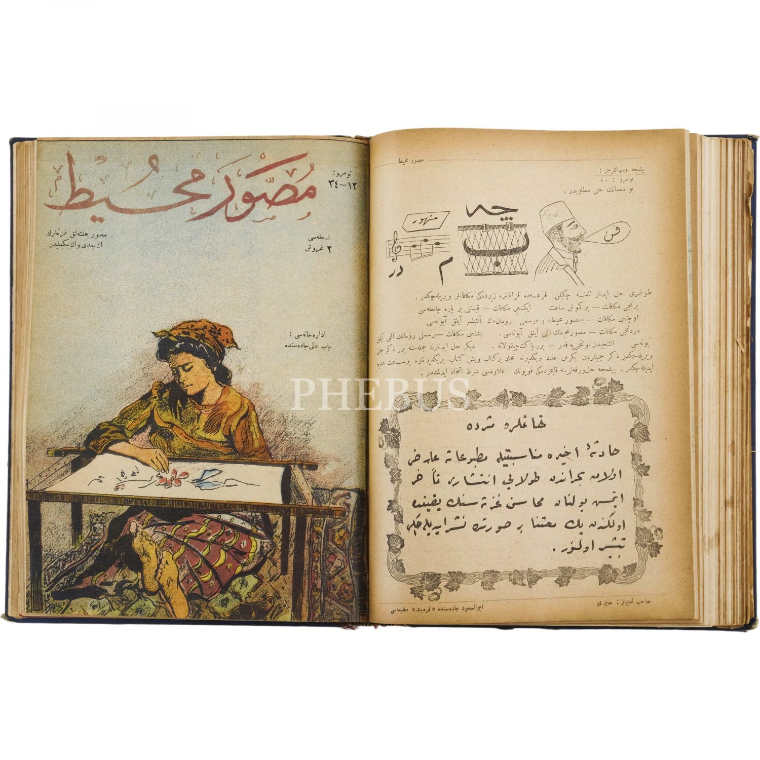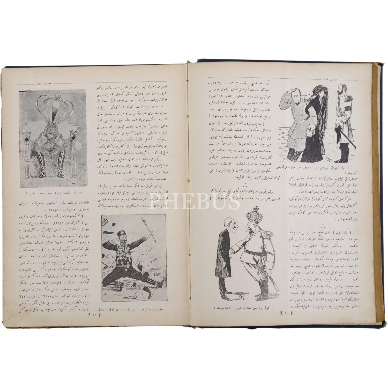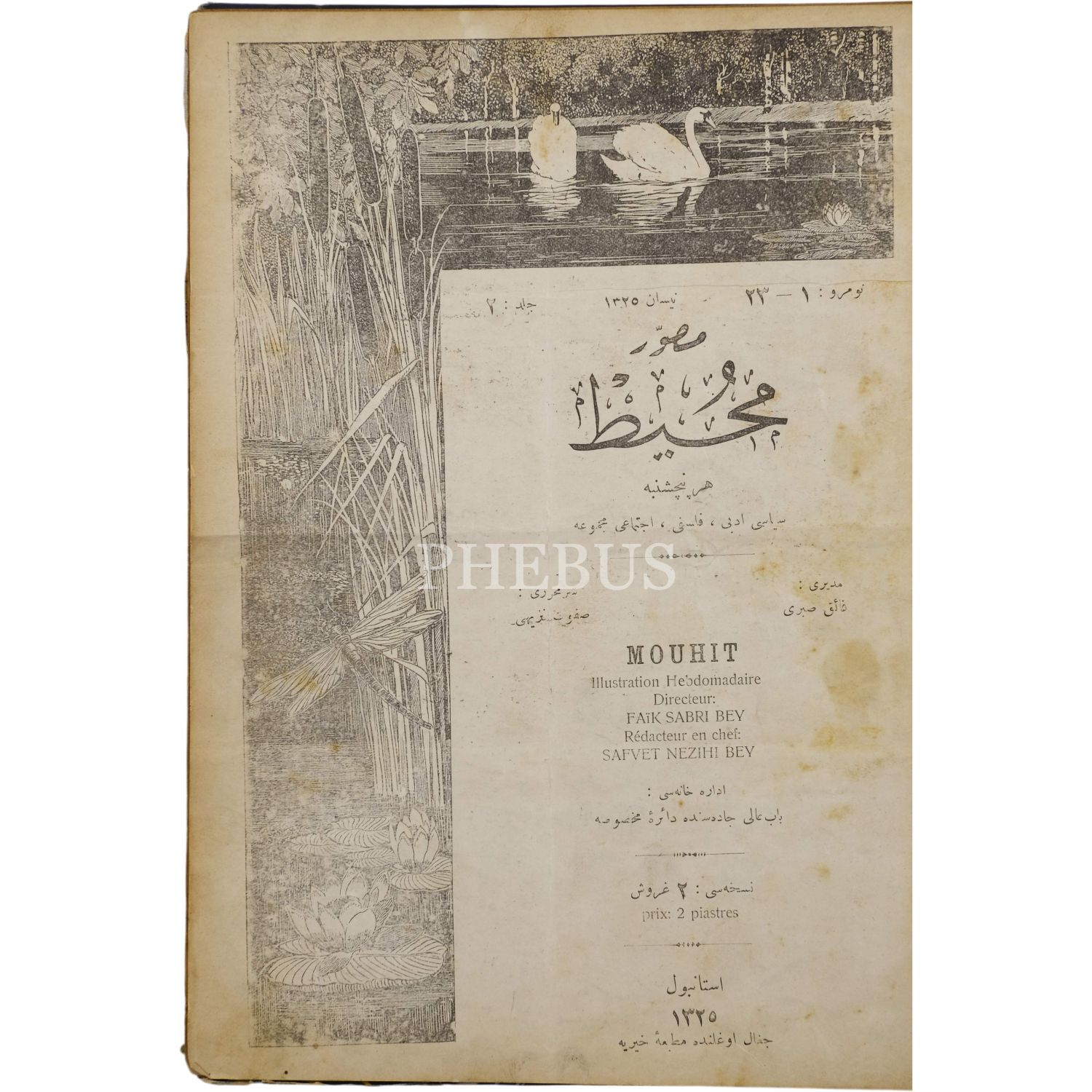 Hanedan tacı ve "F" inisiyalli özel cildinde, "MUSAVVER MUHİT" dergisinin Nisan 1325 ila Temmuz 1325 arasında yayımlanan 14 sayısı, 20x28 cm...