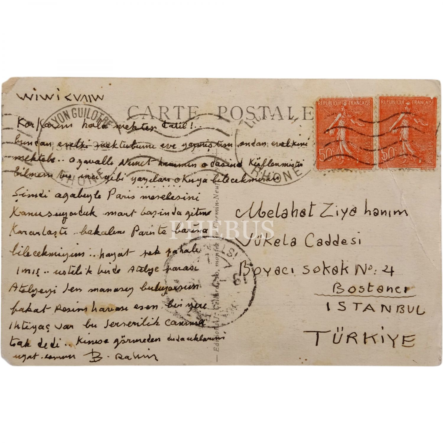 "Korkarım hala mektep tatil!.. Bundan evvelki mektubumu eve yazmıştım, ondan evvelkini mektebe... O zavallı Nimet Hanımın odasında küflenmiştir. Bilmem bu inci gibi yazıları okuyabilecek misin. Şimdi ağabeyle Paris meselesini konuşuyorduk. Mart başında gitme kararlaştı. Bakalım Paris´te barınabilecek miyim... Hayat pek pahalı imiş... Üstelik bir de Atelye parası. Atelyeyi sen manasız buluyorsun fakat resim havası esen bir yere ihtiyaç var. Bu serserilik canıma tak dedi... Kimse görmeden dudaklarını uzat canım. B. Rahmi"