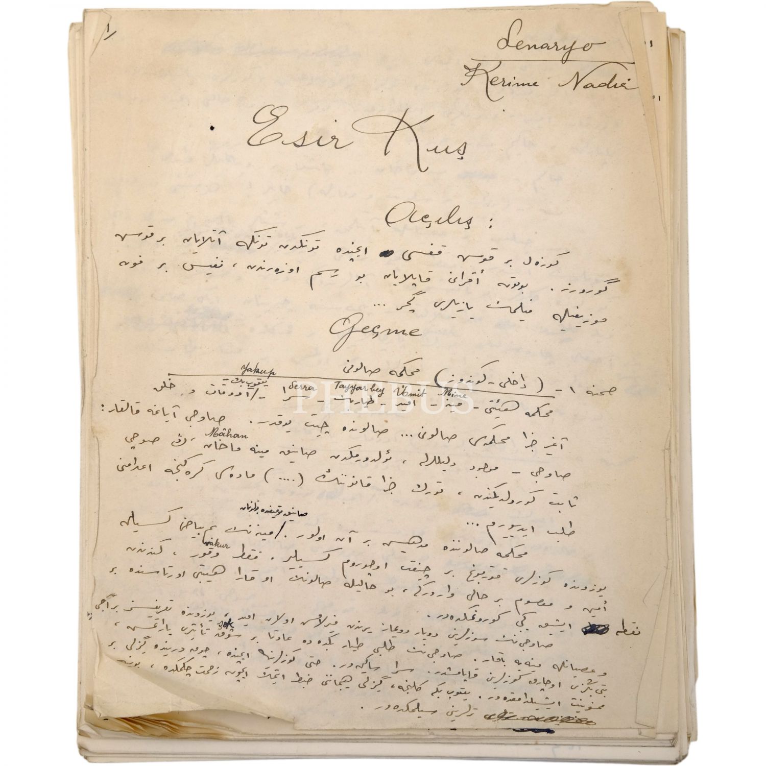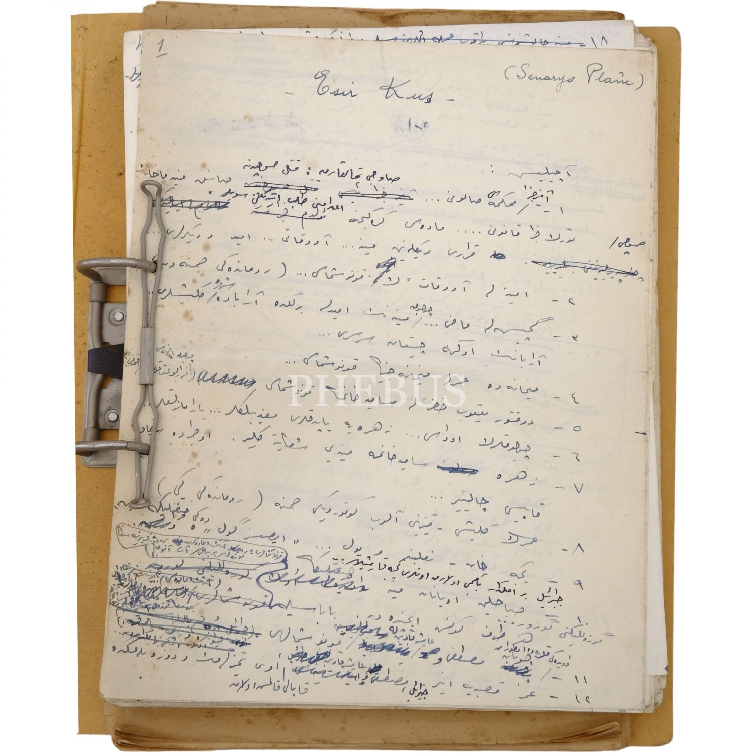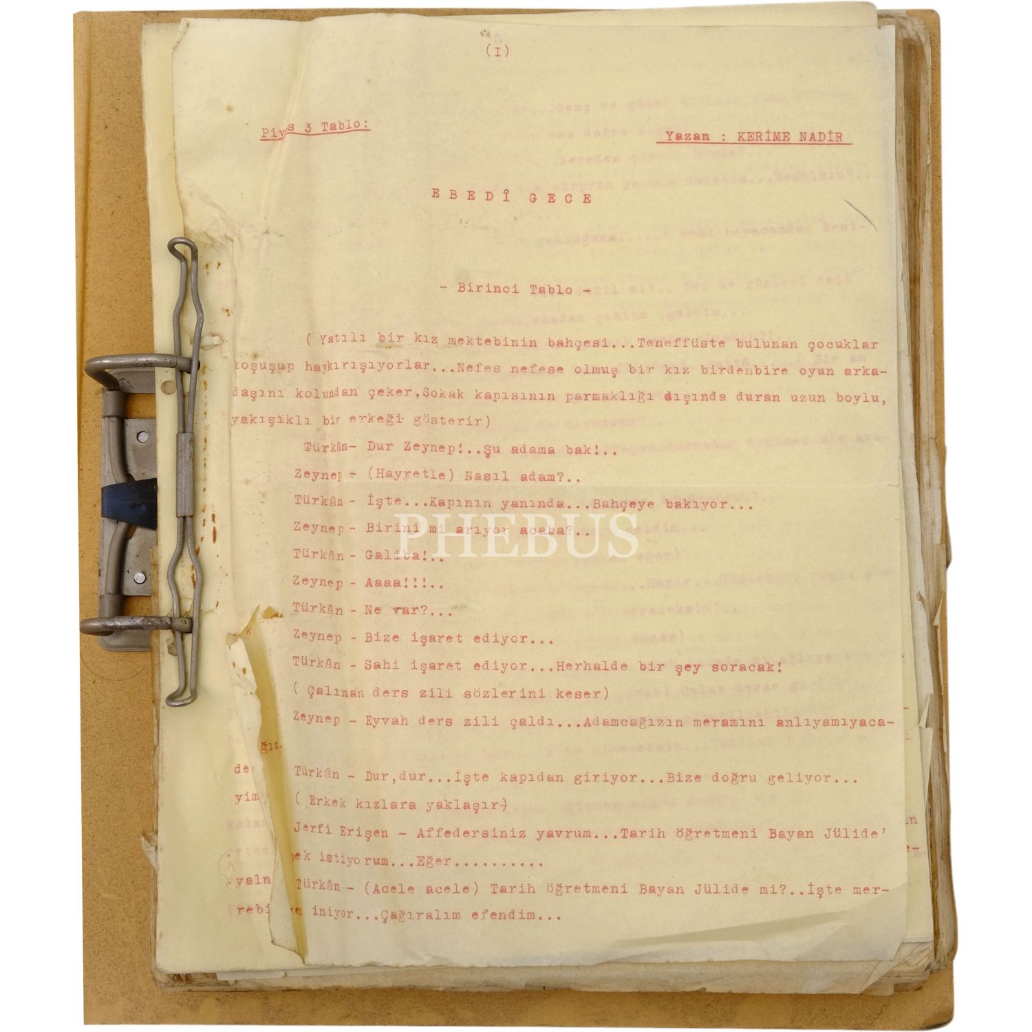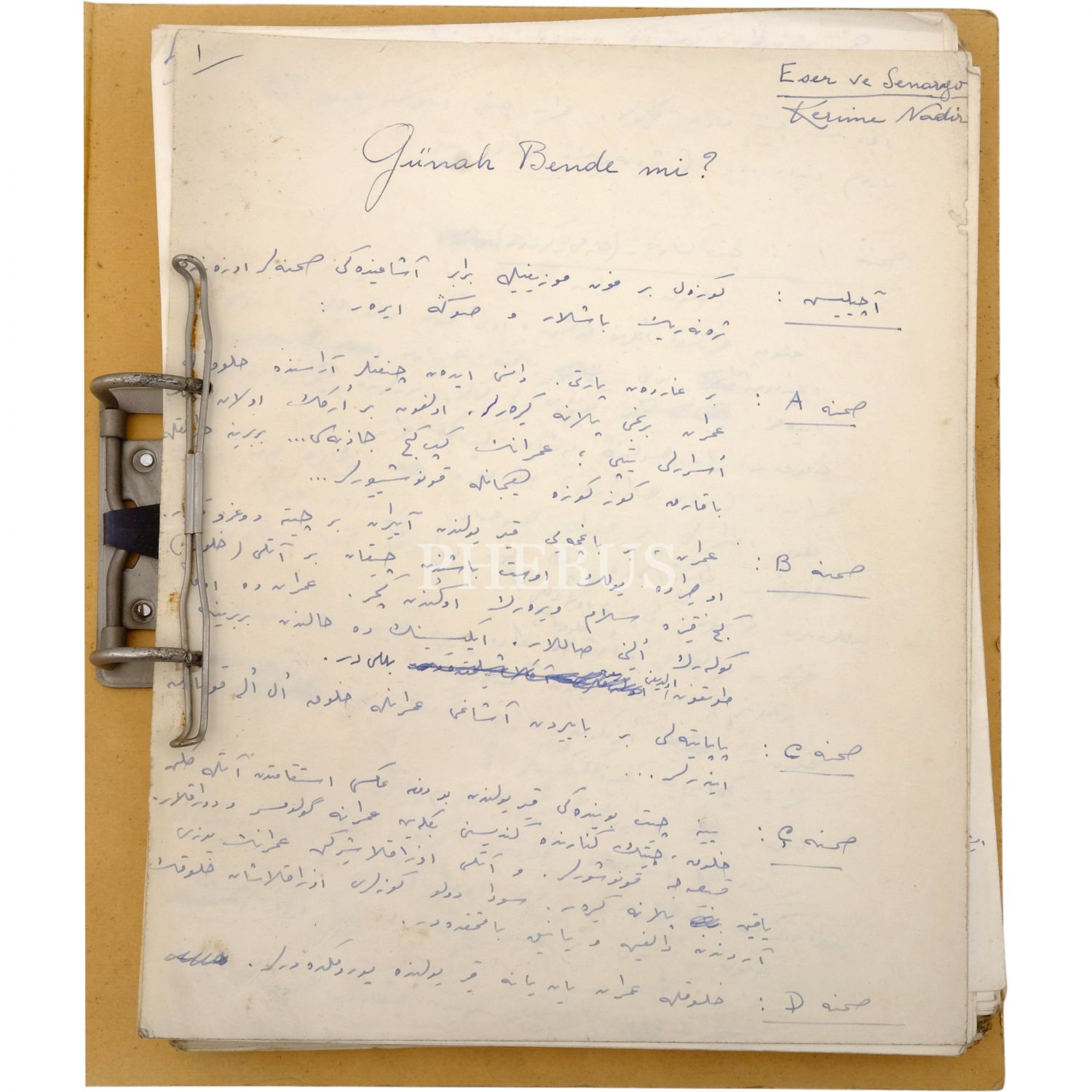 Lot içeriği: 1) SON BESTE (daktilo, 63 sayfa) - Senaryo: Dr. A. Alyanak - Diyalog: Kerime Nadir 2) SİSLİ HATIRALAR (daktilo, 114 sayfa) - "Acar Film Prodüksiyonu 1972" 3) Bir klasör içinde toplanmış çeşitli senaryolar: EBEDÎ GECE (daktilo, 25 sayfa) - Piyes: 3 tablo - Yazan: Kerime Nadir / SAMANYOLU (daktilo) - Eser ve senaryo: Kerime Nadir - Filme alacak: Nevzat Pesen / HIÇKIRIK (daktilo, 86 sayfa) - Senaryo: Kerime Nadir / SEVEN NE YAPMAZ (daktilo, 68 sayfa) - Senaryo: Kerime Nadir - Reji: Şadan Kamil / BOŞ YUVA (daktilo, 71 sayfa) - Senaryo: Kerime Nadir 4) Bir klasör içinde toplanmış senaryolar: GÜNAH BENDE Mİ? (Osmanlıca el yazısı) - Eser ve senaryo: Kerime Nadir / AŞK BEKLİYOR (Osmanlıca el yazısı) - Senaryo: Kerime Nadir / SİSLİ HATIRALAR (Osmanlıca el yazısı) - Senaryo: Kerime Nadir 5) Bir klasör içinde toplanmış senaryo planları: ESİR KUŞ (Osmanlıca el yazısı [senaryo planı]) / SAADET TACI (Osmanlıca el yazısı [senaryo planı, 16 Mart 1963]) / POSTA GÜVERCİNİ (Osmanlıca el yazısı [senaryo planı, 2 Şubat 1962]) / GÜNAH BENDE Mİ? (Osmanlıca el yazısı [senaryo planı]) / HANDAN (Osmanlıca el yazısı [senaryo planı]) 6) Bir dosya içine yerleştirilmiş ESİR KUŞ senaryosu (Osmanlıca el yazısı, 177 + 31 sayfa)