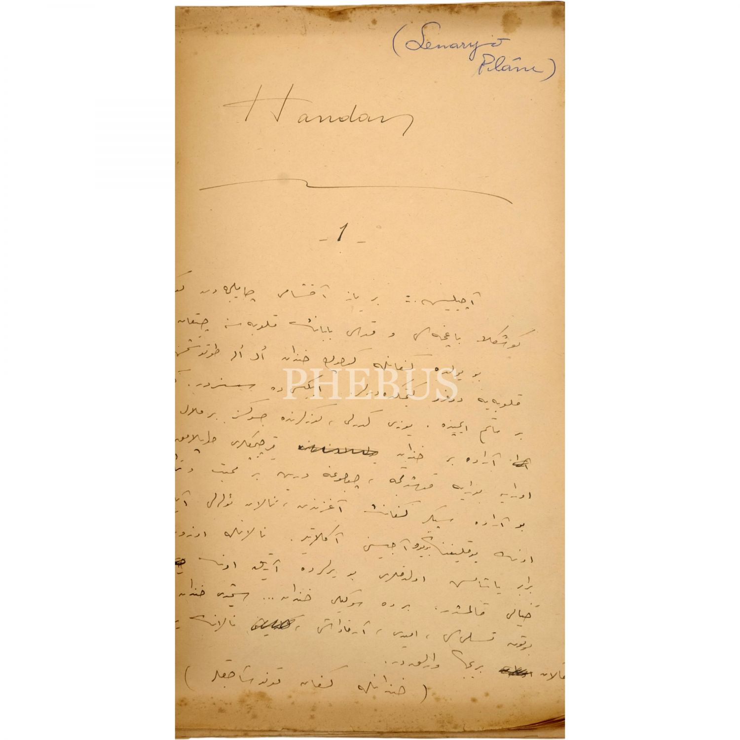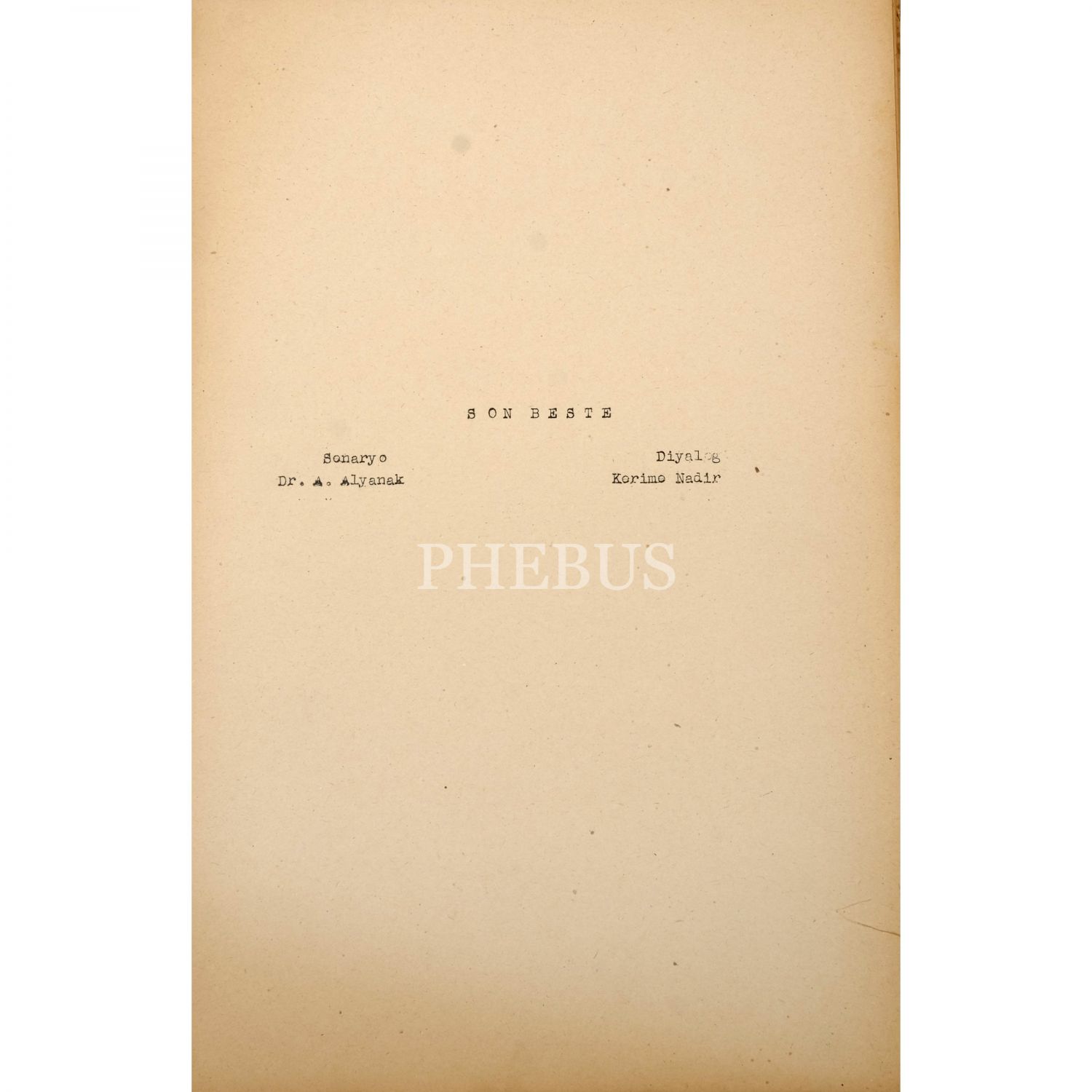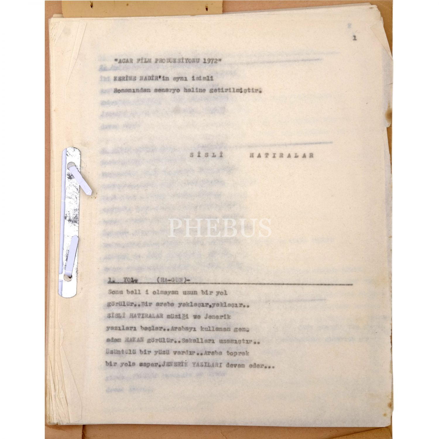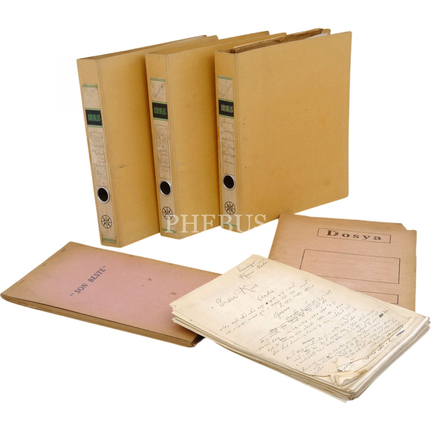 Lot içeriği: 1) SON BESTE (daktilo, 63 sayfa) - Senaryo: Dr. A. Alyanak - Diyalog: Kerime Nadir 2) SİSLİ HATIRALAR (daktilo, 114 sayfa) - "Acar Film Prodüksiyonu 1972" 3) Bir klasör içinde toplanmış çeşitli senaryolar: EBEDÎ GECE (daktilo, 25 sayfa) - Piyes: 3 tablo - Yazan: Kerime Nadir / SAMANYOLU (daktilo) - Eser ve senaryo: Kerime Nadir - Filme alacak: Nevzat Pesen / HIÇKIRIK (daktilo, 86 sayfa) - Senaryo: Kerime Nadir / SEVEN NE YAPMAZ (daktilo, 68 sayfa) - Senaryo: Kerime Nadir - Reji: Şadan Kamil / BOŞ YUVA (daktilo, 71 sayfa) - Senaryo: Kerime Nadir 4) Bir klasör içinde toplanmış senaryolar: GÜNAH BENDE Mİ? (Osmanlıca el yazısı) - Eser ve senaryo: Kerime Nadir / AŞK BEKLİYOR (Osmanlıca el yazısı) - Senaryo: Kerime Nadir / SİSLİ HATIRALAR (Osmanlıca el yazısı) - Senaryo: Kerime Nadir 5) Bir klasör içinde toplanmış senaryo planları: ESİR KUŞ (Osmanlıca el yazısı [senaryo planı]) / SAADET TACI (Osmanlıca el yazısı [senaryo planı, 16 Mart 1963]) / POSTA GÜVERCİNİ (Osmanlıca el yazısı [senaryo planı, 2 Şubat 1962]) / GÜNAH BENDE Mİ? (Osmanlıca el yazısı [senaryo planı]) / HANDAN (Osmanlıca el yazısı [senaryo planı]) 6) Bir dosya içine yerleştirilmiş ESİR KUŞ senaryosu (Osmanlıca el yazısı, 177 + 31 sayfa)