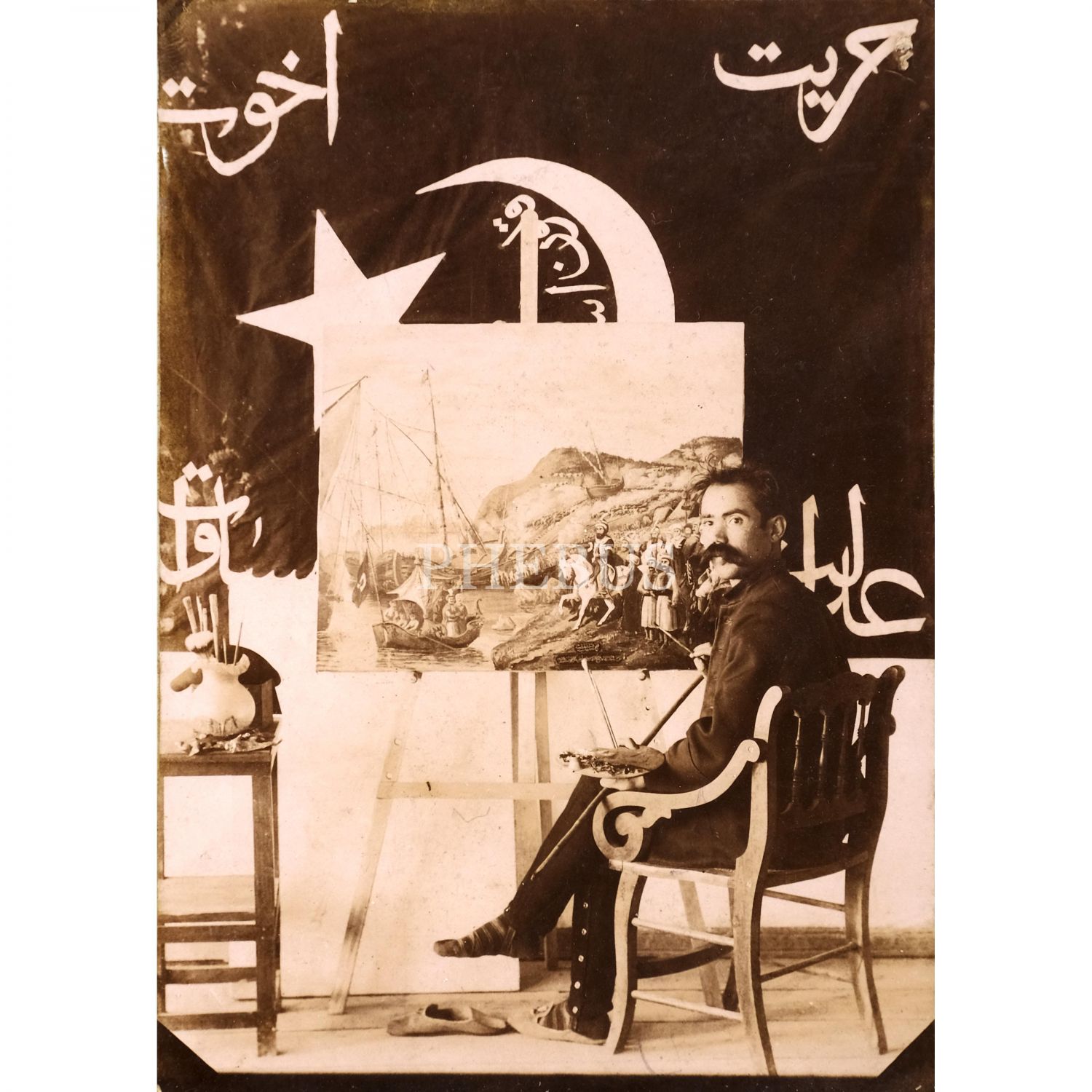 Türk resminin asker ressamlar kuşağından Hasan Rıza´nın, duvarında "Adalet, Hürriyet, Uhuvvet, Musavaat" yazılı bir sancağın asılı olduğu atölyesinde Fatih Sultan Mehmet´in gemilerini karadan yürütmesini konu alan resmini çizerken çekilmiş fotoğrafı, fotoğraf 12x16 cm, çerçeve 27x33 cm...