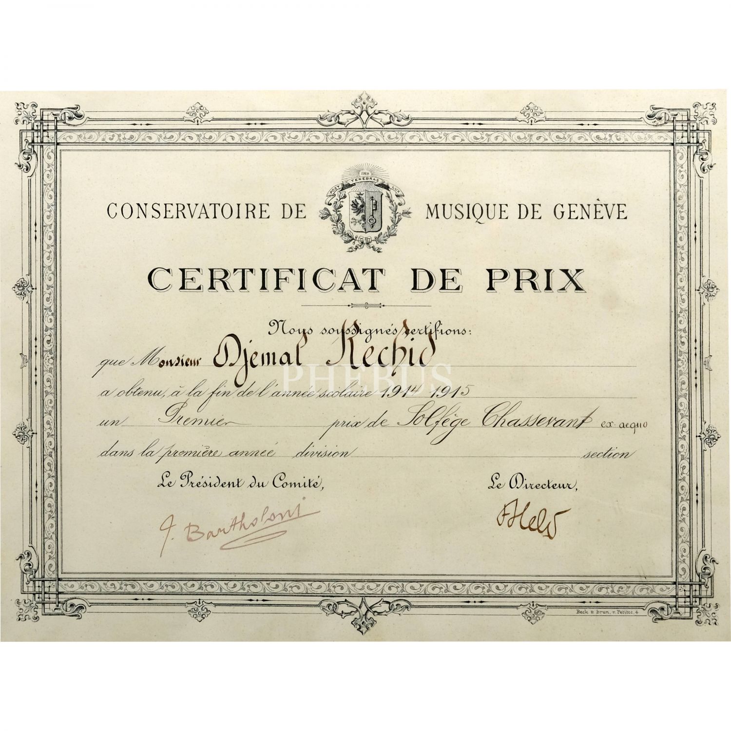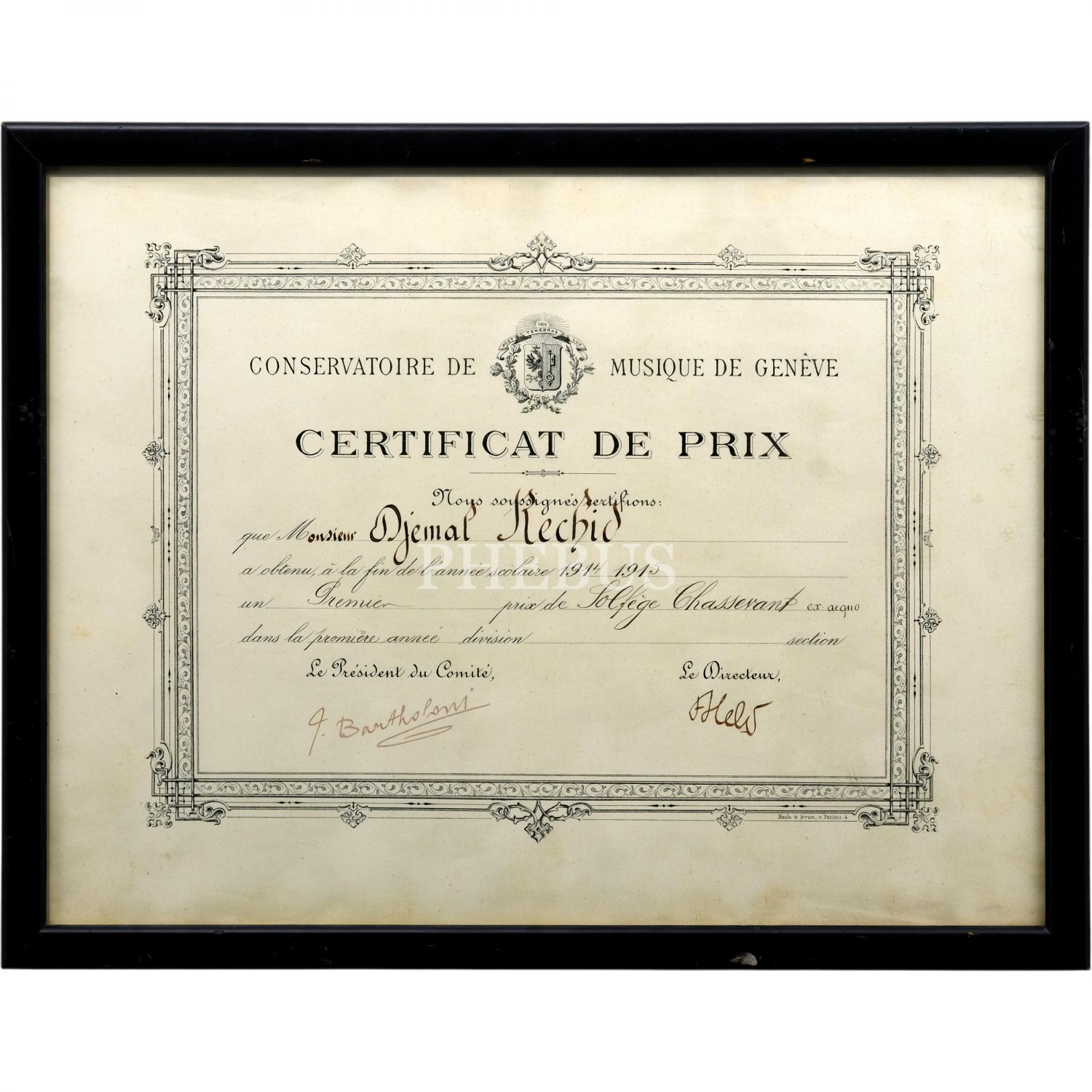 Birinci Dünya Savaşı sırasında annesiyle birlikte İsviçre’ye gidip Cenevre’ye yerleşen Cemal Reşid Rey, burada St. Antoine Koleji ile Cenevre Konservatuvarı’nda eğitimine devam etmiştir. Konservatuvarda piyano ve teori eğitimi alan Cemal Reşid, burada ustalık sınıfına kadar yükselmeyi başarmıştır... Ödül sertifikası Komite Başkanı (J. Bartholoni) ve Direktör (Held) tarafından imzalanmıştır. Cemal Reşid´e “Premier prix” (birincilik) verildiğini gösteren sertifikada yer alan “ex aequo” ibaresi; birinciliğin bir başkasıyla ortak/eşitlik halinde kazanılmış olduğunu belirtmektedir.