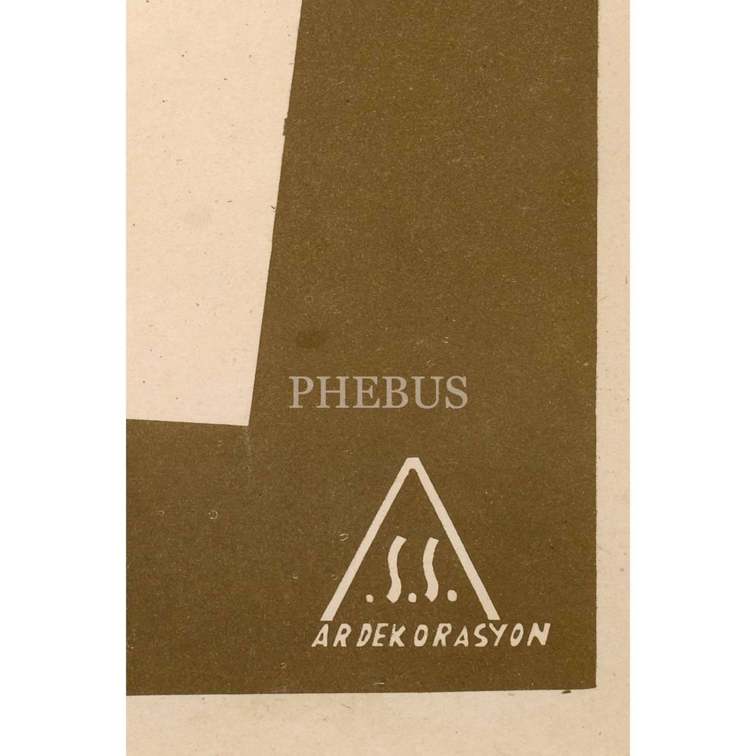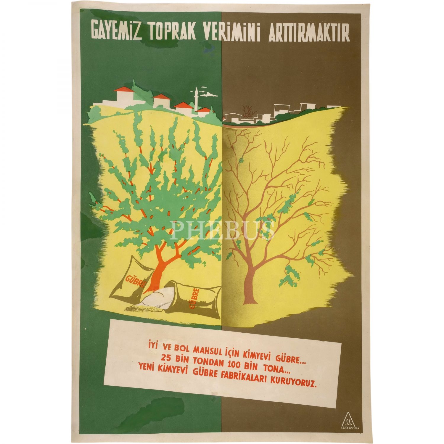 Yeni kurulan Kimyevi Gübre Fabrikaları sayesinde elde edilen mahsulün artışını konu alan, "Gayemiz Toprak Verimini Arttırmaktır / İyi ve Bol Mahsul İçin Kimyevi Gübre... 25 Bin Tondan 100 Bin Tona... Yeni Kimyevi Gübre Fabrikaları Kuruyoruz." yazılı afiş, Ar Dekorasyon, 70x102 cm...