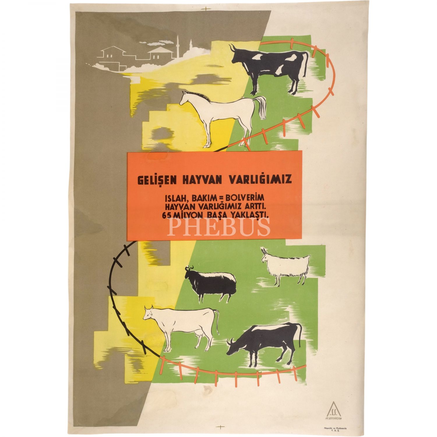 Türkiye´de hayvancılığın gelişimini konu alan, "Gelişen Hayvan Varlığımız / Islak, Bakım = Bol Verim. Hayvan Varlığımız Arttı. 65 Milyon Başa Yaklaştı." yazılı afiş, Ar Dekorasyon, Klişecilik ve Matbaacılık T.A.Ş., 70x102 cm...