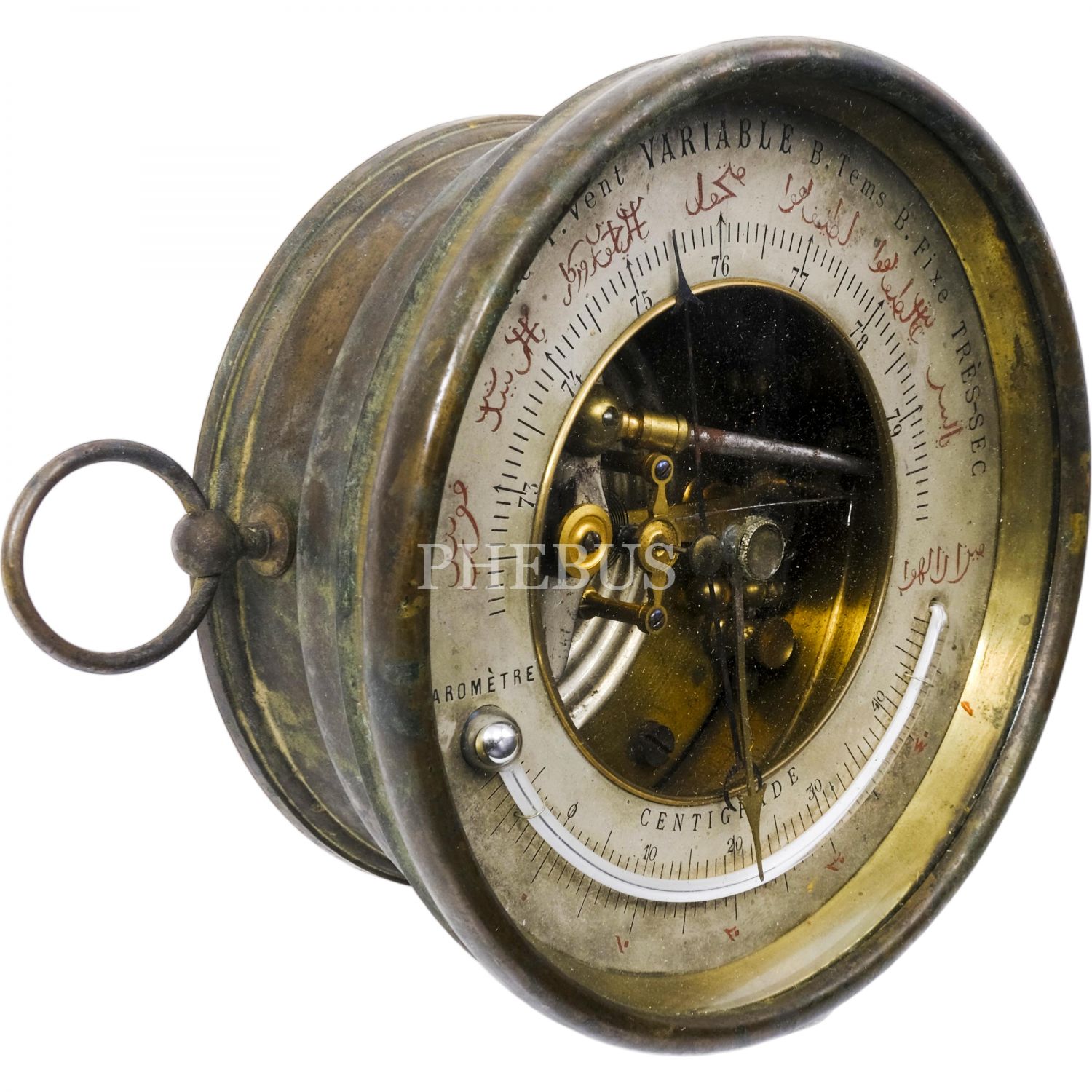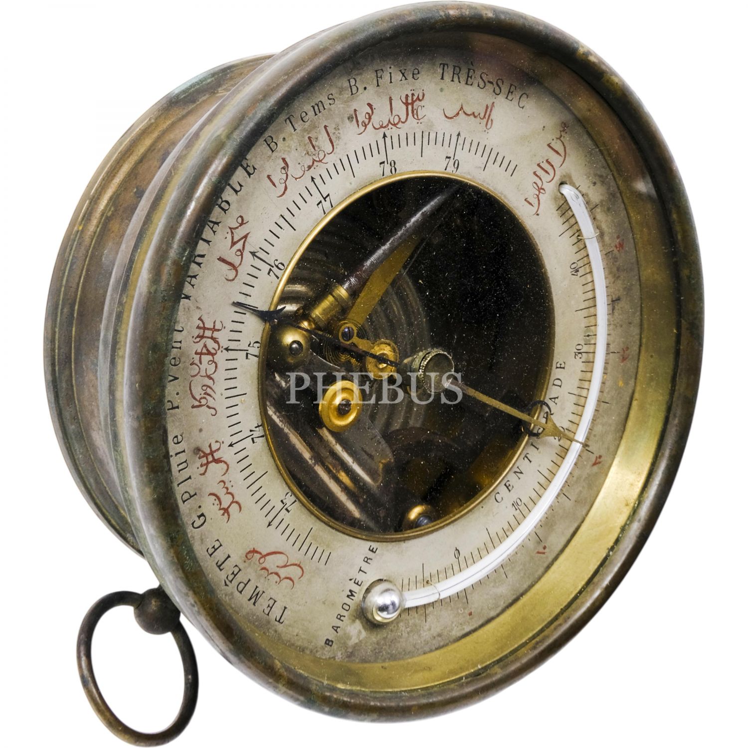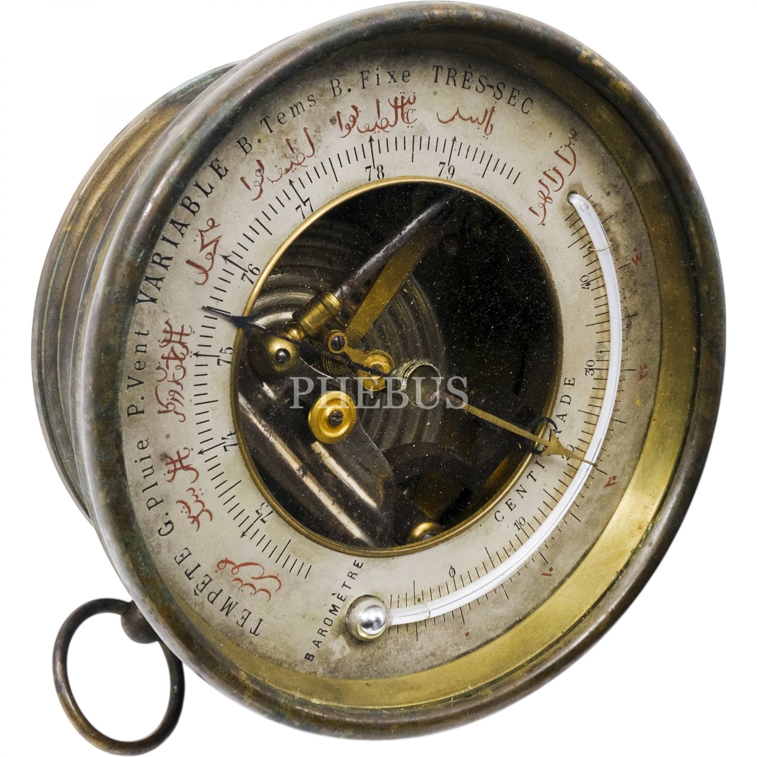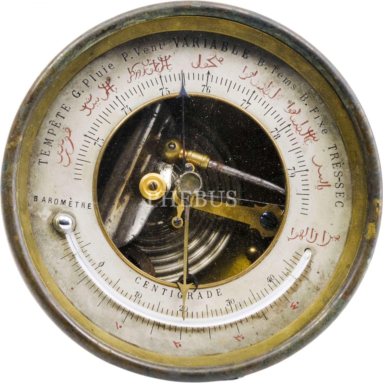 Kadranında havanın durumunu açıklayan Osmanlıca ve Fransızca açıklamaların yer aldığı, Osmanlı döneminden barometre ve reomür termometresi (sıcaklık ölçüm aracı), çap 14 cm...