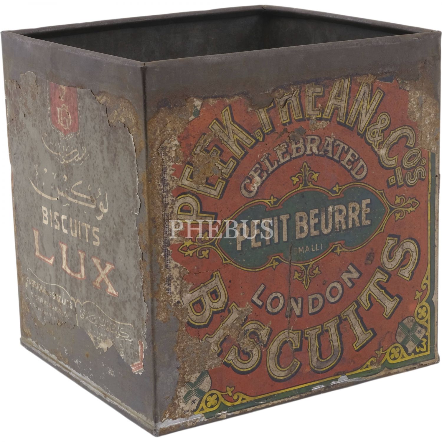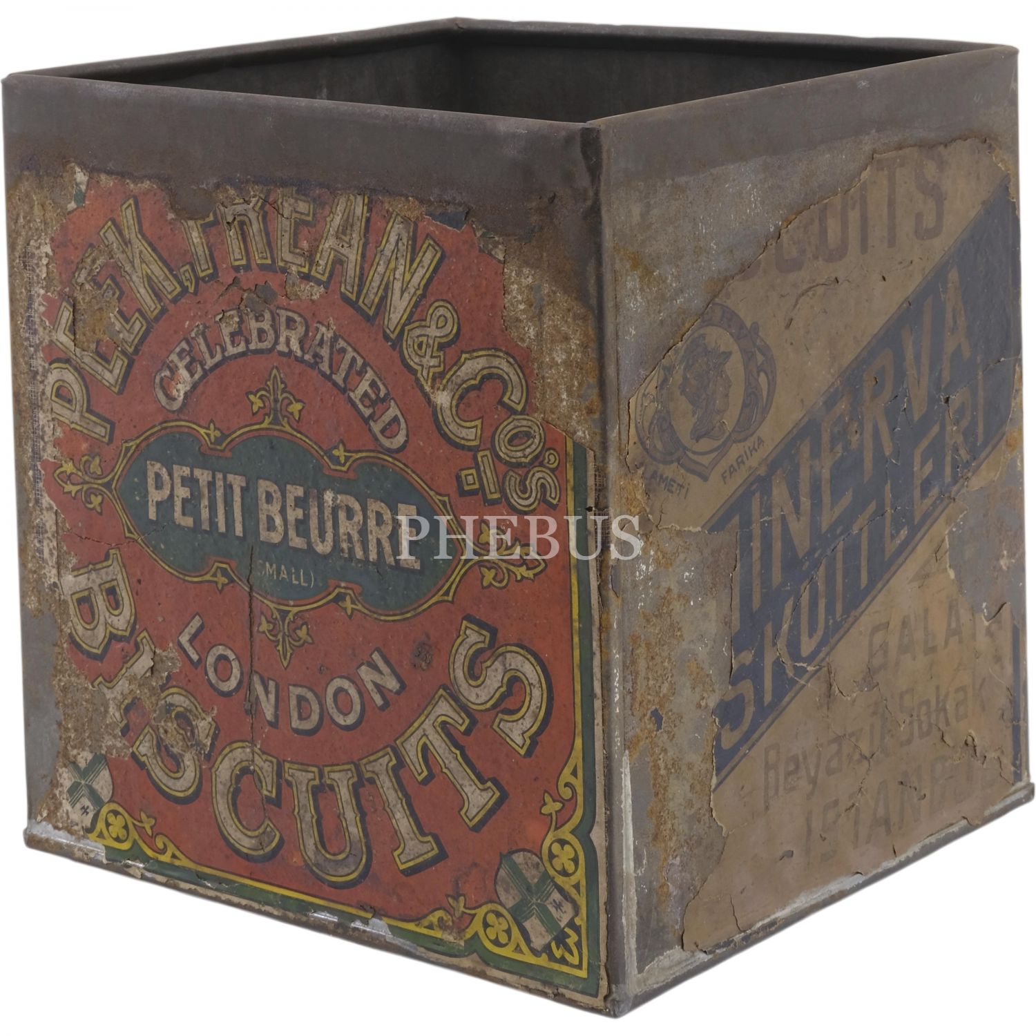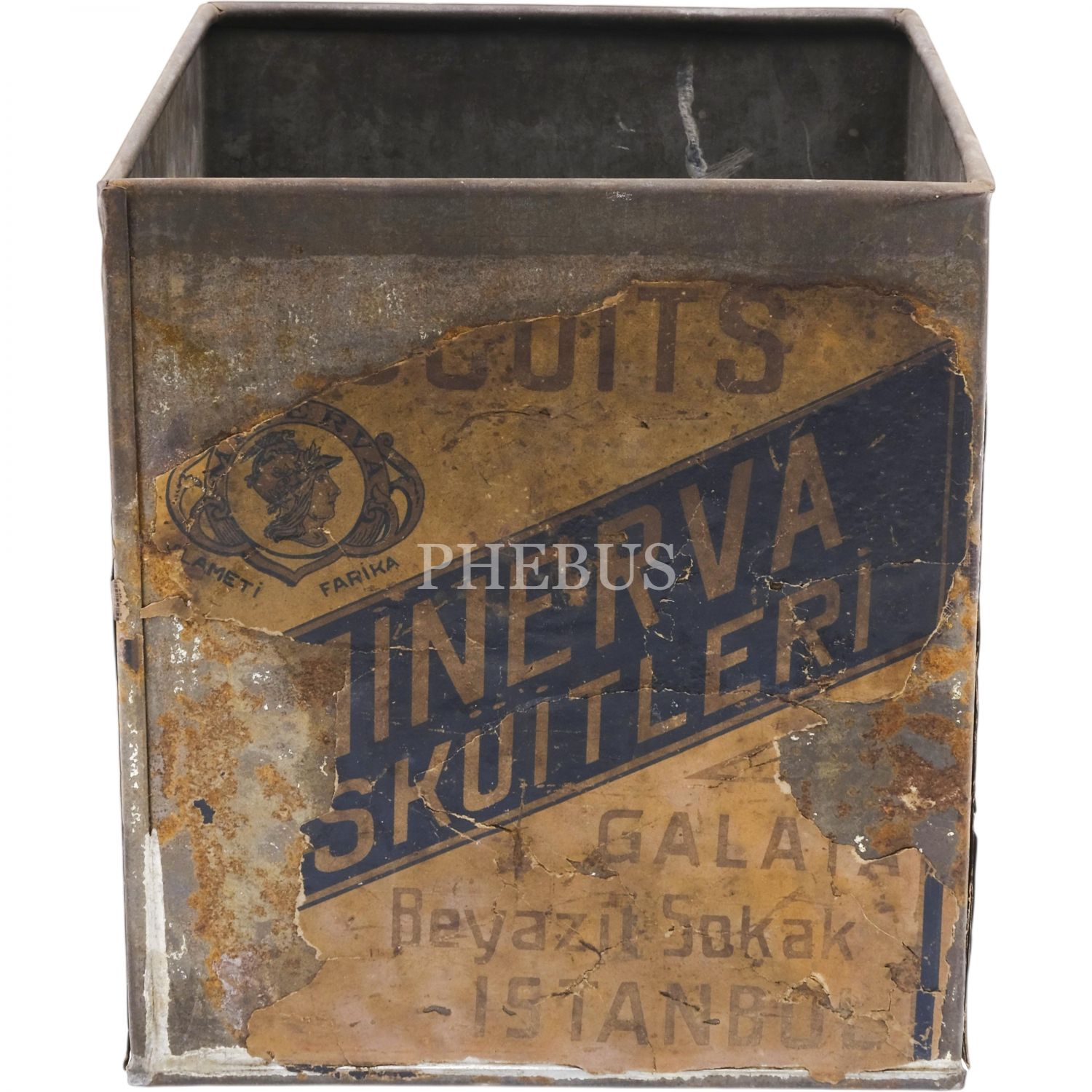 Osmanlı pazarı için ithal edilmiş, dört bir köşesinde dönemin meşhur bisküvi markalarının reklamlarının yer aldığı teneke kutu, 23x22x24 cm...