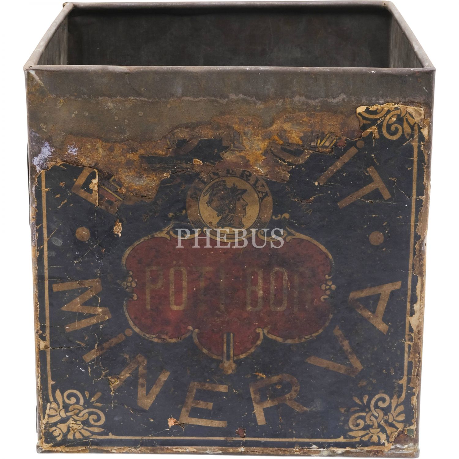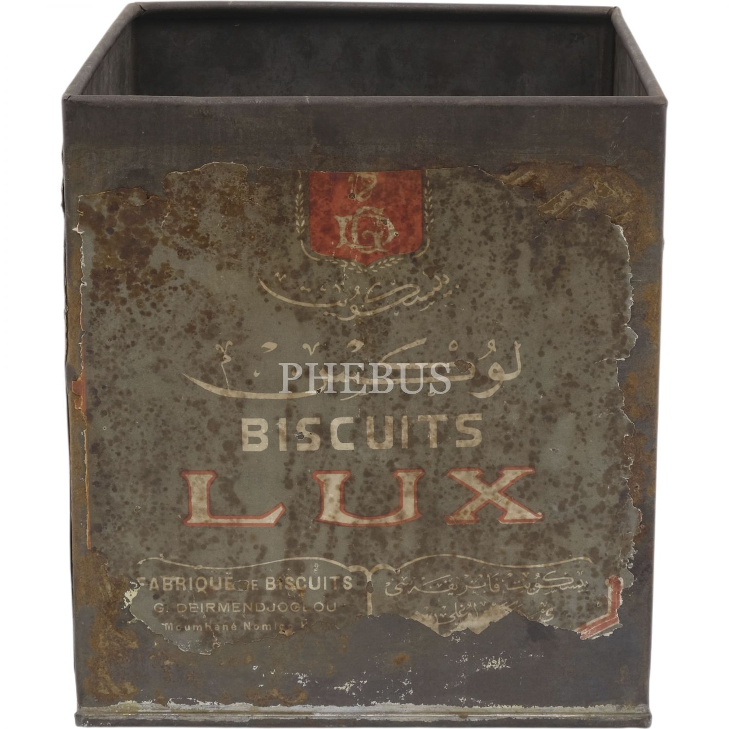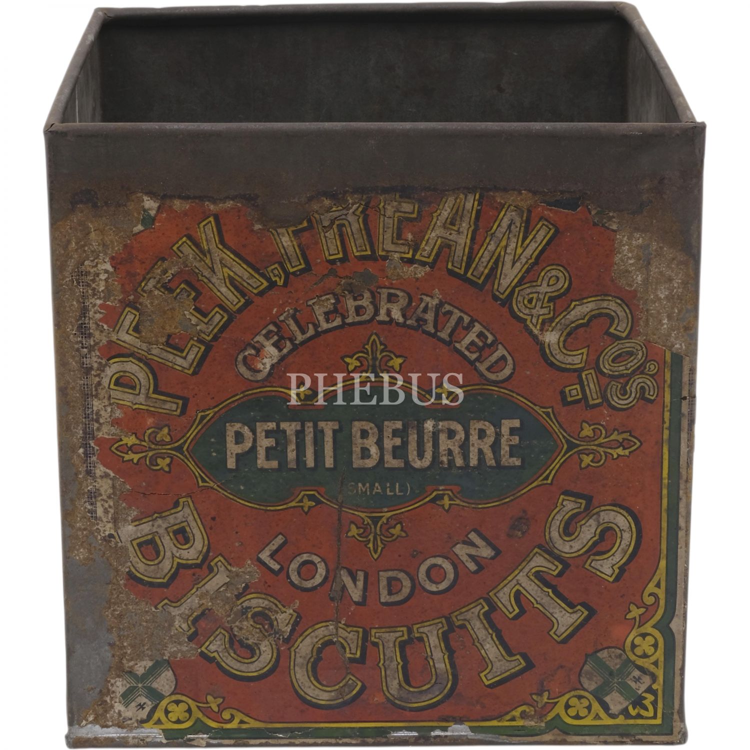 Osmanlı pazarı için ithal edilmiş, dört bir köşesinde dönemin meşhur bisküvi markalarının reklamlarının yer aldığı teneke kutu, 23x22x24 cm...