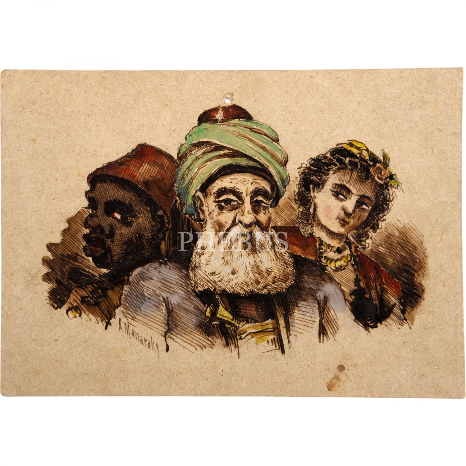 İstanbullu Rum ressamlardan A. J. Manaraky (Manarakis) tarafından çizilmiş Osmanlı tipleri, ıslak imzalı, kâğıt üzerine karışık teknik, 20x14 cm...