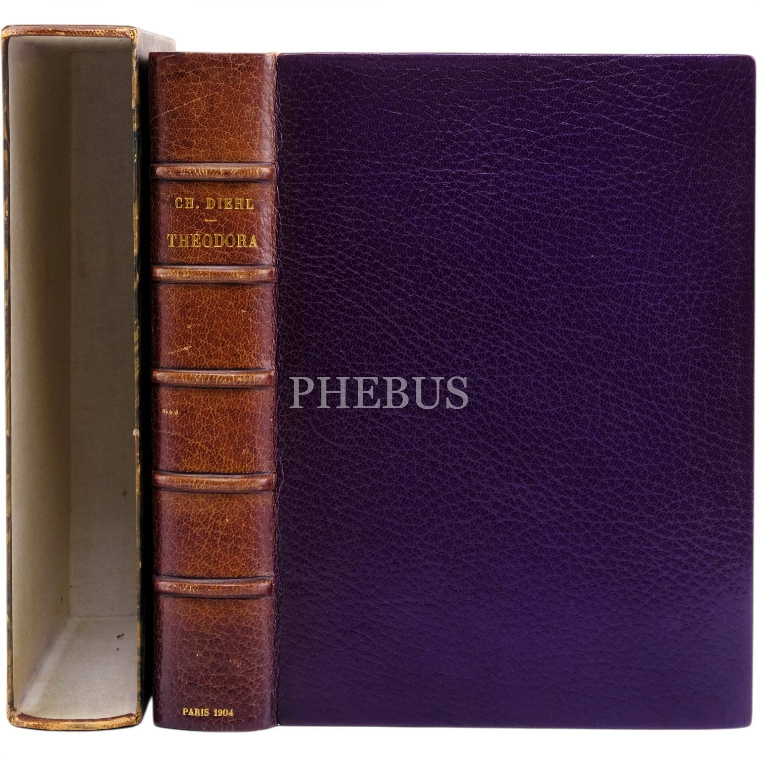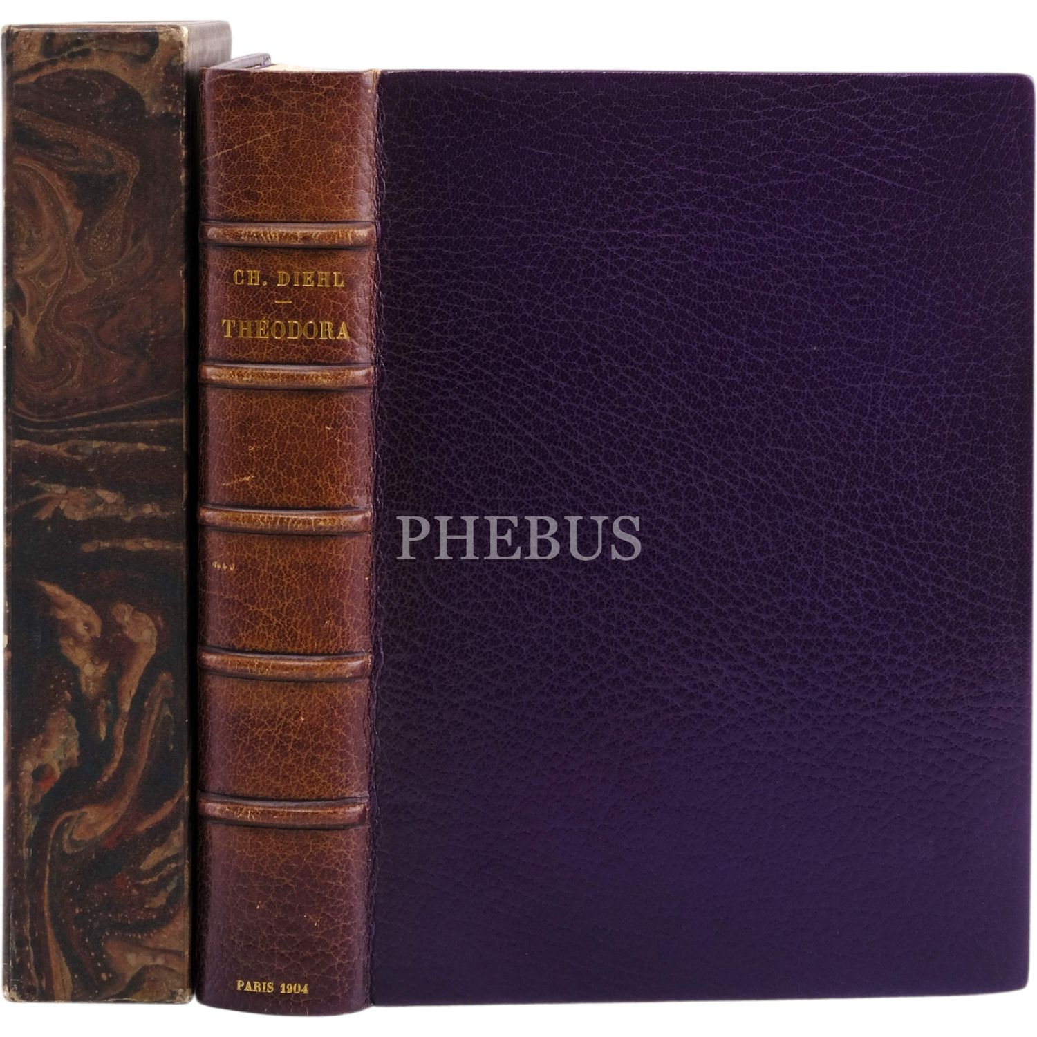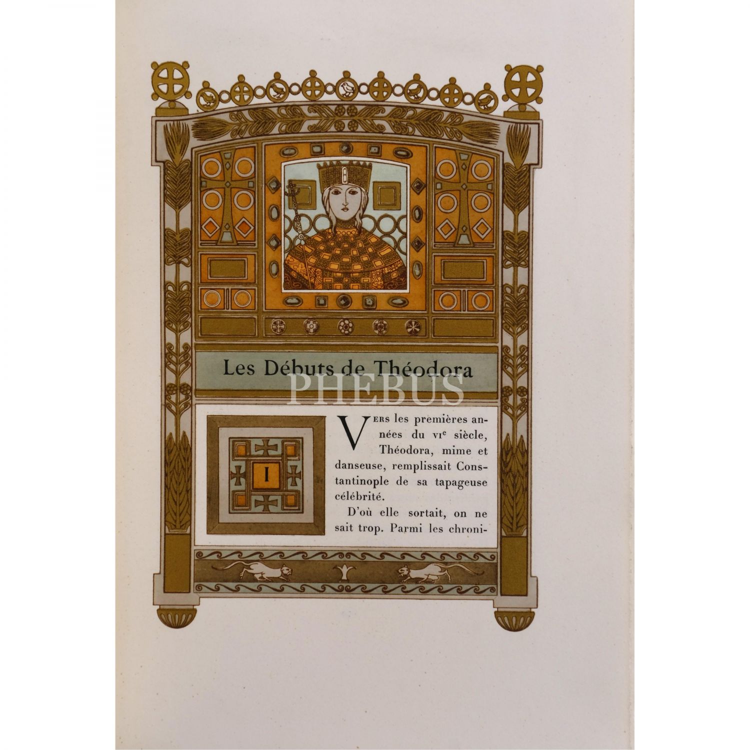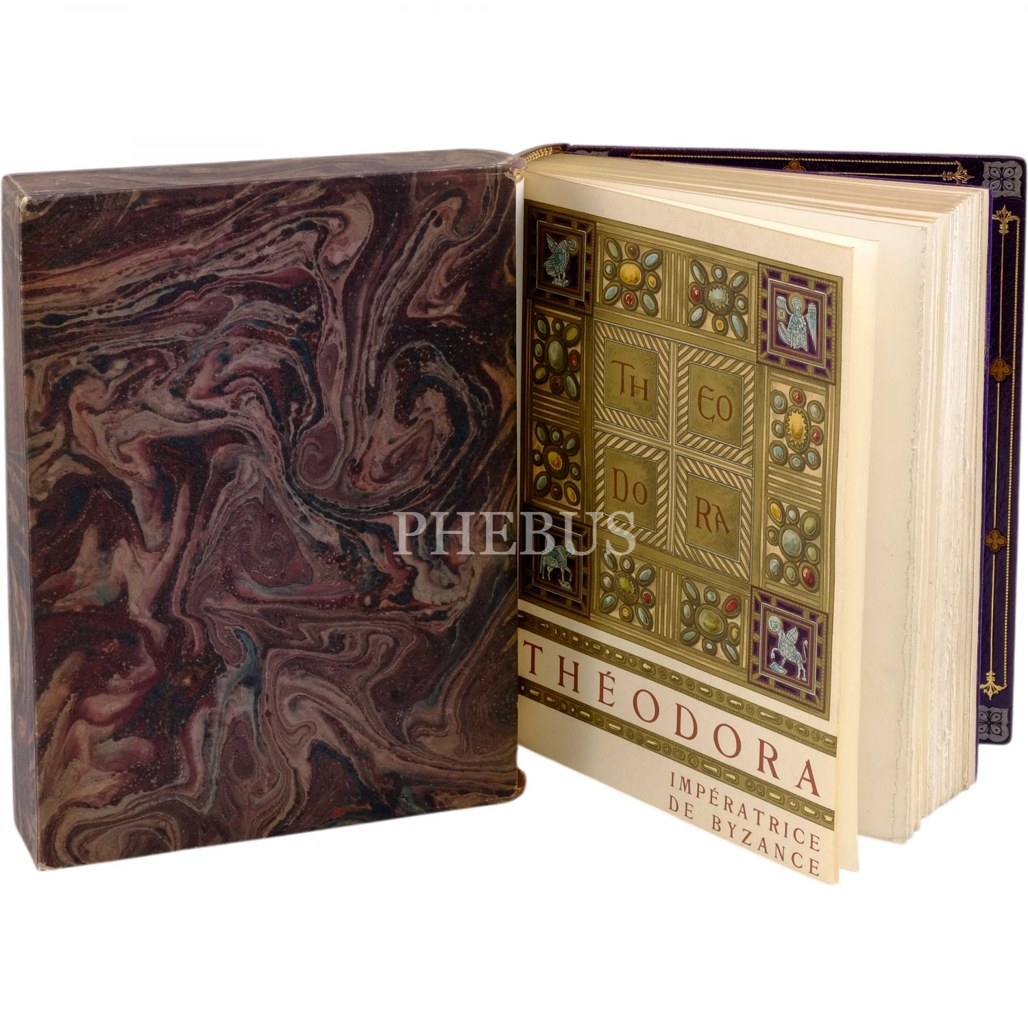 Bizans sanatı ve tarihi üzerine çok sayıda çalışmaya imza atan Fransız tarihçi ve Bizantolog Charles Diehl´ın (1859-1944), Bizans İmparatoru I. Justinianus´un, Bizans tarihinin en ilginç figürlerinden biri olan eşi Theodora üzerine kaleme aldığı eserinin, sınırlı sayıda basılmış özel nüshası... Tarihi, sanatsal ve koleksiyon değerleri açısından önemli bir edisyon olan kitapta, Manuel Orazi imzalı çok sayıda gözalıcı renkli resim yer almaktadır. Blanchet Kardeşler ve Kleber tarafından el yapımı, yüksek kaliteli velim kâğıda basılmış ve 41´den 300´e kadar numaralandırılmış 260 kopyanın 268 numaralı nüshası... Sırtı panelli ve altın yaldız başlıklı, iç kapakları altın yaldız tezyinatlı ve mor kadife kaplı, giriş ve bitiş sayfaları ebru desenli deri cildinde. Ebru desenli özel kutusuyla birlikte.