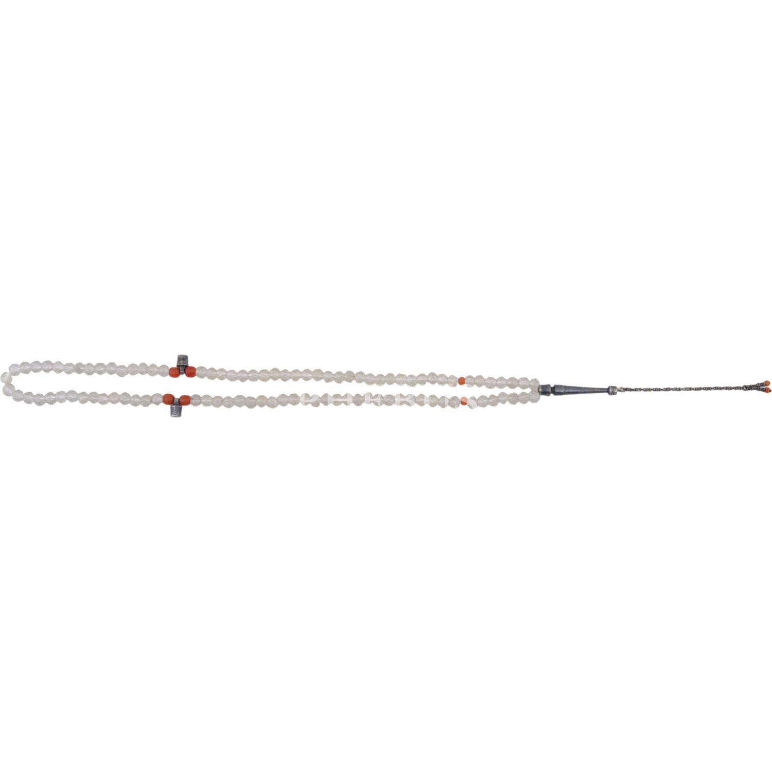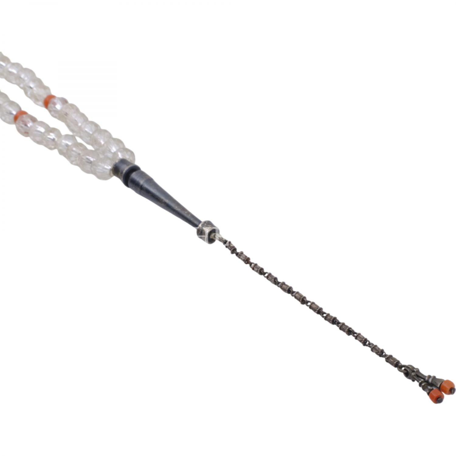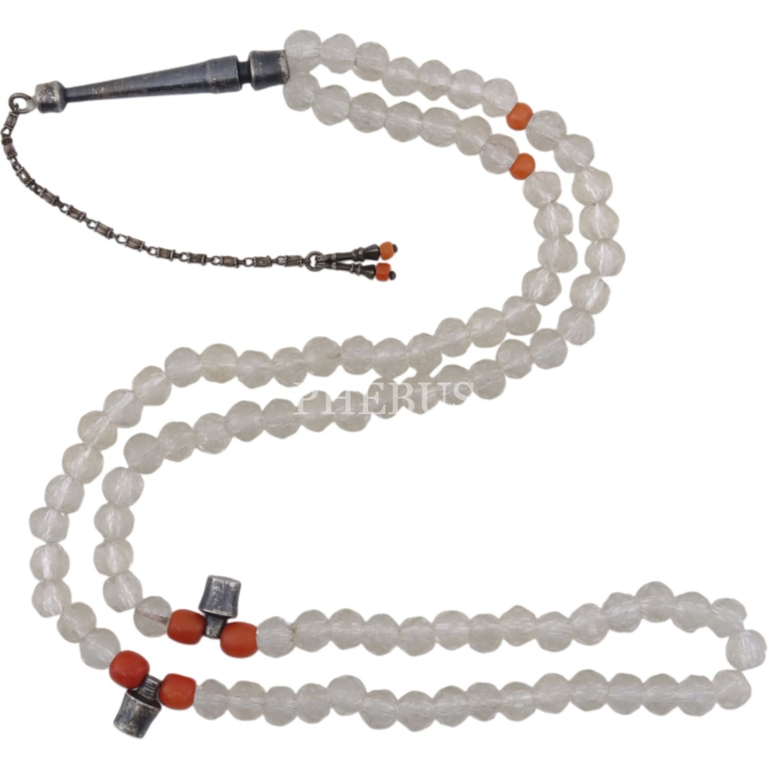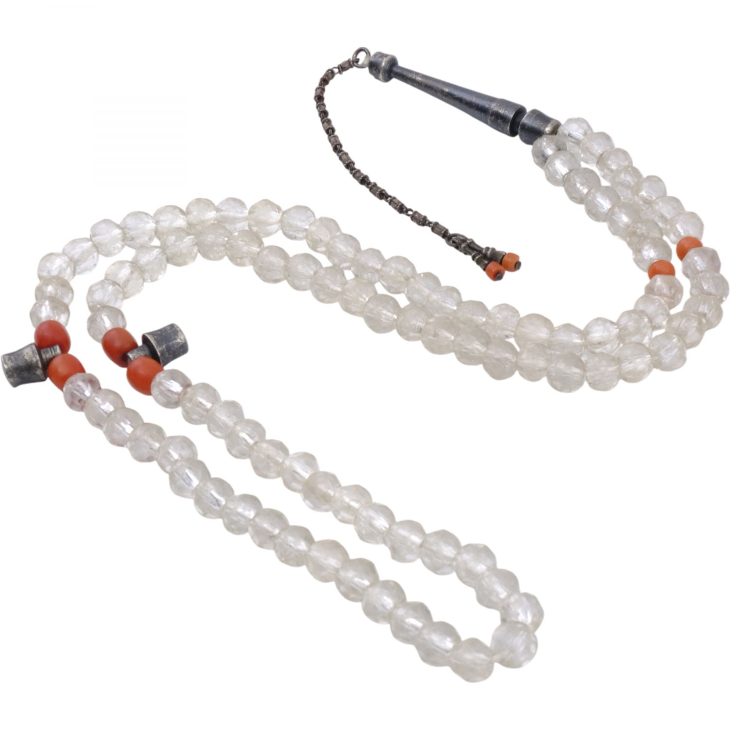Osmanlı döneminden, fasetli necef tespih, imame ve durakları gümüşten mamul, Mevlevi tarzında yapılmış, mercanlarla süslenmiş...