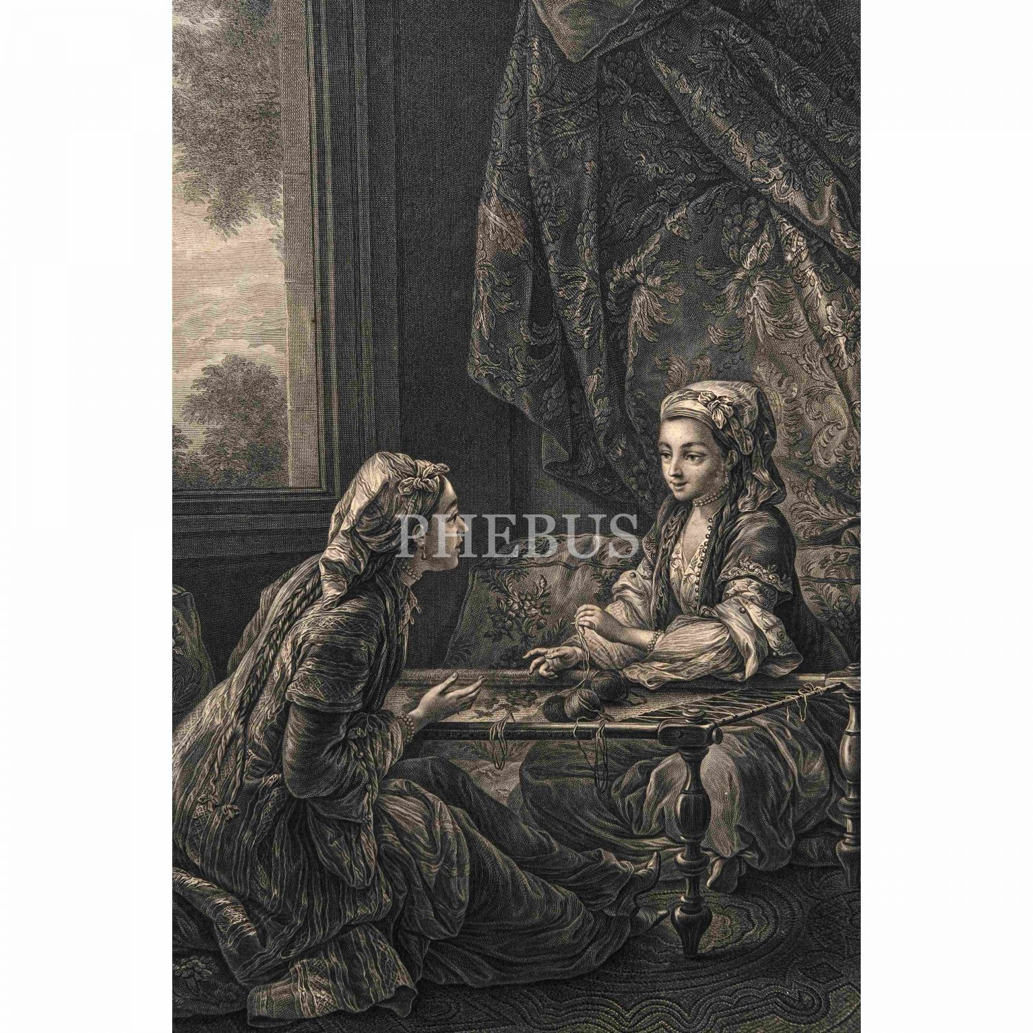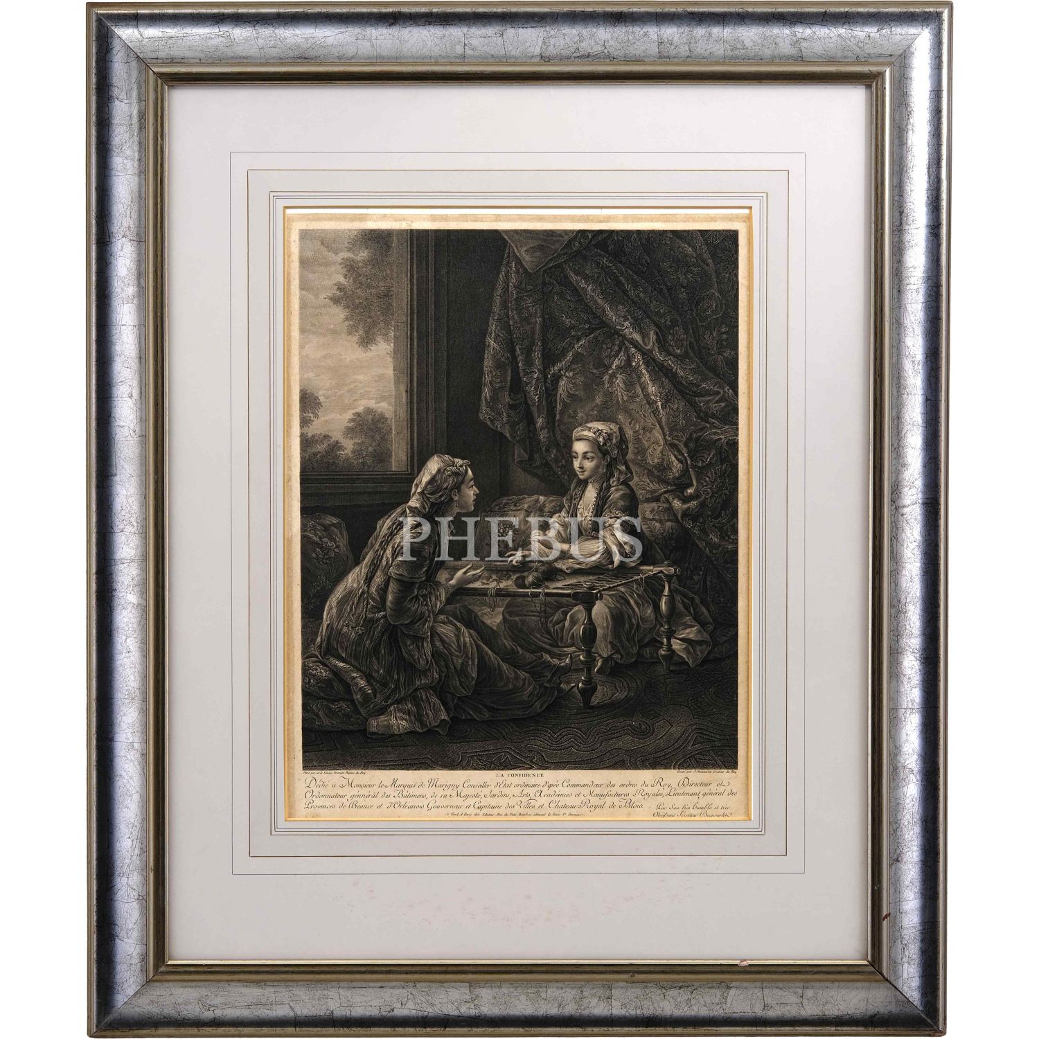 18. yüzyılın ikinci yarısından, Fransa Kralı XV. Louis´in en ünlü gözdesi Madame de Pompadour´un, Fransız ressam Charles-André van Loo tarafından bir Türk sultanı olarak resmedildiği tablonun, J. Beauvarlet tarafından "La Confidence" (Gizli Konuşma / Sır) başlığıyla gravür haline getirilmiş edisyonu, "Peint par Carle Venloo premier peintre du Roy / Gravé par J. Beauvarlet Graveur du Roy", gravür 38x49 cm, çerçeve 70x84 cm...