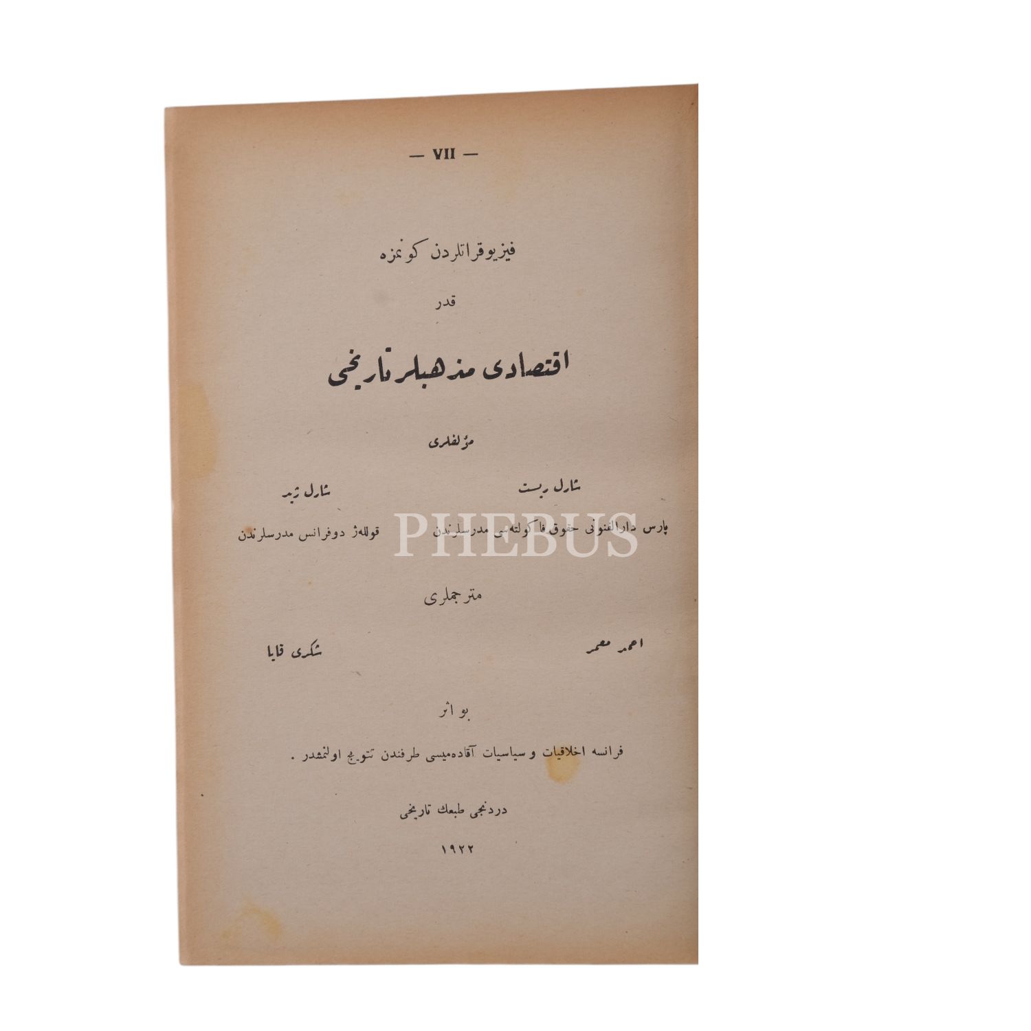 FİZYOKRATLARDAN GÜNÜMÜZE KADAR İKTİSÂDÎ MEZHEPLER TARİHİ, 1. cilt, Charles Rist - Charles Gide, çeviren: Şükrü Kaya, 1341, Cumhuriyet Matbaası, 423 sayfa, 16x24 cm...