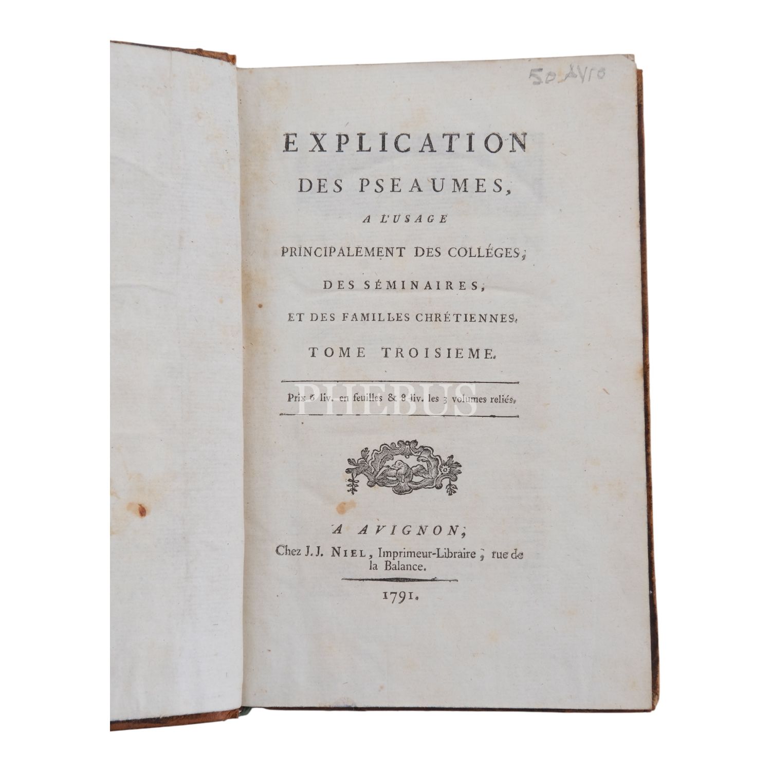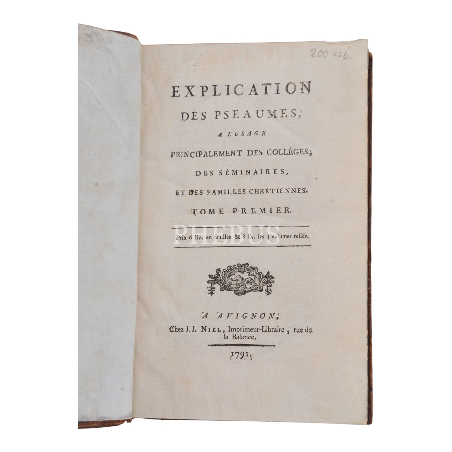 EXPLICATION DES PSEAUMES A L´USAGE PRINCIPALEMENT DES COLLEGES DES SEMINAIRES ET DES FAMILLES CHRETIENNES (1 ve 3. Cilt), 1791, J. J. Niel, Impremeur - Libraire (Avignon), 14x20 cm..