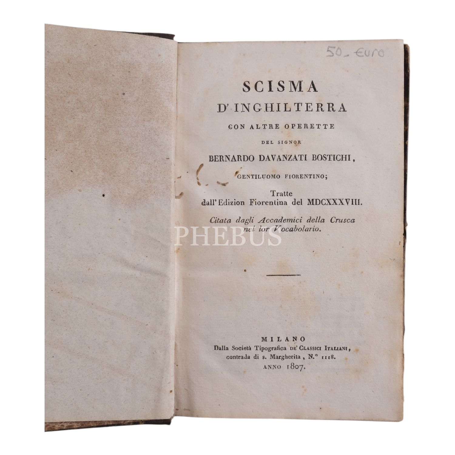 SCISMA D´INGHILTERRA, Barnardo Davanzati Bostichi, 1807, Dalla Societa Tipografica de Classici Italiani (Milano), 290 sayfa, 12x18 cm...