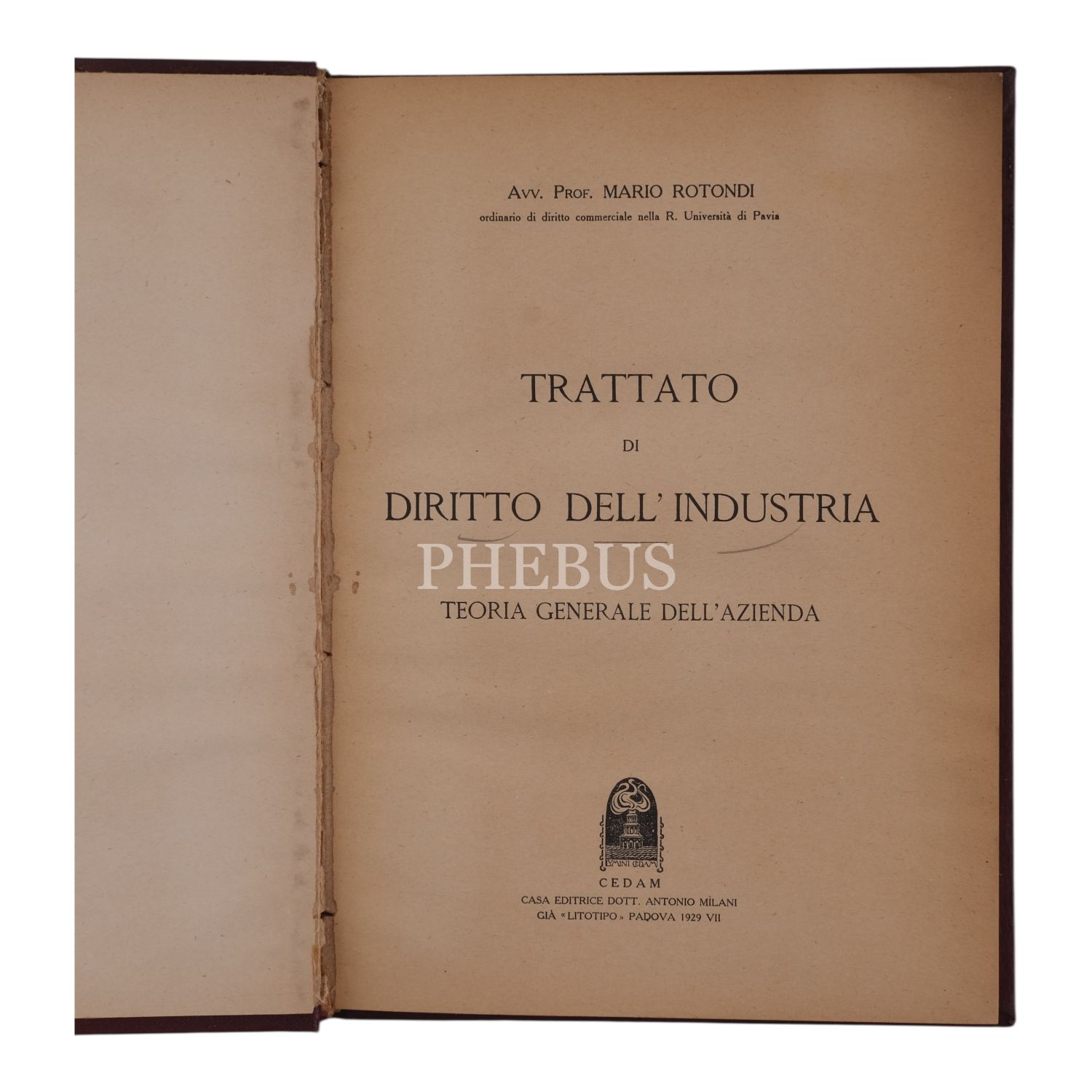TRATTATO DI DIRITTO DELL´INDUSTRIA, Mario Rotondi, 1929, Casa Editrice Dott. Anonıo (Milano), 187 sayfa, 18x24 cm...