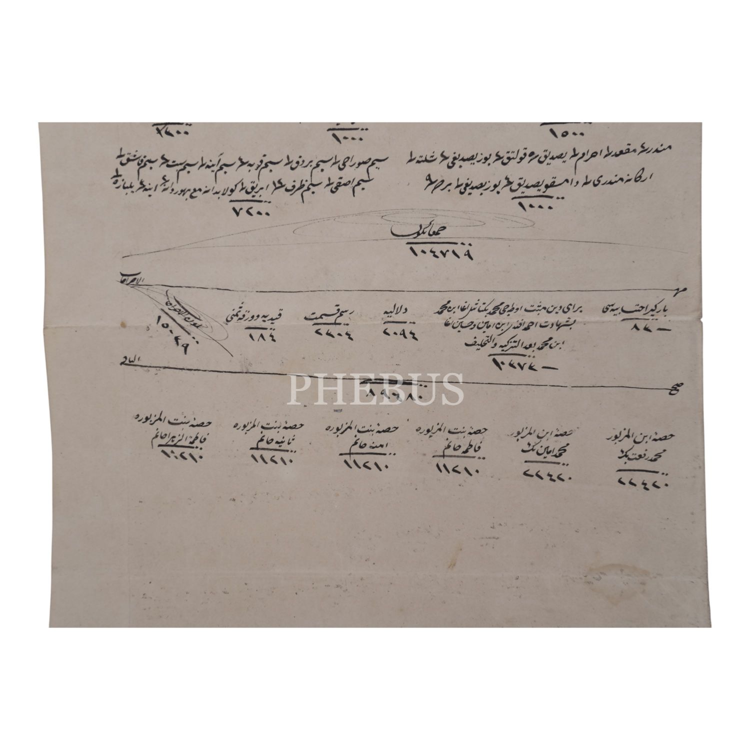 Müteveffa paşanın terekesinin dökümü ile dul eşi, dört kızı bir oğlundan oluşan çocuklarının hisselerini gösteren kassam belgesi.