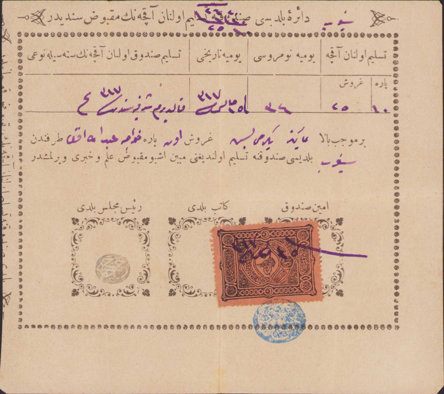 Sinop Beldesi Sandığı'na teslim edilen makbuz, 1900 tarihli