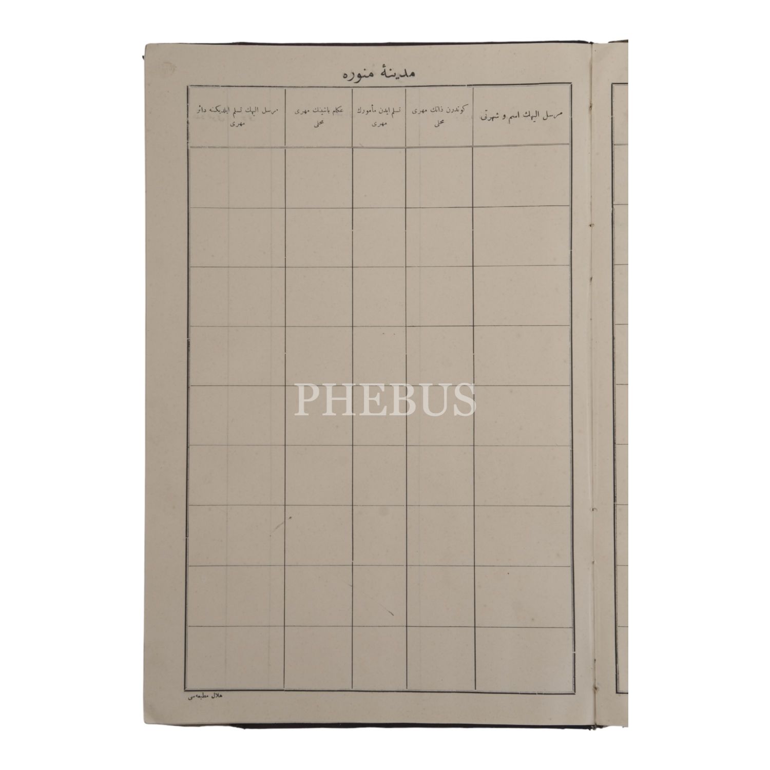 Her sene sürre alayı ile Mekke ve Medine´ye gönderilen eşyâ ve hediyelerin kaydının tutulduğu defter. Sütun başlıklarında gönderilen, gönderen, teslim eden memur, akkâm başı mührü ve teslim alanın mührü için yerler ayrılmıştır. Deftere kayıt girilmemiştir. İlk sayfalarda meşk ve dua tarzı karalamalar vardır.