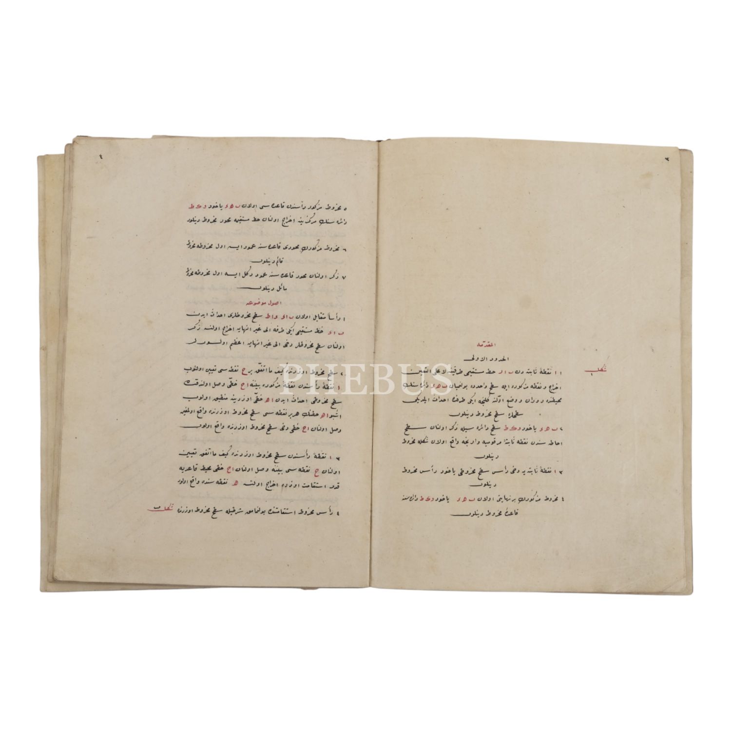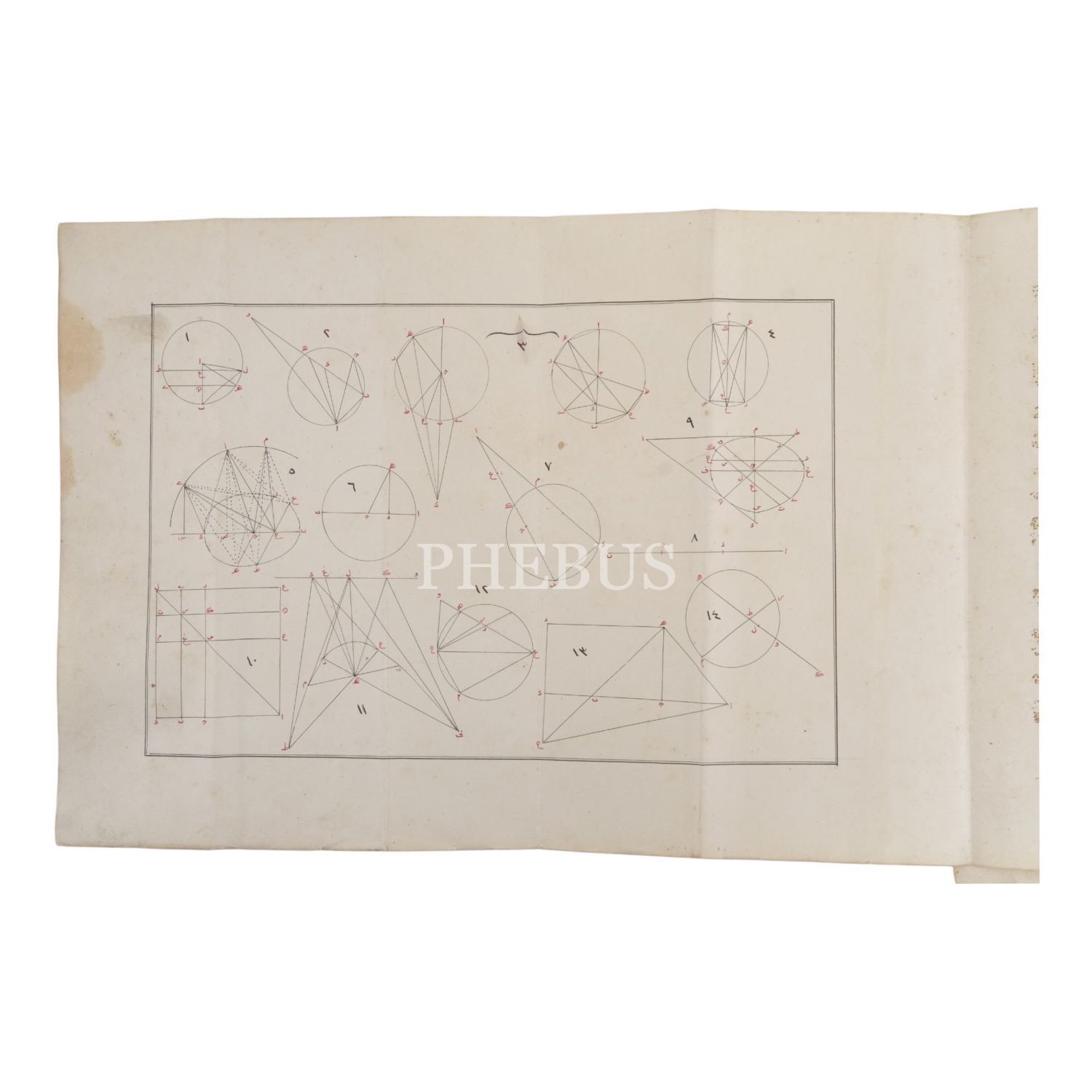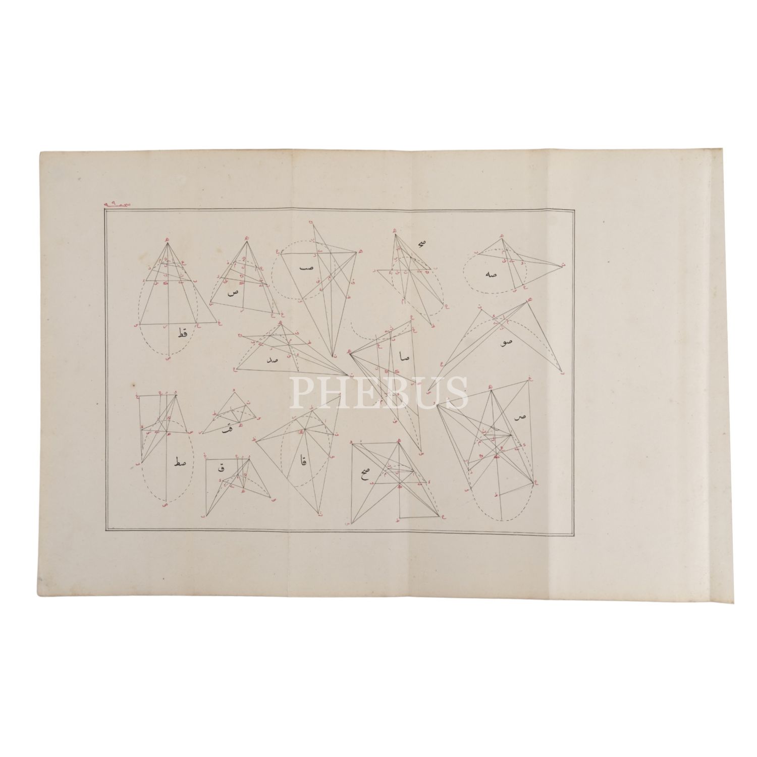 11 adet katlanır geometri çizim kağıdı ve Avrupa ebrulu deri dönem cildinde. Nizami rika hattıyla siyah ve kırmızı mürekkeple yazılmıştır.