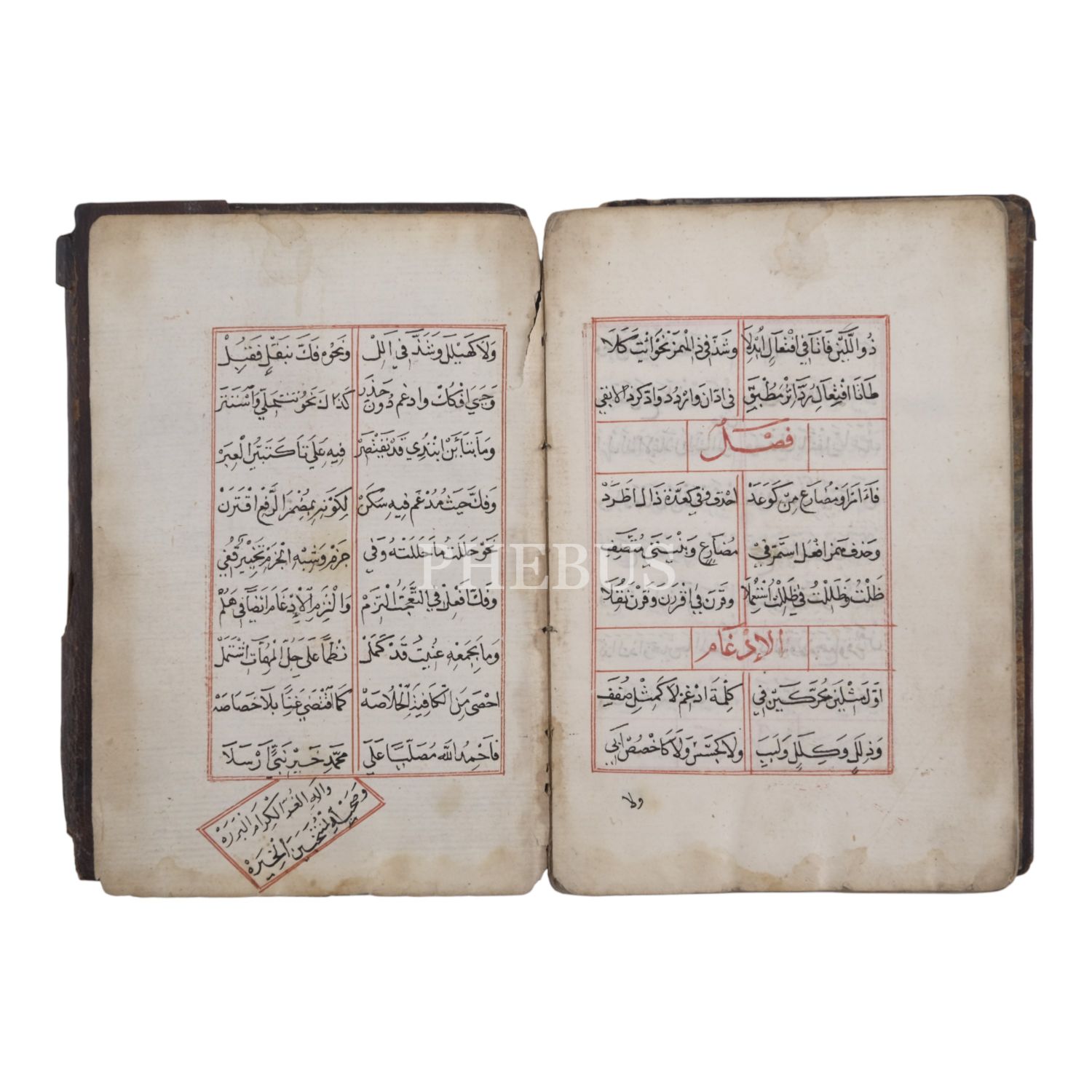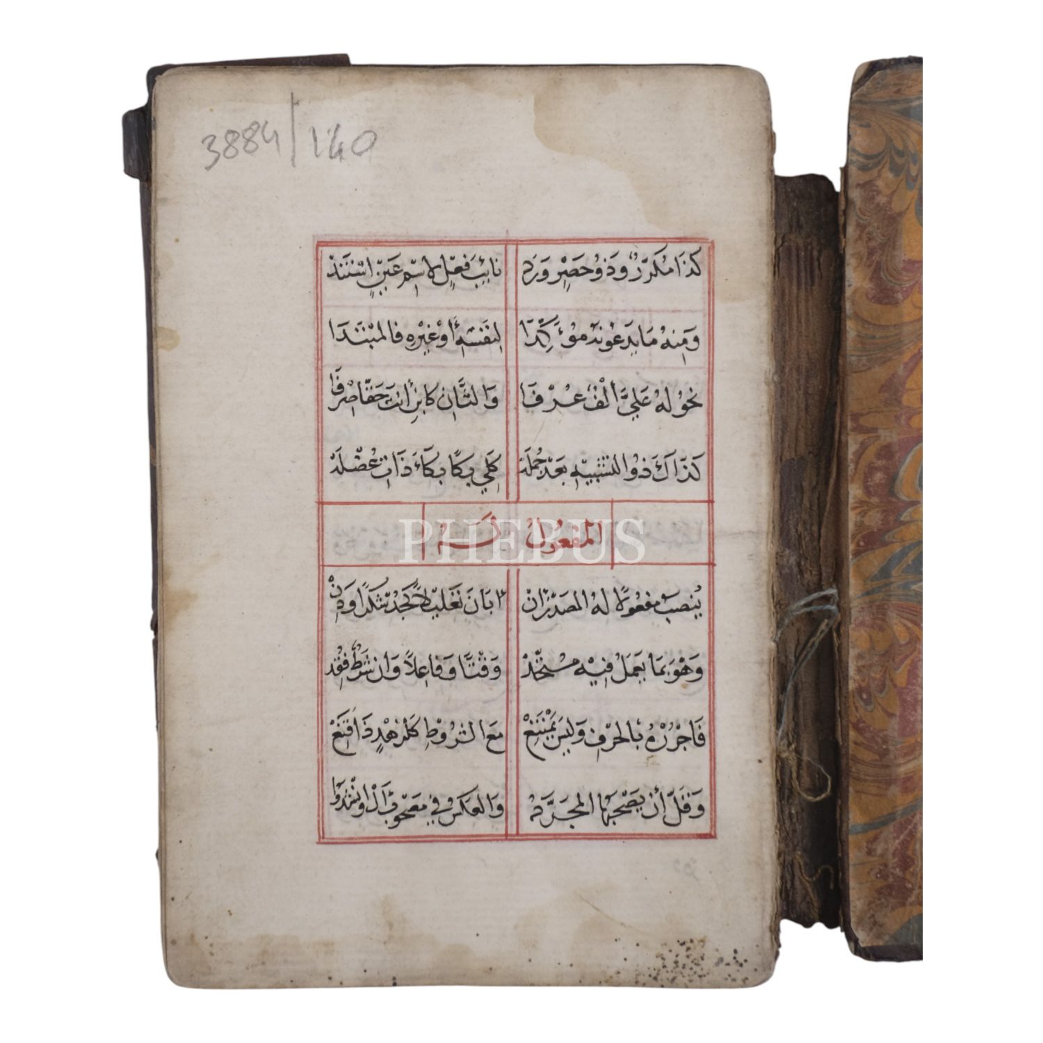 Deri dönem cildinde, mıklebli ve şemseli, iç kapağı eski dönem hatip ebrulu. Medrese metinlerinin başında gelen Elfiyye, yüksek sesle ve nağmeli okunarak ezberlenirdi.