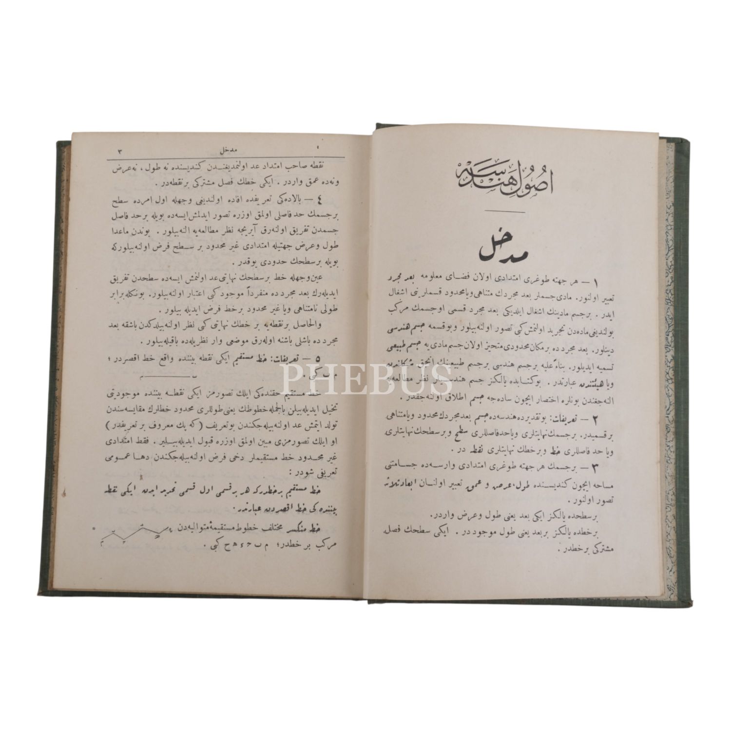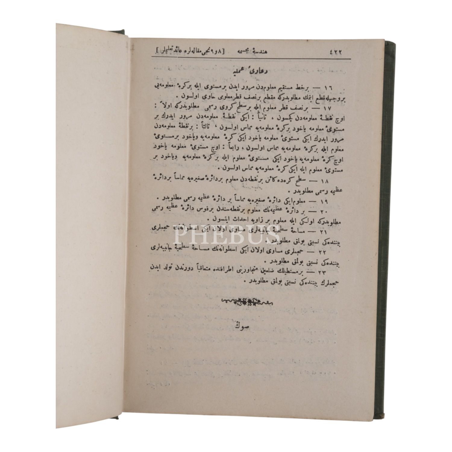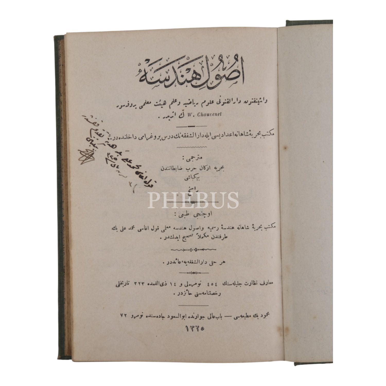 USÛL-İ HENDESE, W. Chauvenet, çeviren: Binbaşı Râsih, 1325, Mahmud Bey Matbaası, 422 sayfa, 14x20 cm...