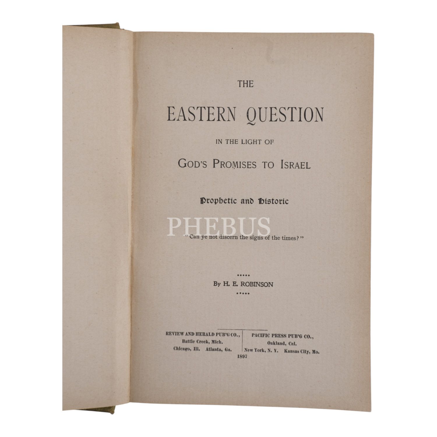 THE EASTERN QUESTION IN THE LIGHT OF GOD’S PROMISES TO ISRAEL PROPHETIC AND HISTORIC, H. E. Robinson, 1897, Review and Herald Pub’G Co, Atlanta, 276 ssayfa, 19x13 cm...